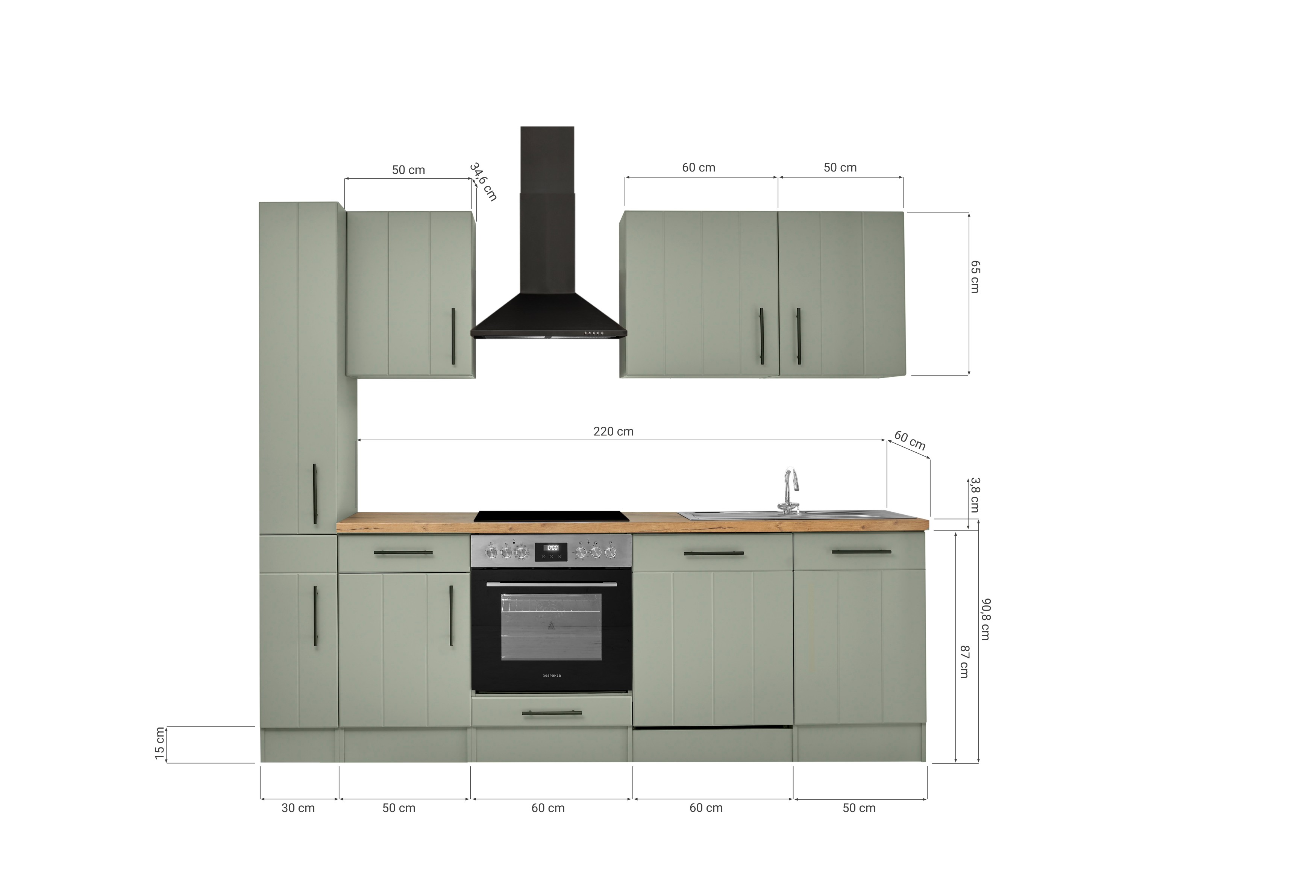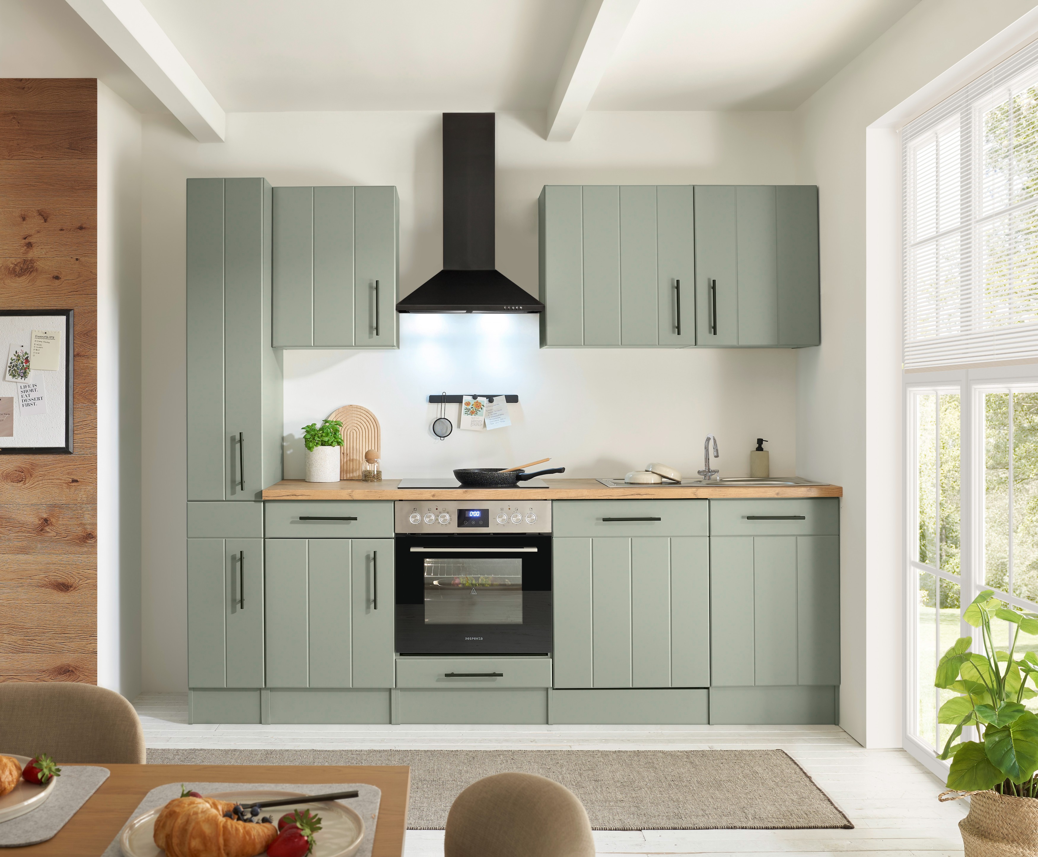 Küchenblock Anton – 250 cm Landhausküche in Schilfgrün ohne Kühlschrank