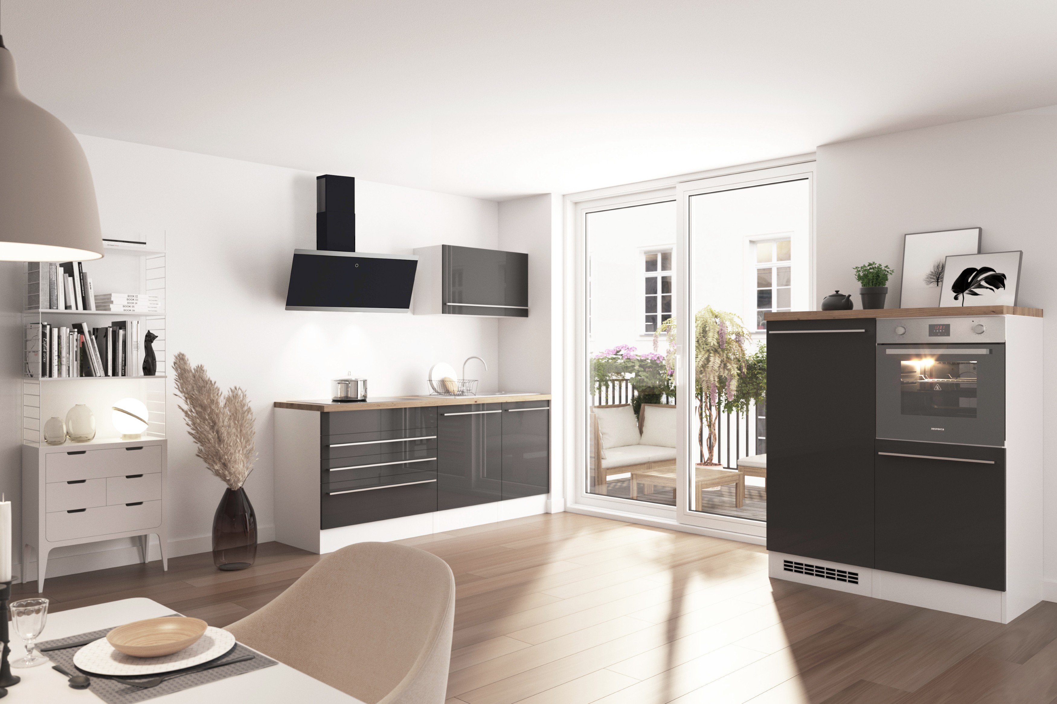 - Inklusive: Vollintegrierter Geschirrspüler 60 cm, Schräghaube 60 cm, autarker Einbaubackofen sowie Induktionskochfeld, Einbaukühlschrank mit 4* Gefrierfach