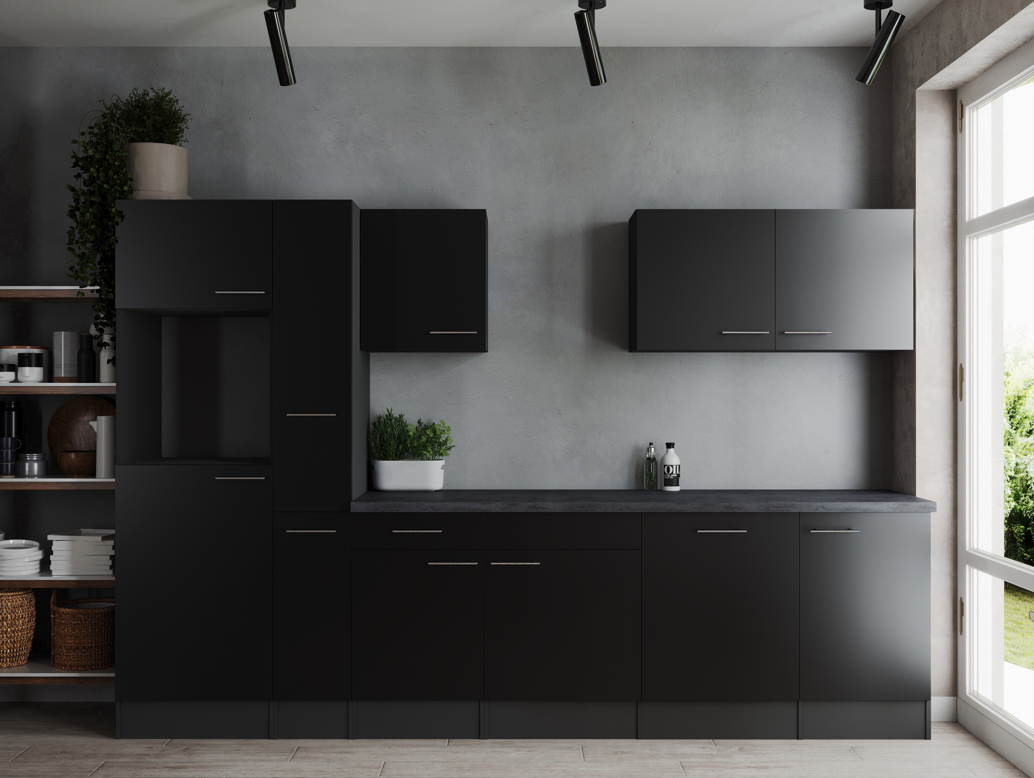 Küche Leerblock Oliver – 310 cm in Schwarz und Granit Optik