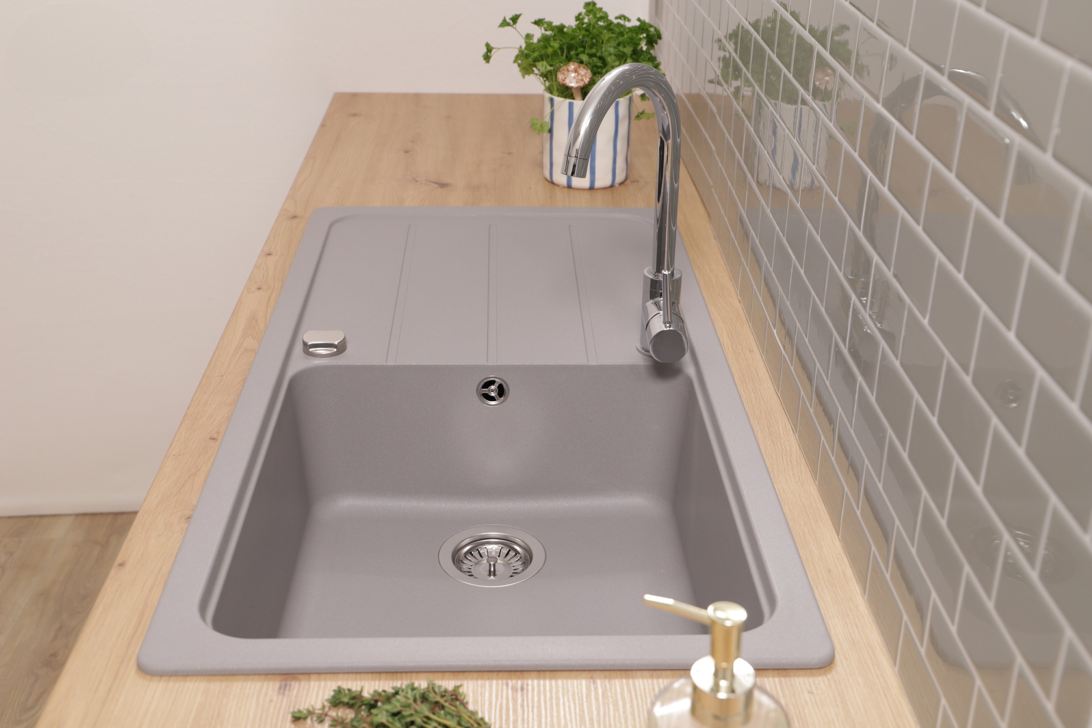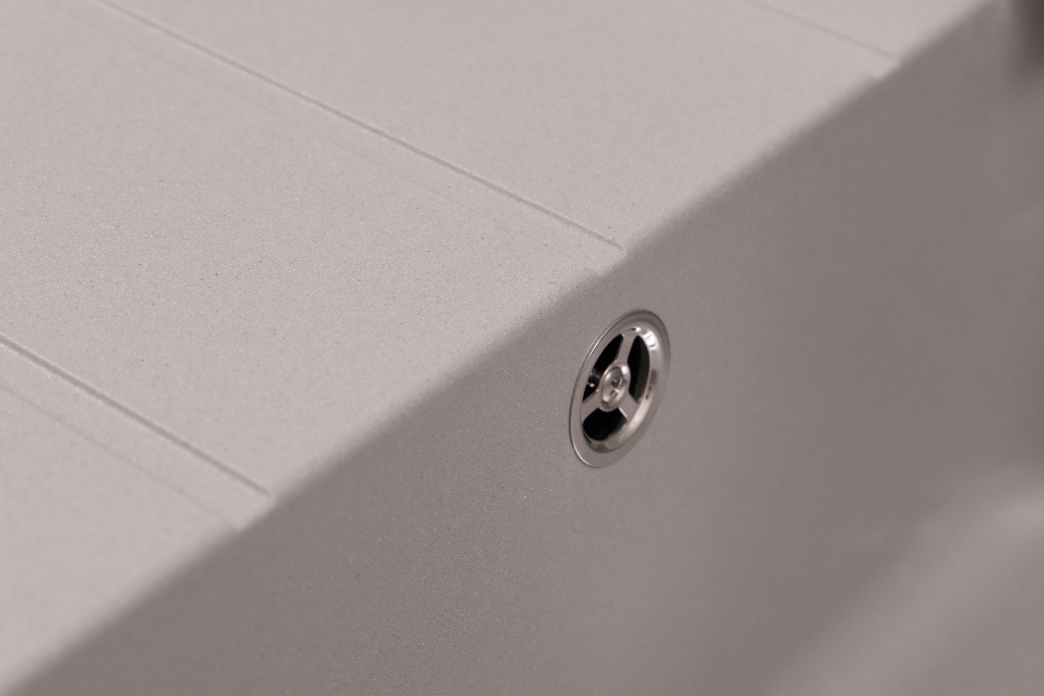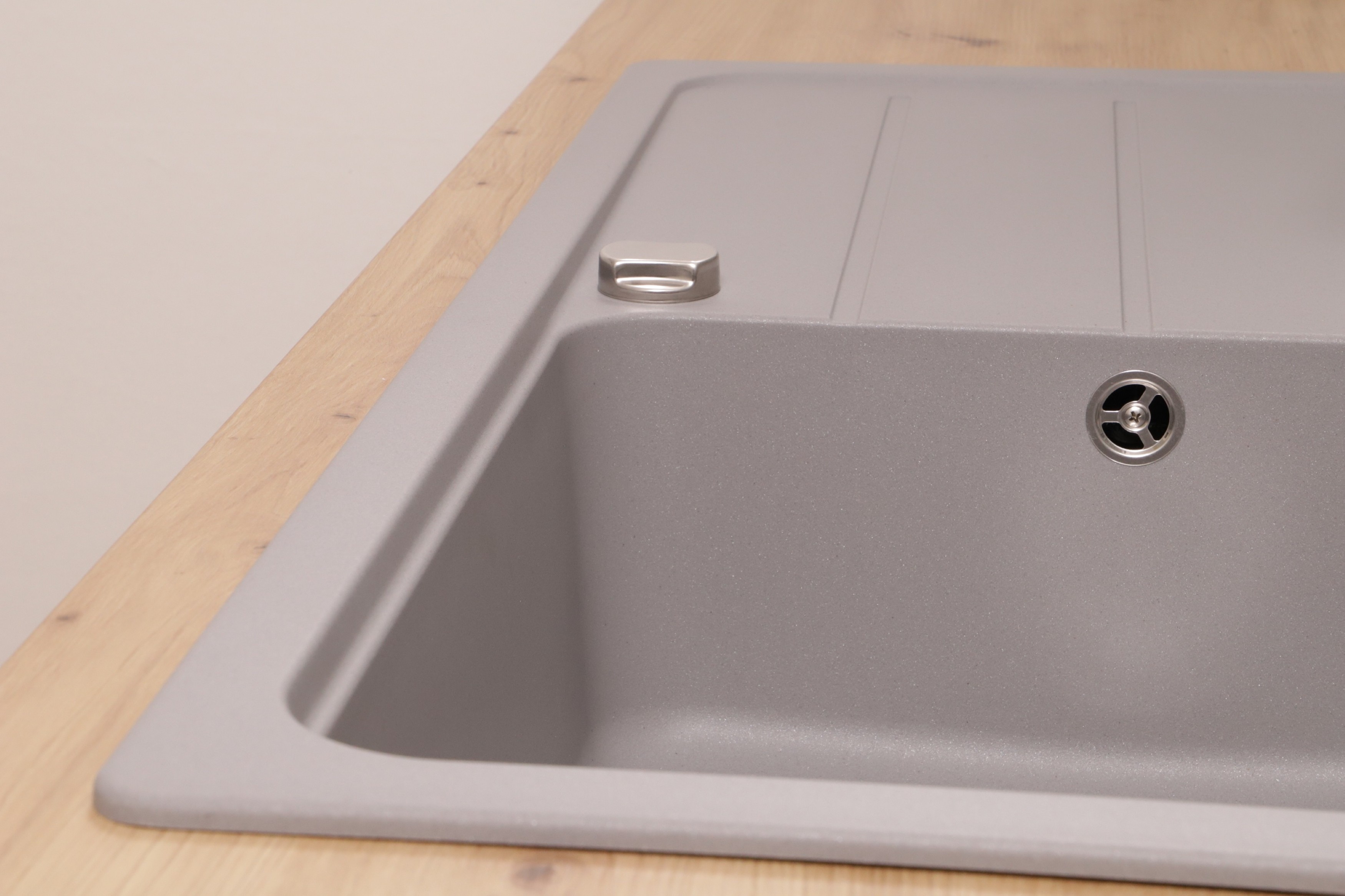 - Langlebiges Material: Die Spüle besteht aus einem Granitverbund-Material, das zu 70 % aus Quarzsand, zu 26 % aus Kunstharz und zu 4 % aus Additiven besteht. Diese Zusammensetzung sorgt für eine außergewöhnliche Beständigkeit gegen Kratzer, Stöße und aggressive Chemikalien.