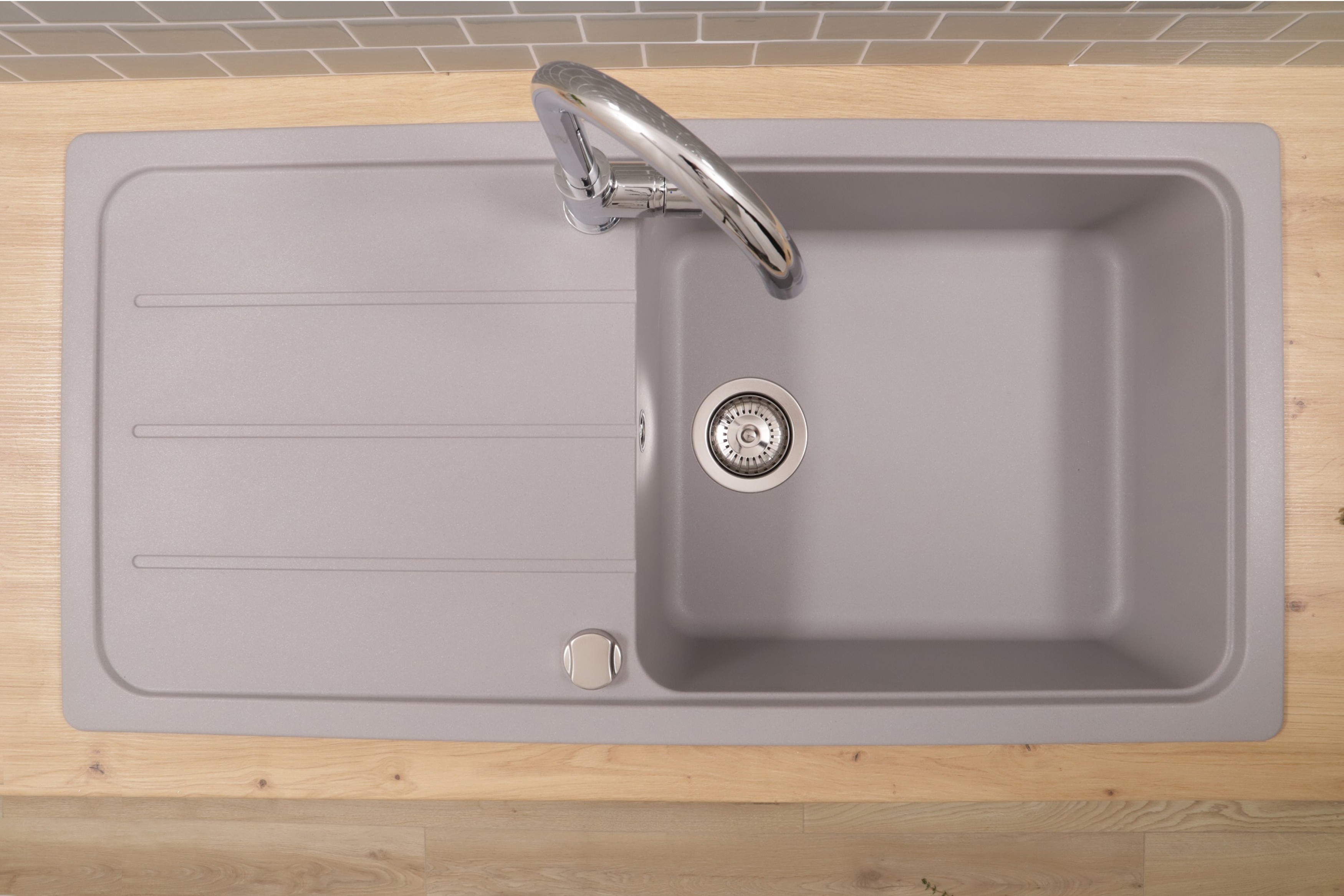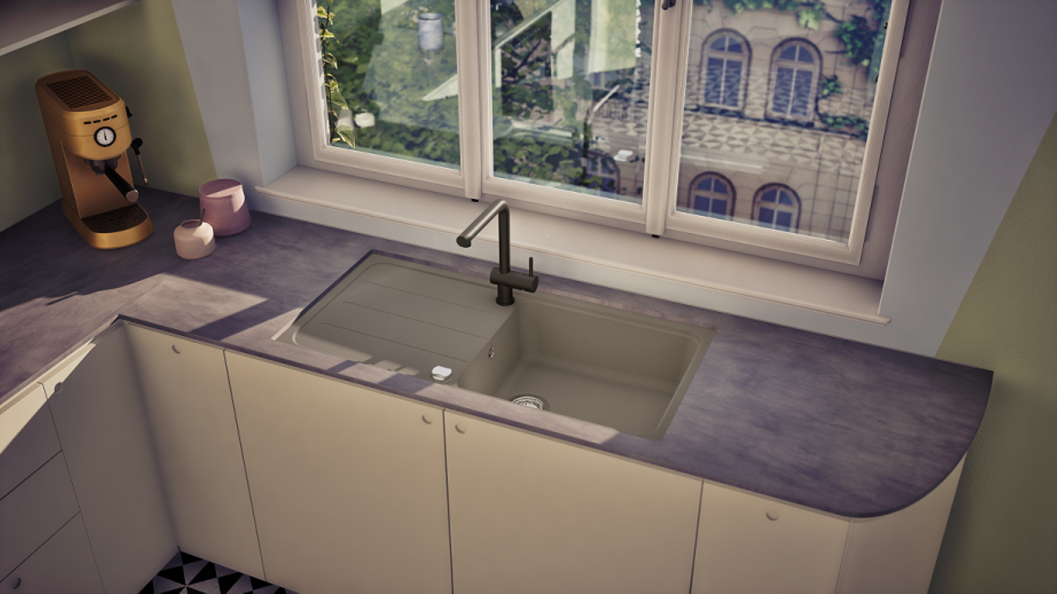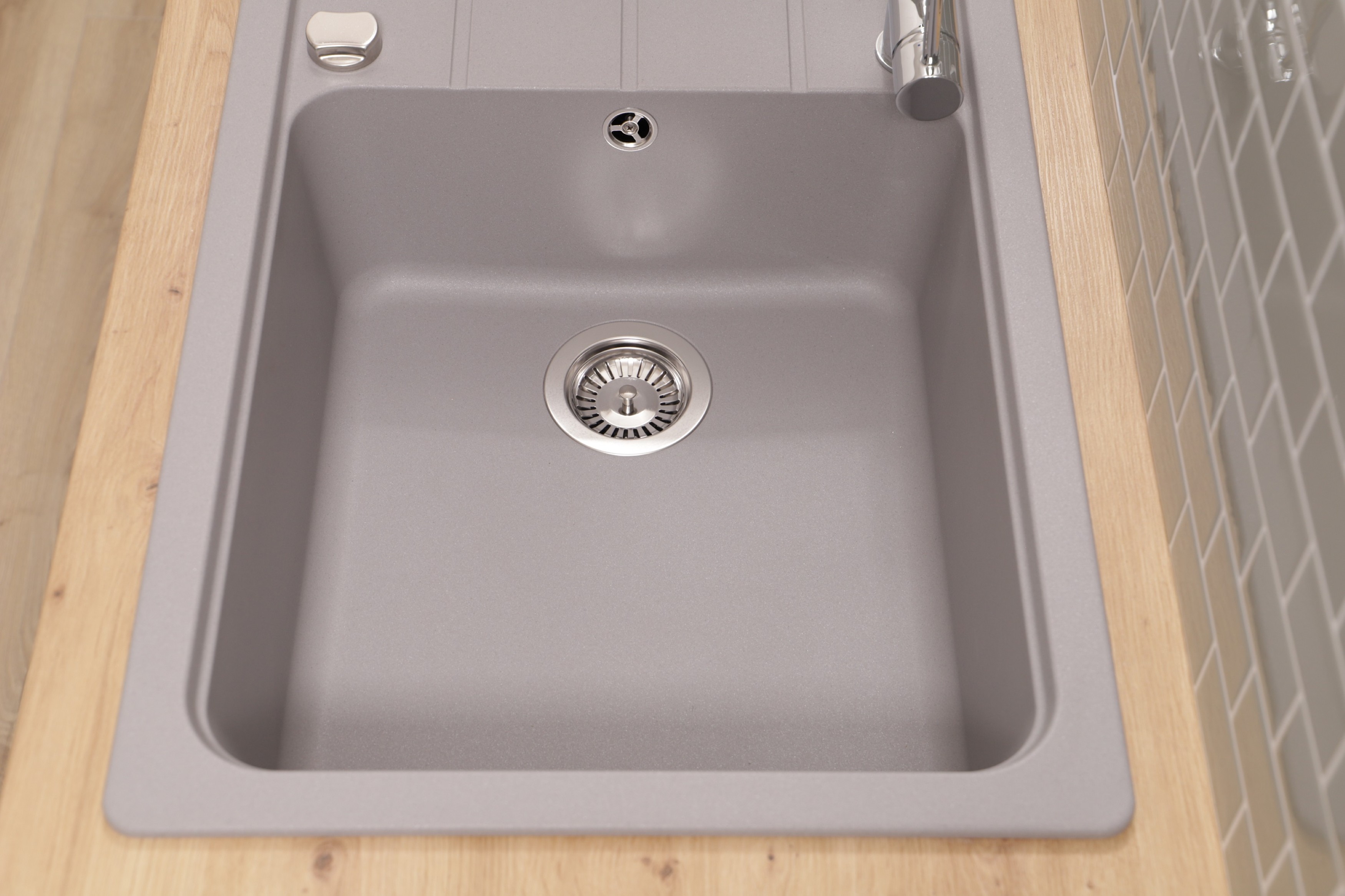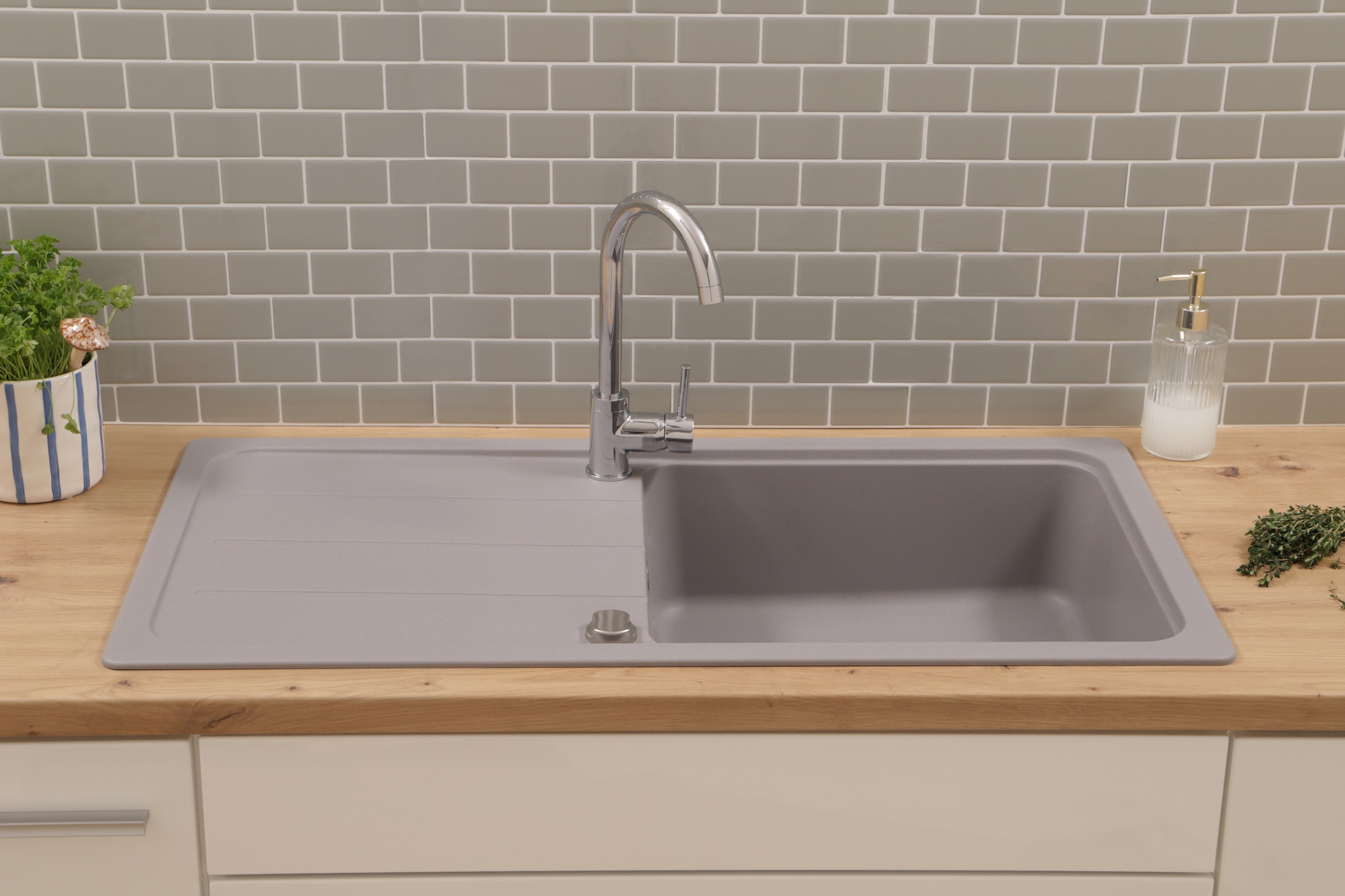 - Langlebiges Material: Die Spüle besteht aus einem Granitverbund-Material, das zu 70 % aus Quarzsand, zu 26 % aus Kunstharz und zu 4 % aus Additiven besteht. Diese Zusammensetzung sorgt für eine außergewöhnliche Beständigkeit gegen Kratzer, Stöße und aggressive Chemikalien.