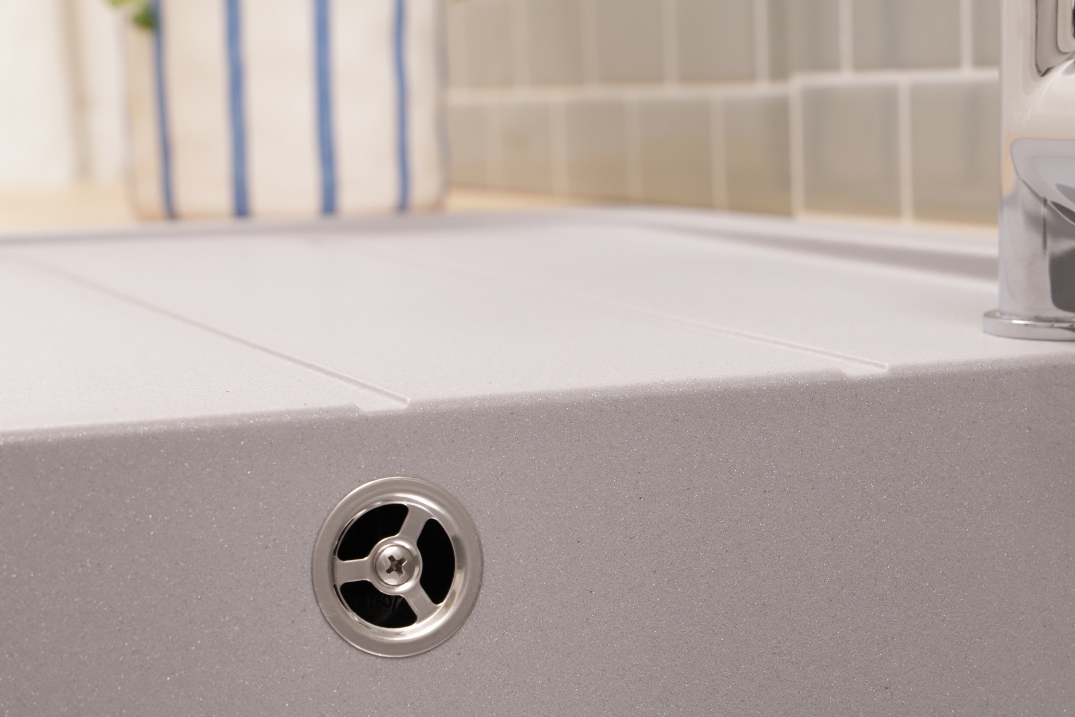 - Einfach zu reinigen: Durch einen umlaufend erhöhten Rand wird das Wasser im Spülbereich gehalten und die abgeschrägte Abtropffläche mit integrierten Abtropfrillen verhindern die Ansammluch von Wasser. Zudem erleichtern die Ecken mit großen Radien zusätzlich die Reinigung