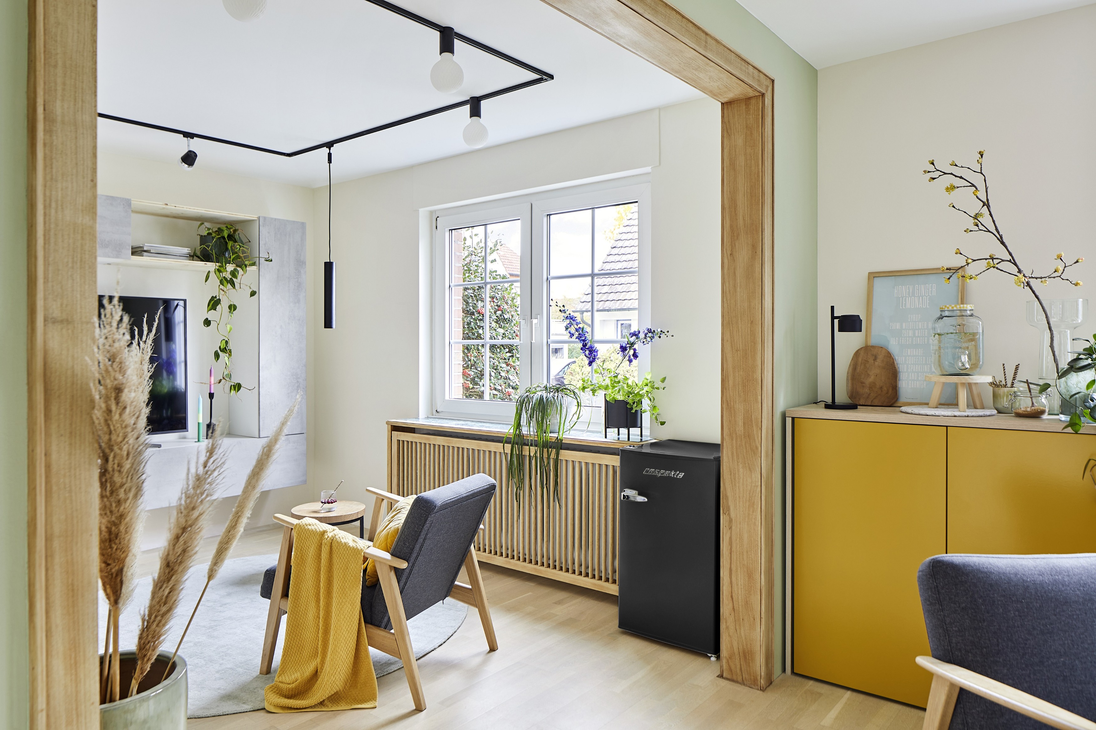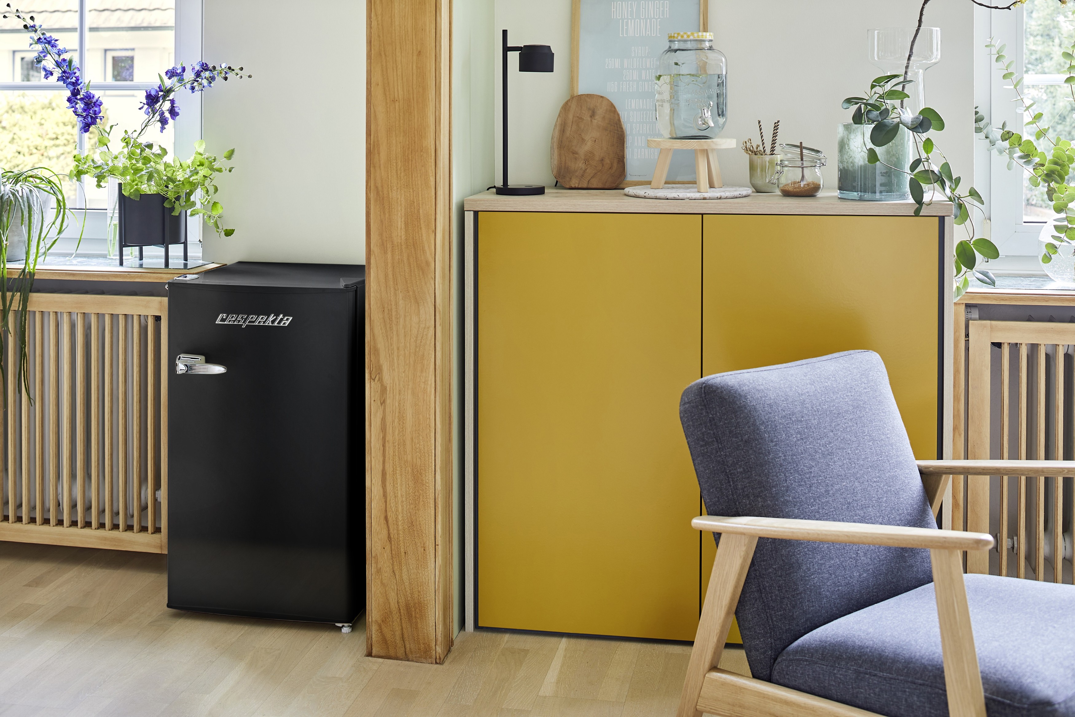 Erhältlich in drei Farben – Rot, Schwarz und Cream - lässt sich die Retrokühlschrank perfekt in verschiedene Einrichtungsstile integrieren und verbindet Vintage-Charme mit moderner Technik.