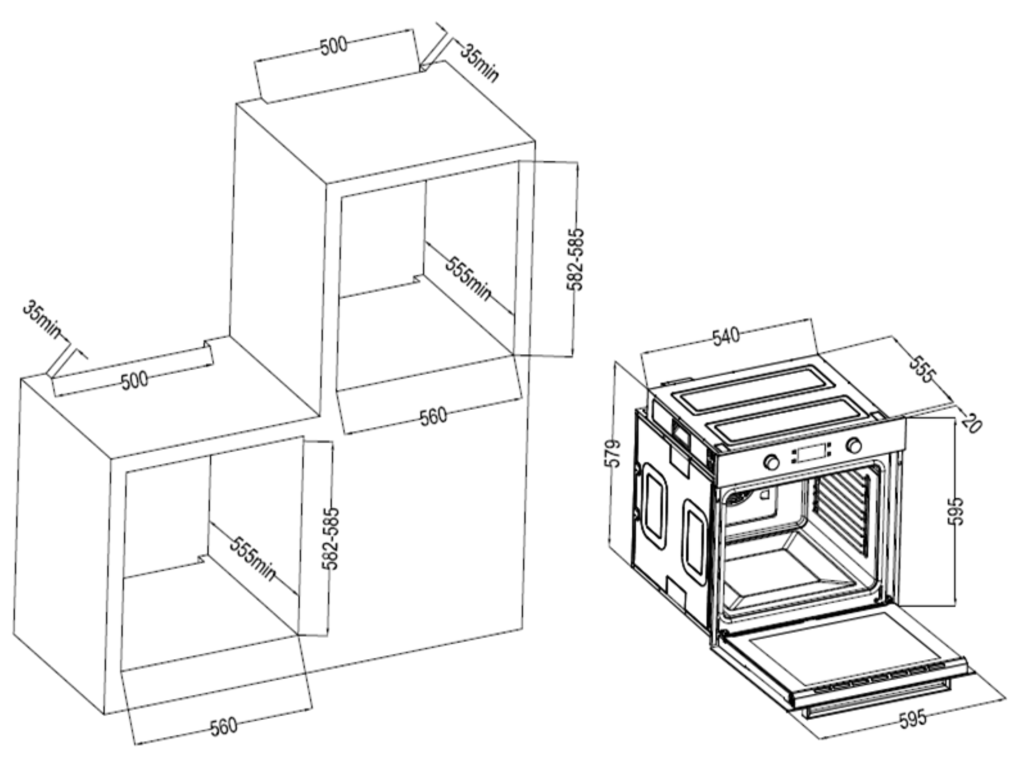 - Einbaumaße Backofen in cm (H x B x T): 58,5 x 56 x 55,5 cm