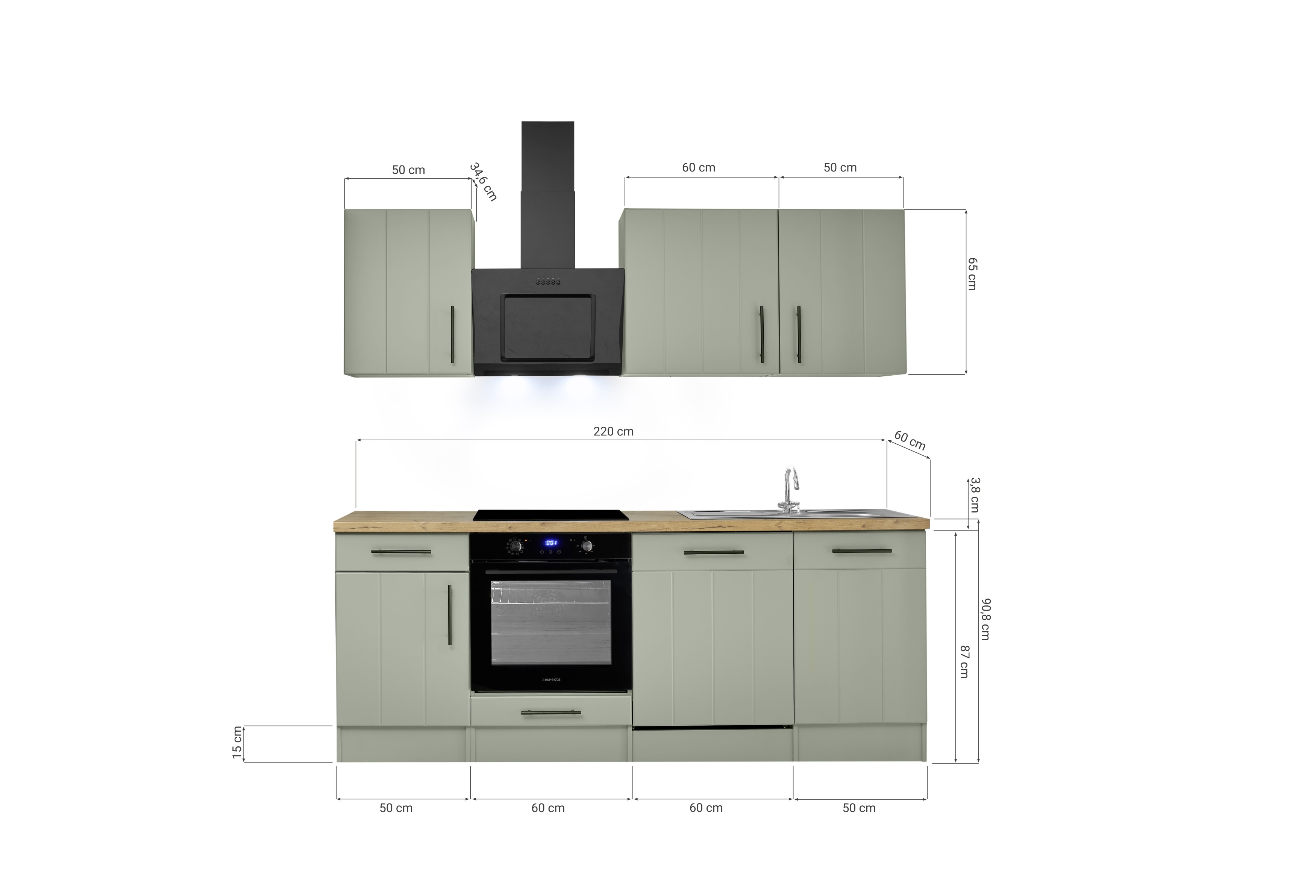 Küchenblock Anton – 220 cm Landhausküche in Schilfgrün mit Induktionskochfeld