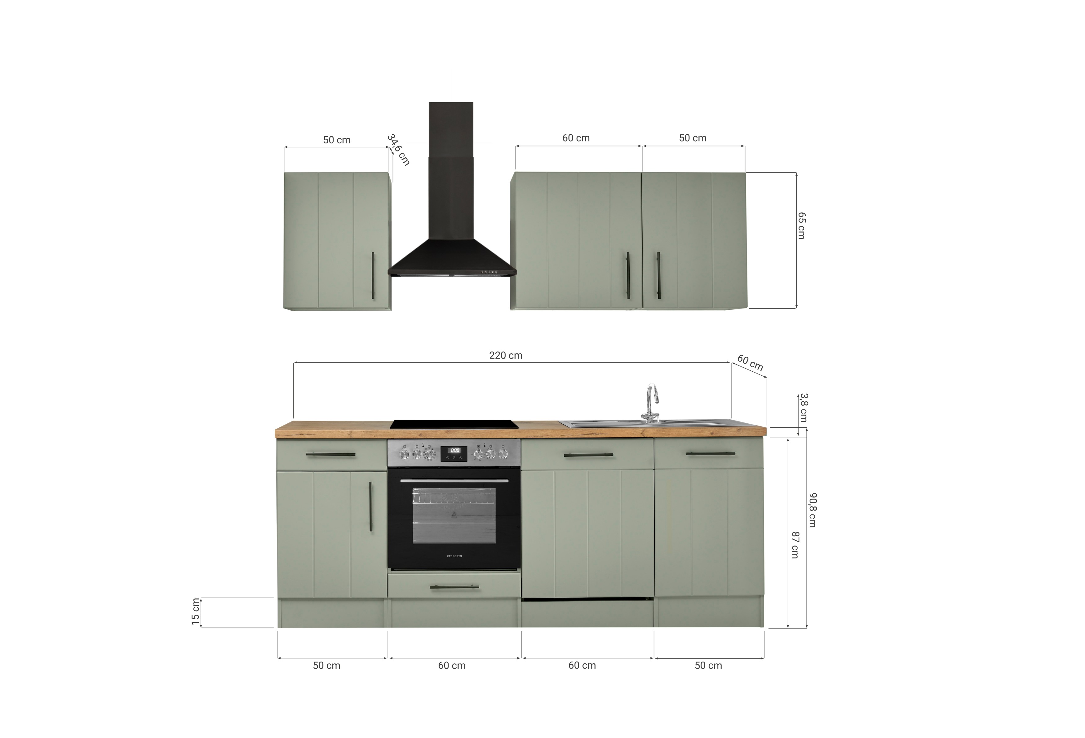 Küchenblock Anton – 220 cm Landhausküche in Schilfgrün ohne Kühlschrank