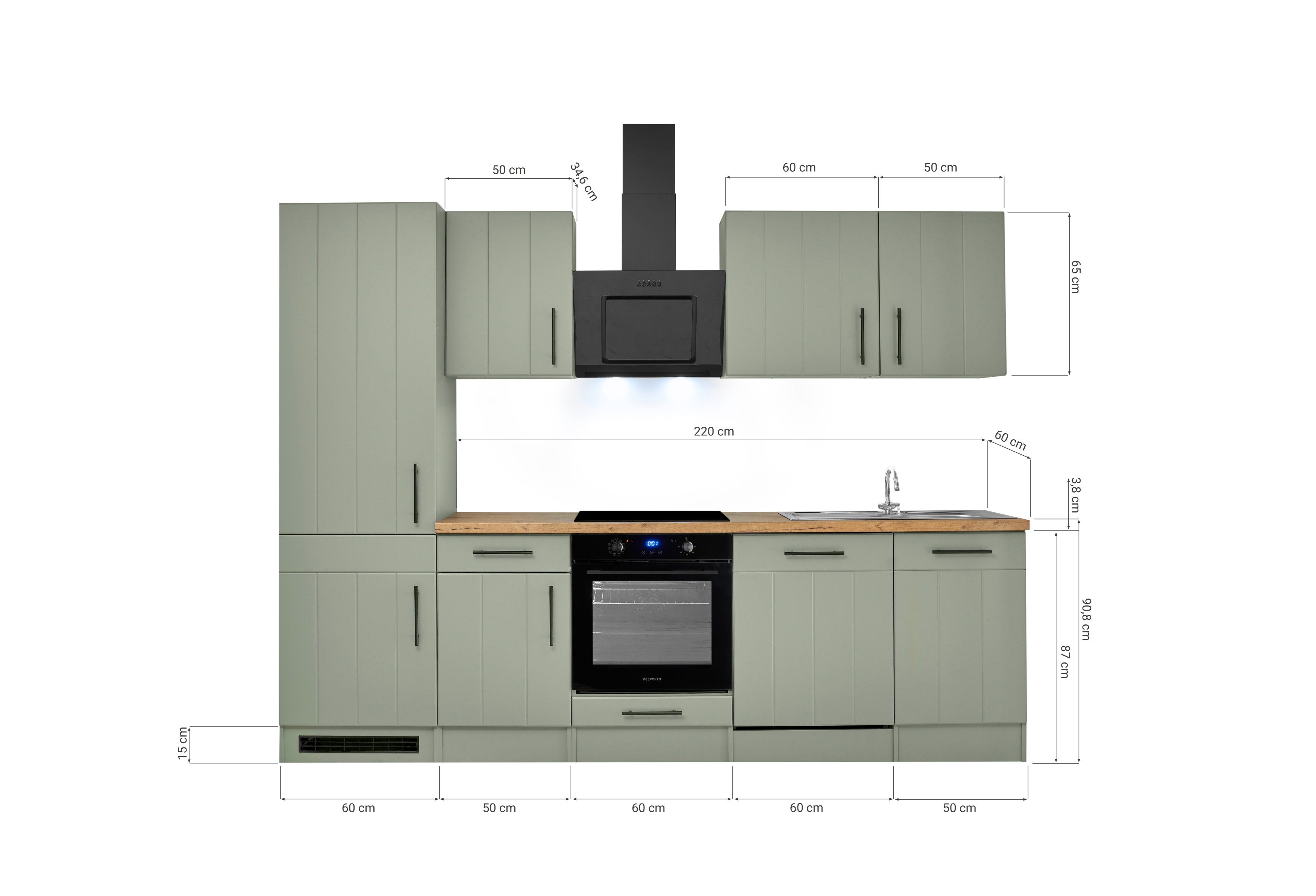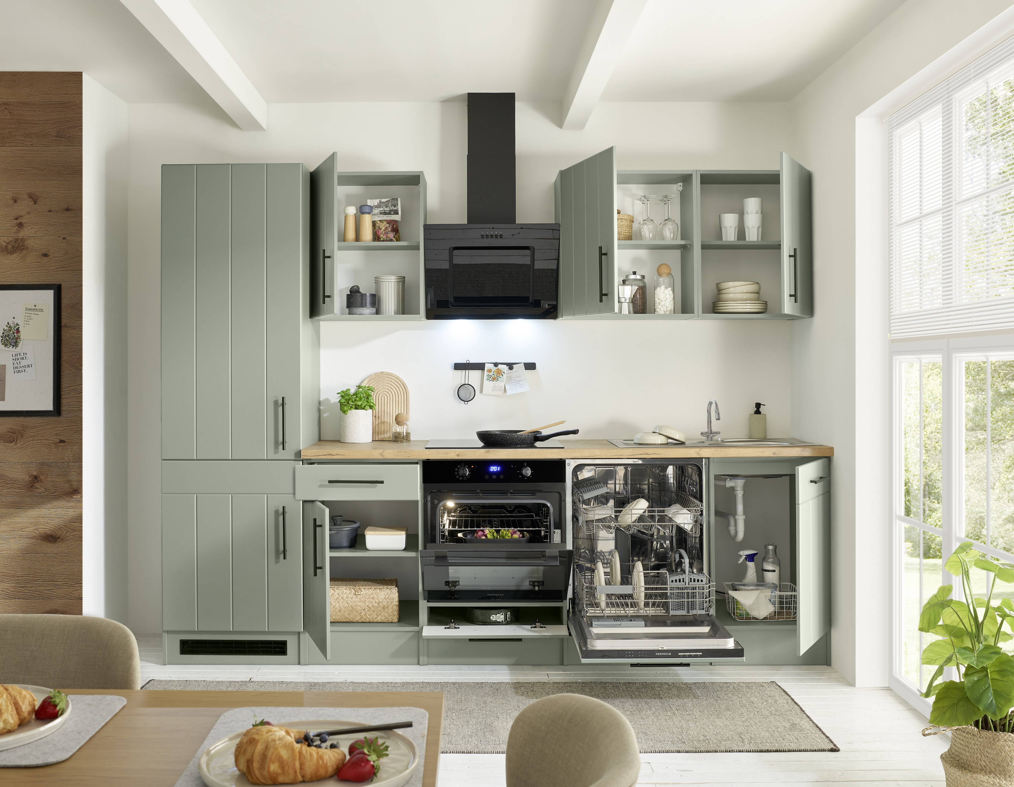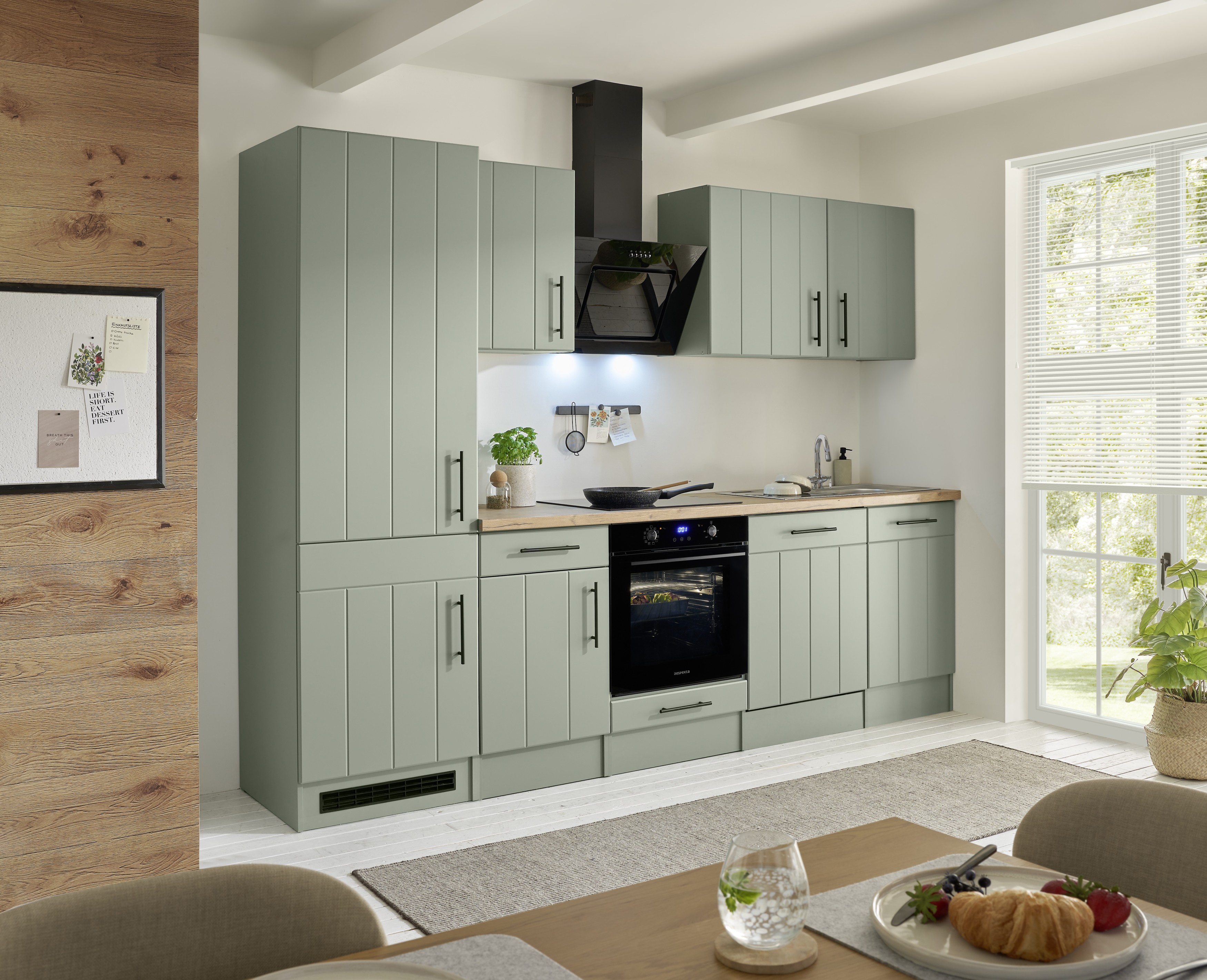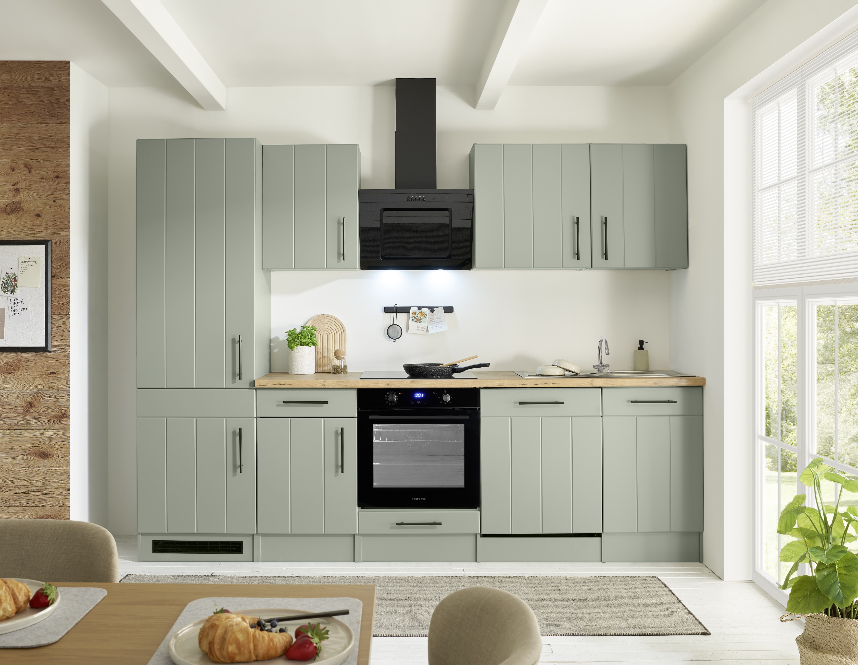 Küchenblock Anton – 280 cm Landhausküche in Schilfgrün mit Induktionskochfeld und Kühl-/Gefrierkombination 178 cm