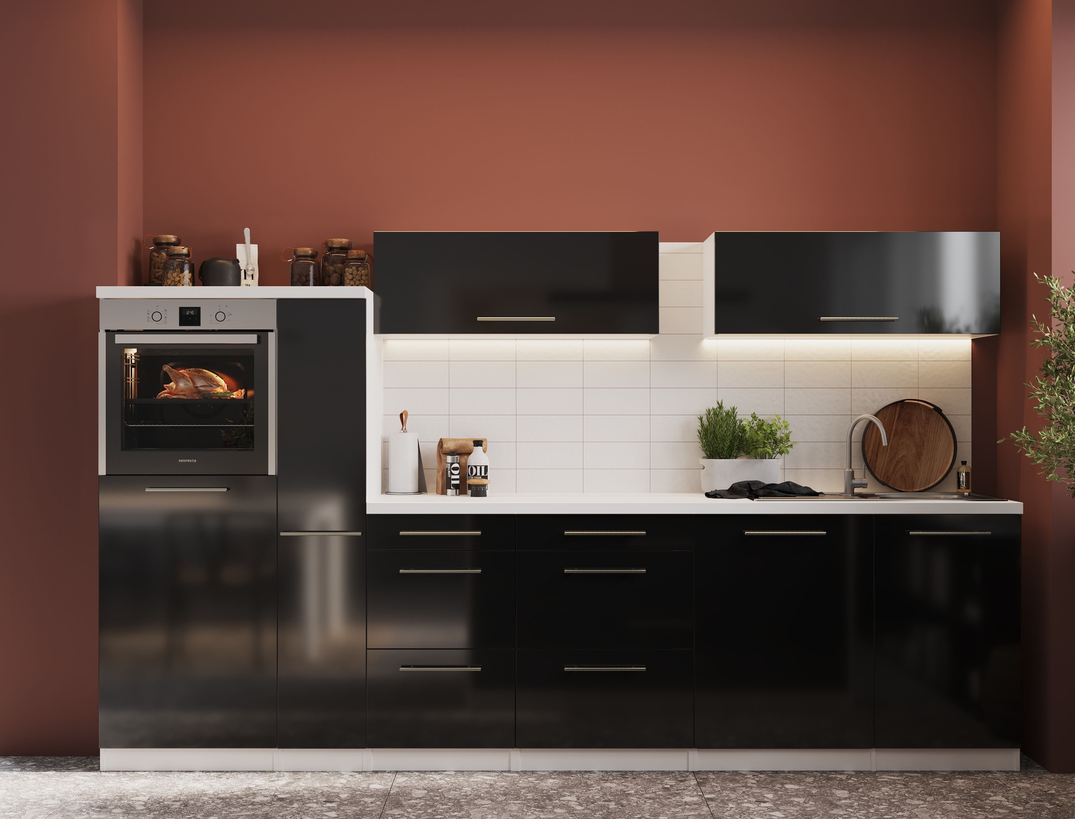 - Fronten: MDF in Weiß, Grau oder Schwarz Hochglanz