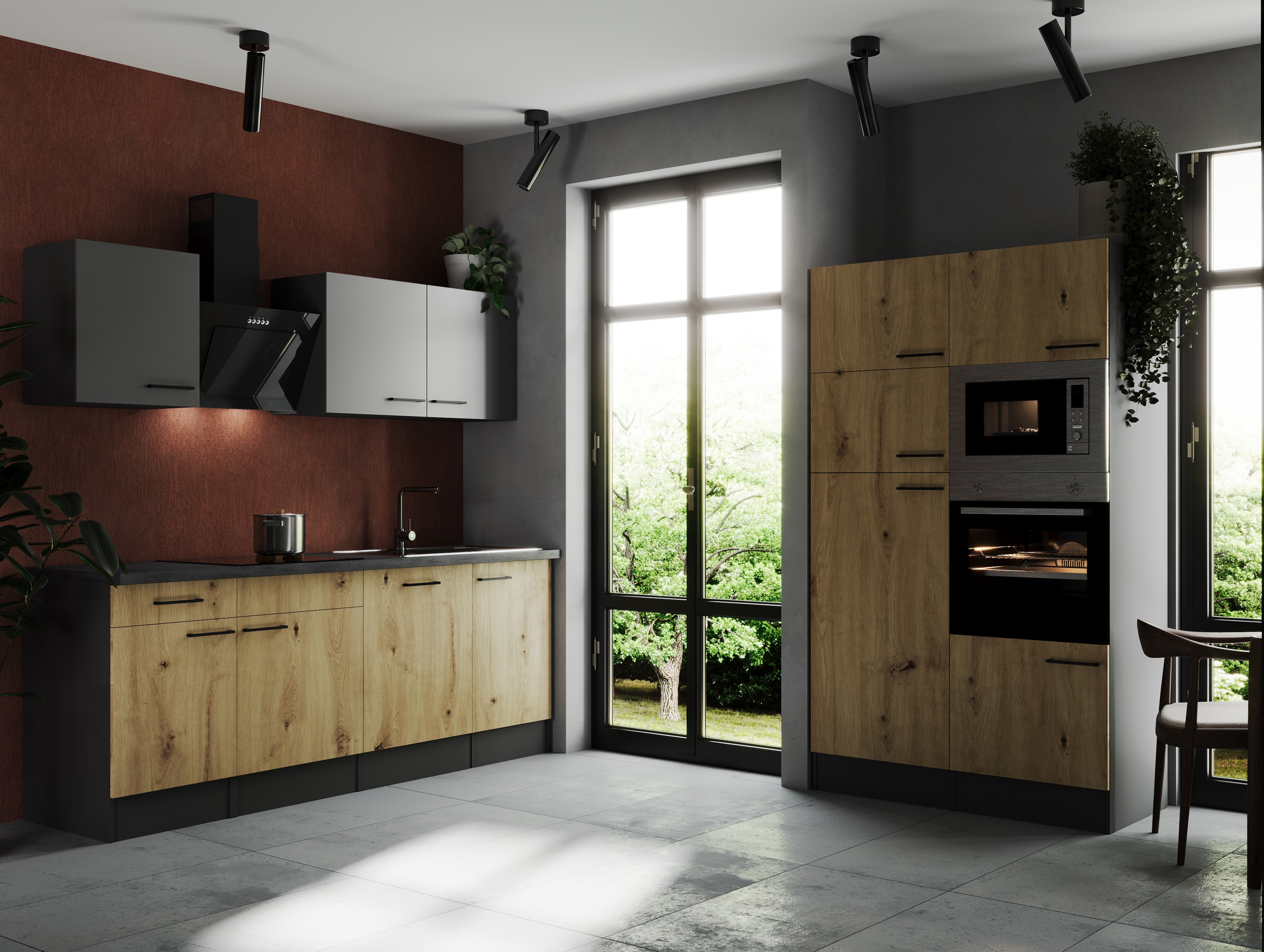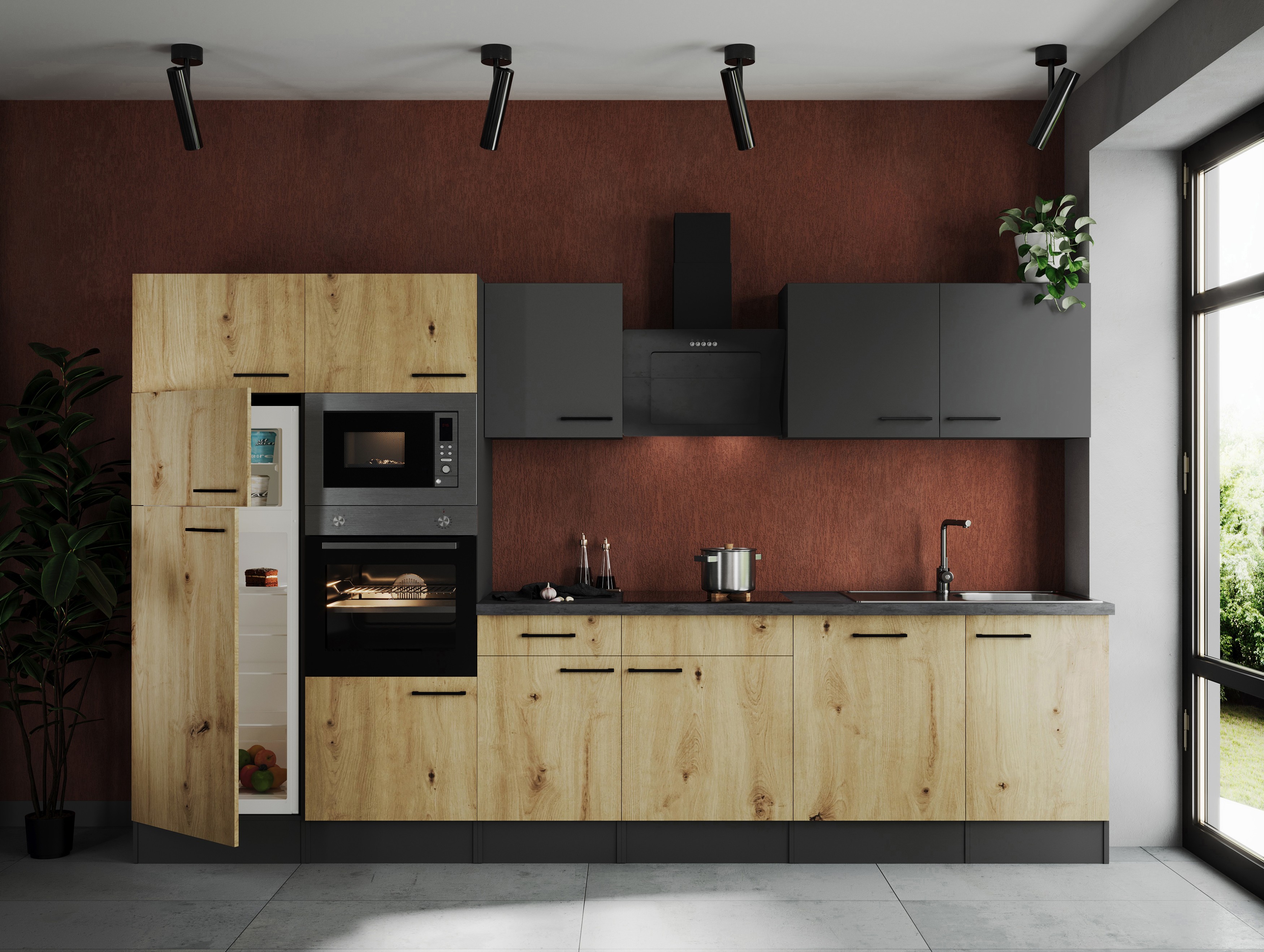 Der Küchenblock Oliver vereint modernes Design, hochwertige Ausstattung und funktionale Technik in einer kompakten Küchenlösung. Mit einer Gesamtbreite von 340 cm, einer eleganten Front in Artisan Eiche und Oberschränken in Grau Matt bringt er zeitlose Eleganz in jede Küche. Korpus in Grau Matt und Arbeitsplatte in Granit Optik setzen natürliche Akzente und sorgen für ein harmonisches Gesamtbild.