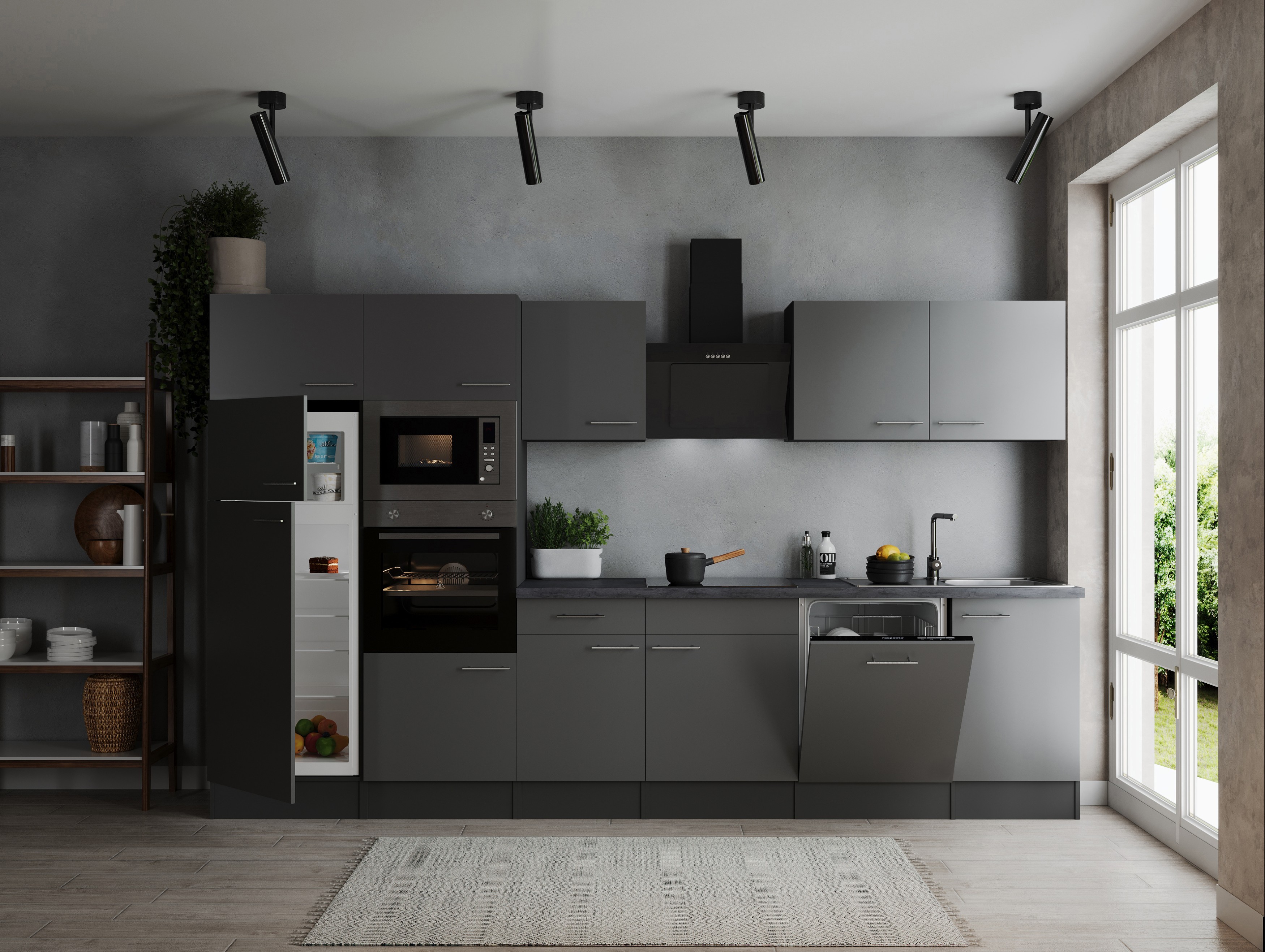 - Inklusive: Vollintegrierter Geschirrspüler 60 cm, Schräghaube mit Glasfront 60 cm, autarker Einbaubackofen sowie Kochfeld, Einbau Kühl- / Gefrierkombination mit 4* Gefrierfach, Einbaumikrowelle