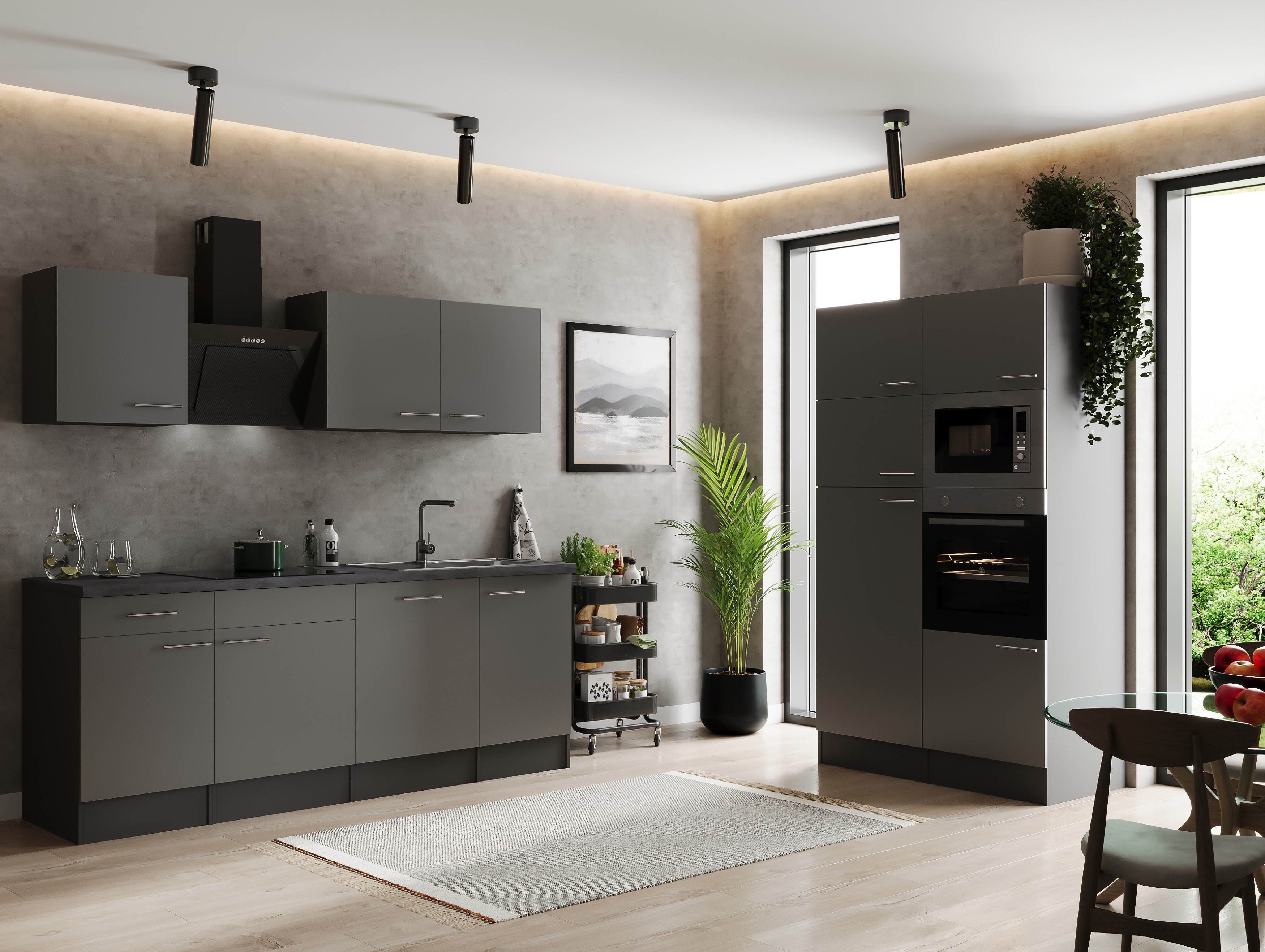 Der Küchenblock Oliver vereint modernes Design, hochwertige Ausstattung und funktionale Technik in einer kompakten Küchenlösung. Mit einer Gesamtbreite von 340 cm und einer eleganten Front in Grau bringt er zeitlose Eleganz in jede Küche. Korpus in Grau Matt und Arbeitsplatte in Granit Optik setzen natürliche Akzente und sorgen für ein harmonisches Gesamtbild.