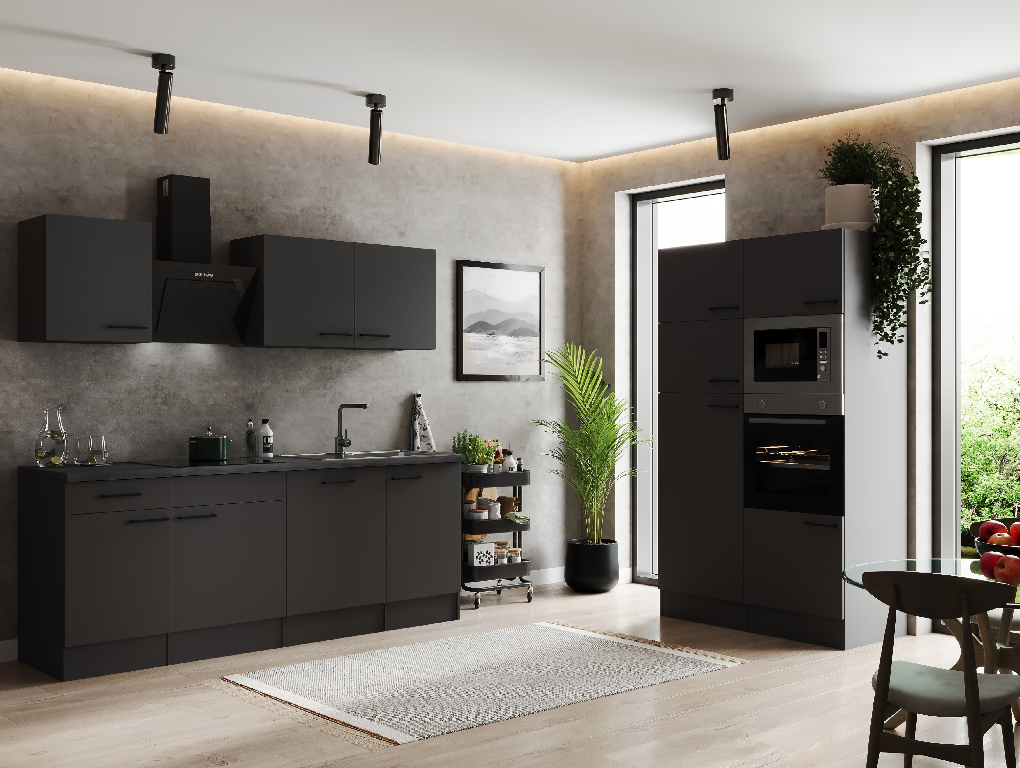 Der Küchenblock Oliver vereint modernes Design, hochwertige Ausstattung und funktionale Technik in einer kompakten Küchenlösung. Mit einer Gesamtbreite von 340 cm und einer eleganten Front in Grau Matt bringt er zeitlose Eleganz in jede Küche. Korpus in Grau Matt und Arbeitsplatte in Granit Optik setzen natürliche Akzente und sorgen für ein harmonisches Gesamtbild.