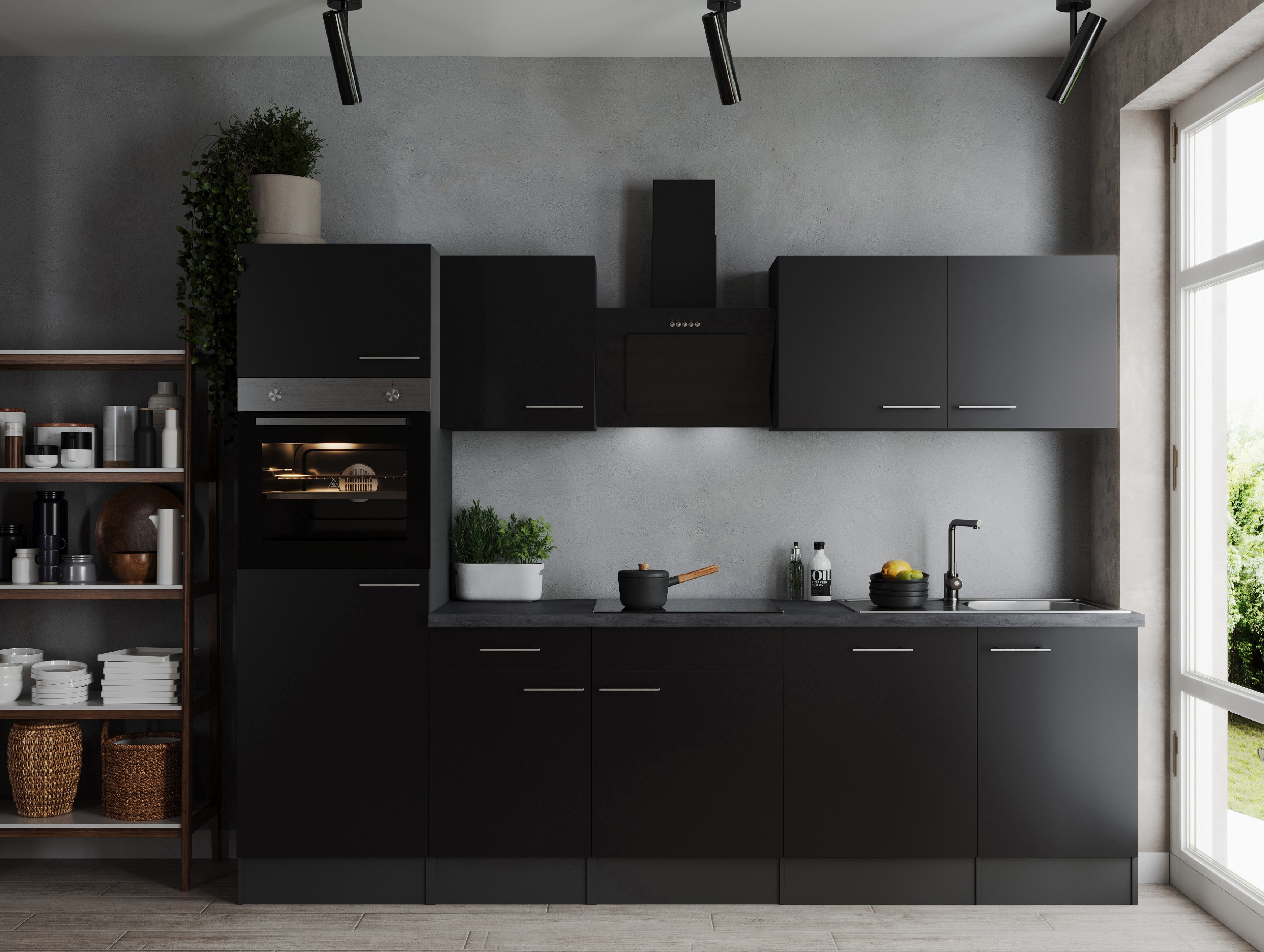 Der Küchenblock Oliver vereint modernes Design, hochwertige Ausstattung und funktionale Technik in einer kompakten Küchenlösung. Mit einer Gesamtbreite von 280 cm und einer eleganten Front in Schwarz bringt er zeitlose Eleganz in jede Küche. Korpus in Grau Matt und Arbeitsplatte in Granit Optik setzen natürliche Akzente und sorgen für ein harmonisches Gesamtbild.