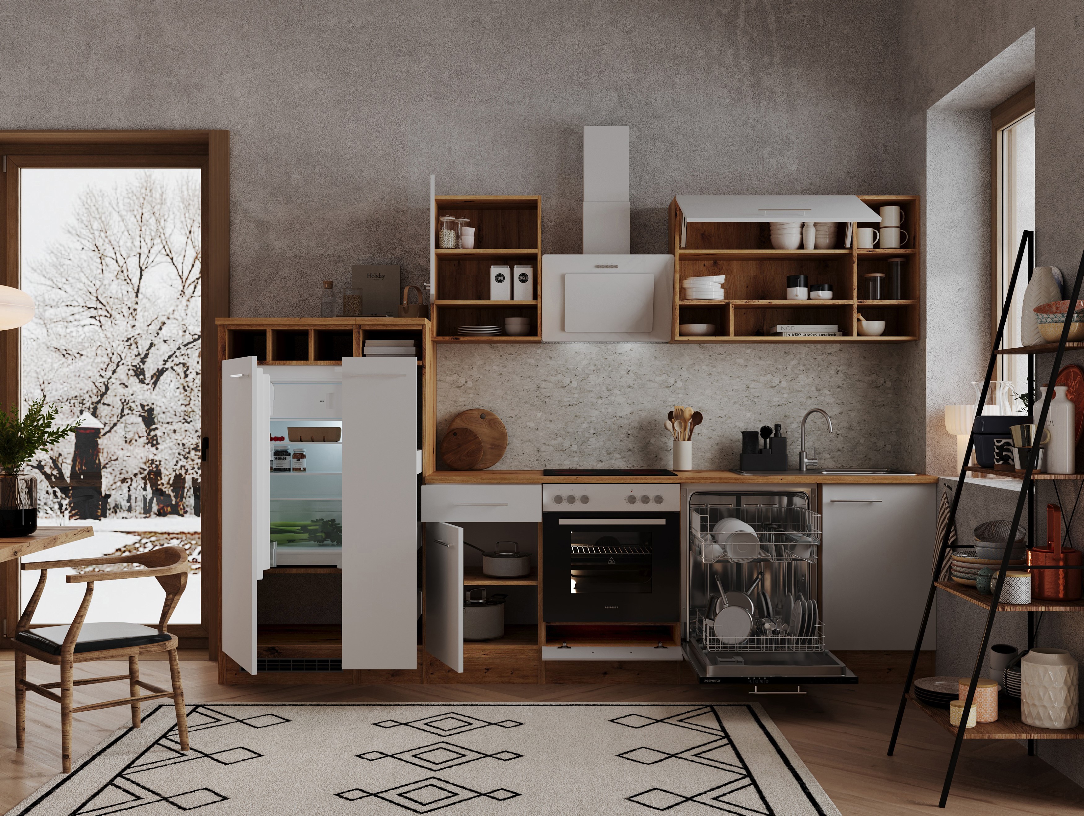 - Herdumbauschrank mit Klapptür: Ein spezieller Herdumbauschrank mit einer praktischen Klapptür bietet Platz für Ihre Backbleche und erleichtert den Zugriff auf Ihre Küchenutensilien.