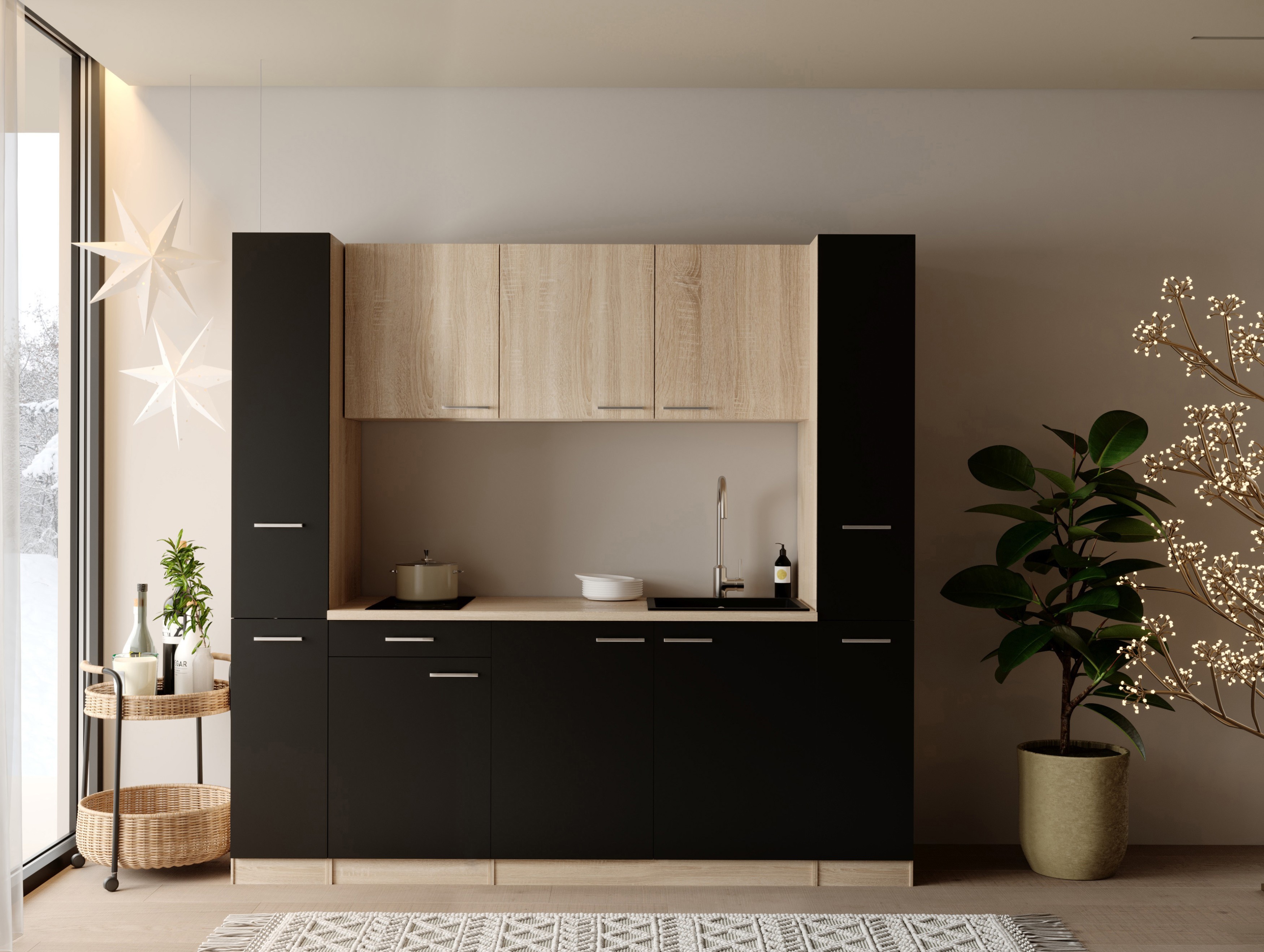 Mit einer Breite von 210 cm ist Ingrid die ideale Lösung für kleine Küchenräume, Apartments oder Büros. Trotz ihrer kompakten Maße bietet sie durchdachten Stauraum und praktische Ausstattung, darunter ein Domino-Glaskeramikkochfeld sowie eine hochwertige schwarze Mineralite-Einbauspüle.