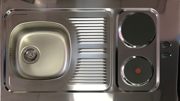 - Pantryauflagenspüle mit Glaskeramikkochfeld und 90 mm Siebkorbventil