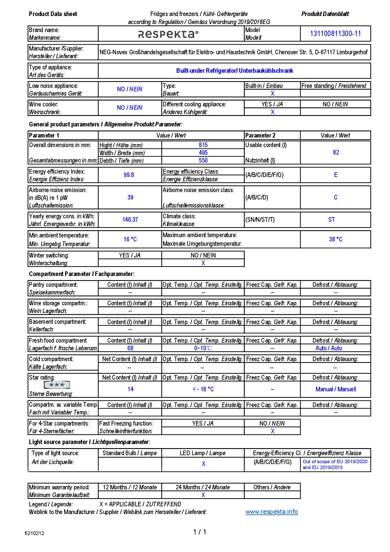 - Nutzinhalt Kühlen/Gefrieren: 68 Liter / 14 Liter