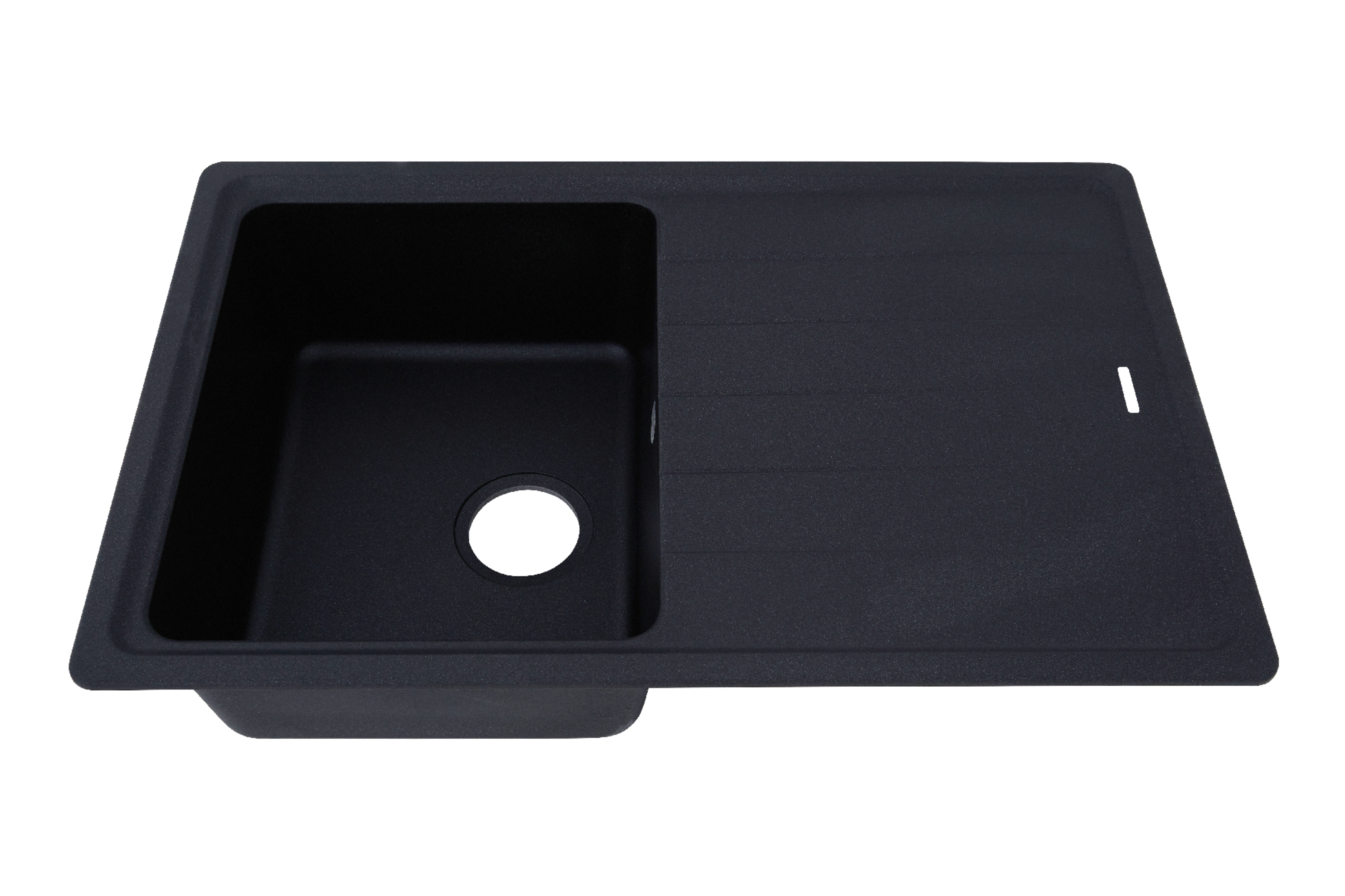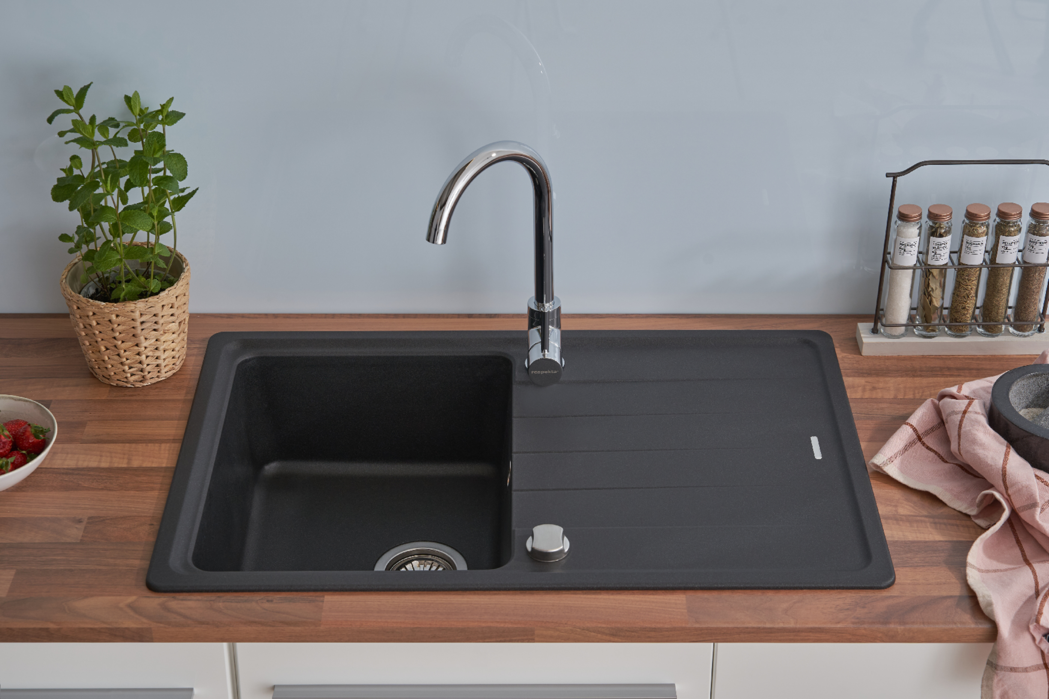 - Langlebiges Material: Die Spüle besteht aus einem Granitverbund-Material, das zu 80 % aus Quarzsand, zu 15 % aus Kunstharz und zu 5 % aus Additiven besteht. Diese Zusammensetzung sorgt für eine außergewöhnliche Beständigkeit gegen Kratzer, Stöße und aggressive Chemikalien.