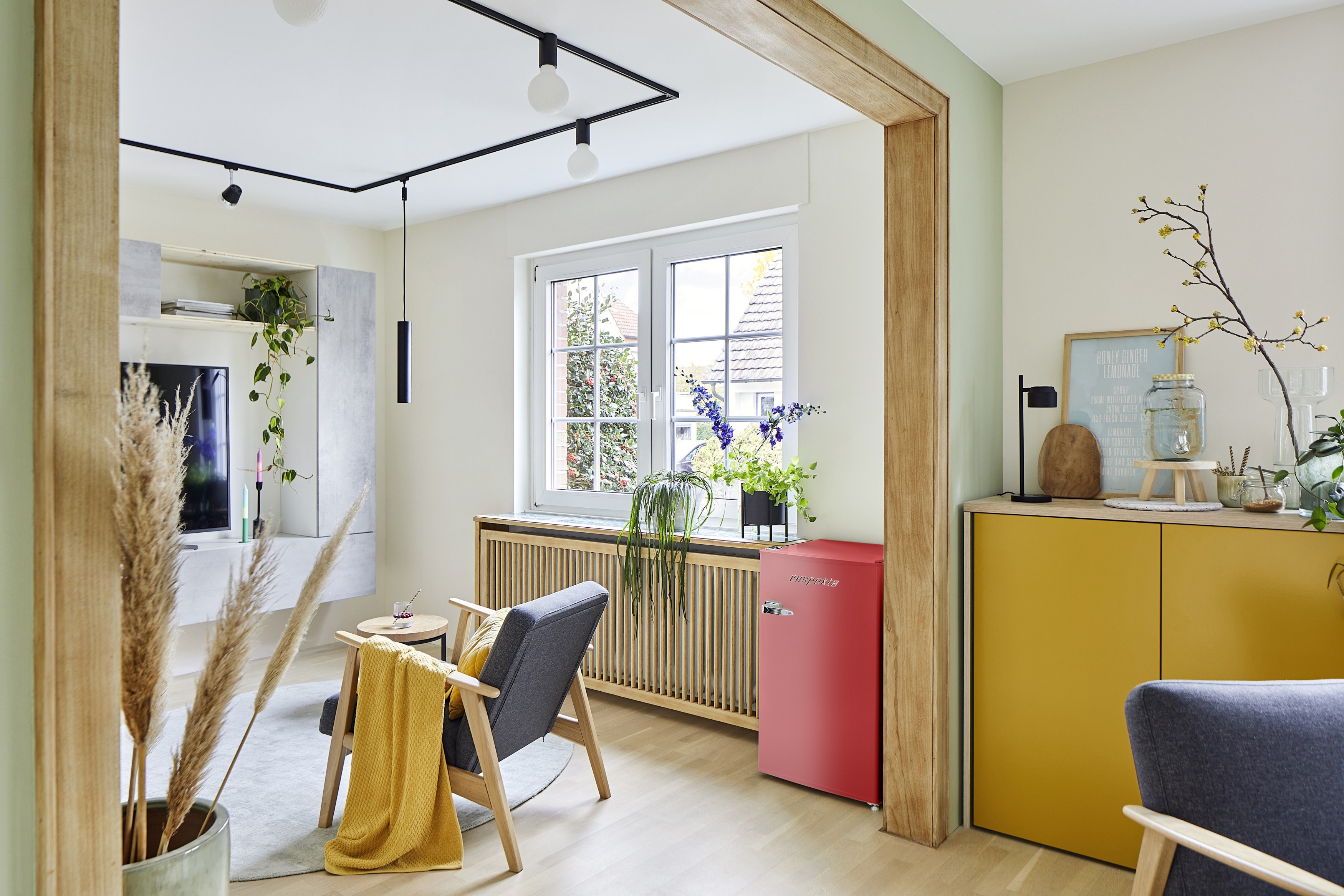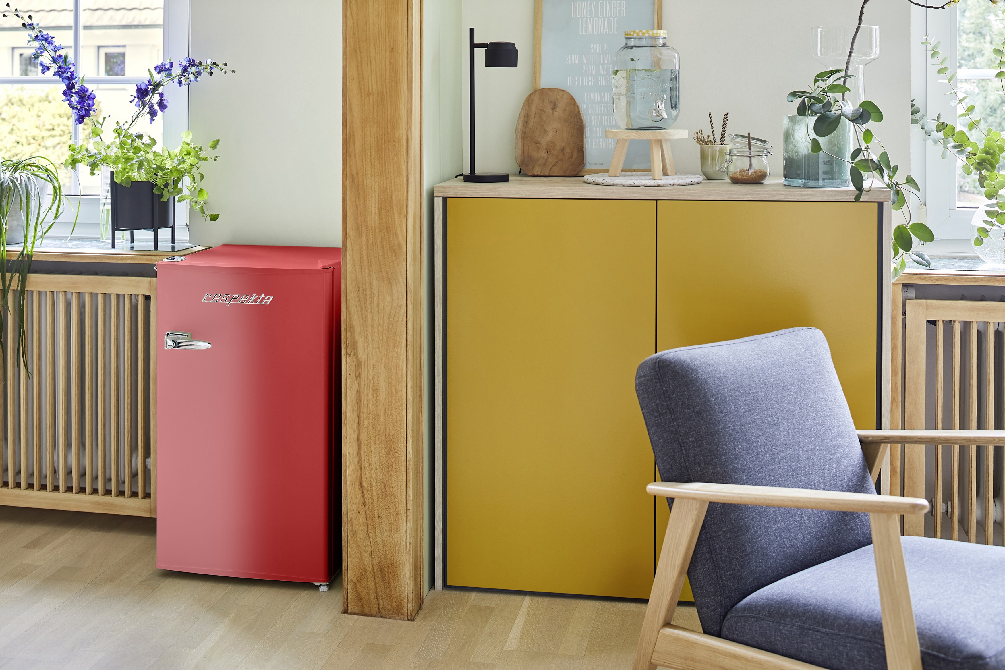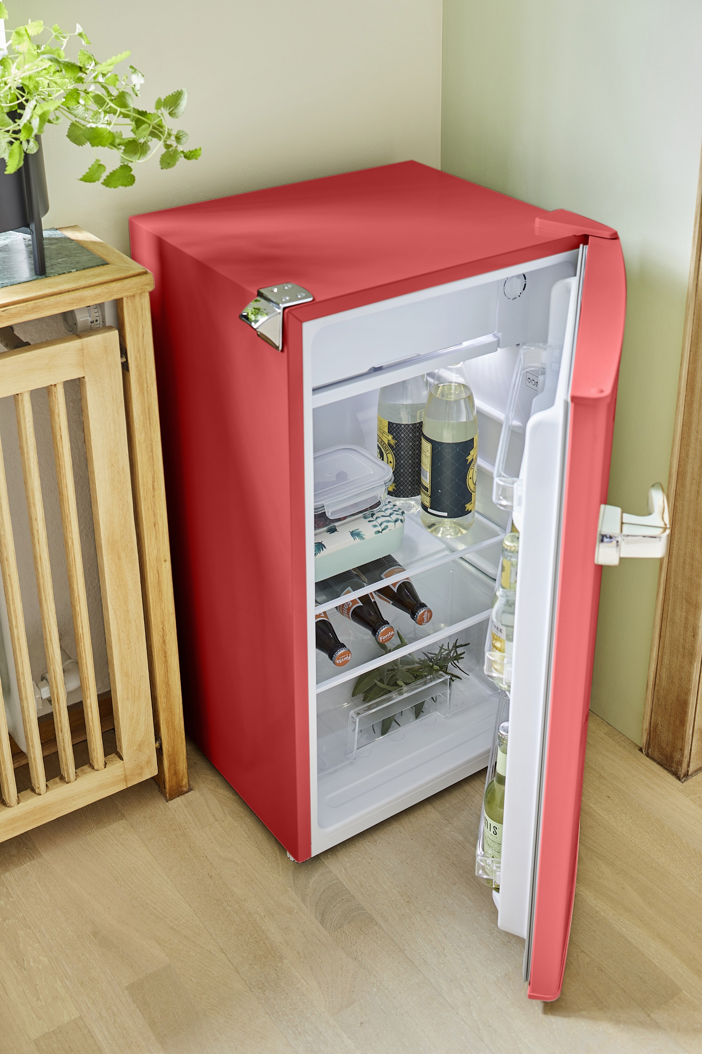 Erhältlich in drei Farben – Rot, Schwarz und Cream - lässt sich die Retrokühlschrank perfekt in verschiedene Einrichtungsstile integrieren und verbindet Vintage-Charme mit moderner Technik.