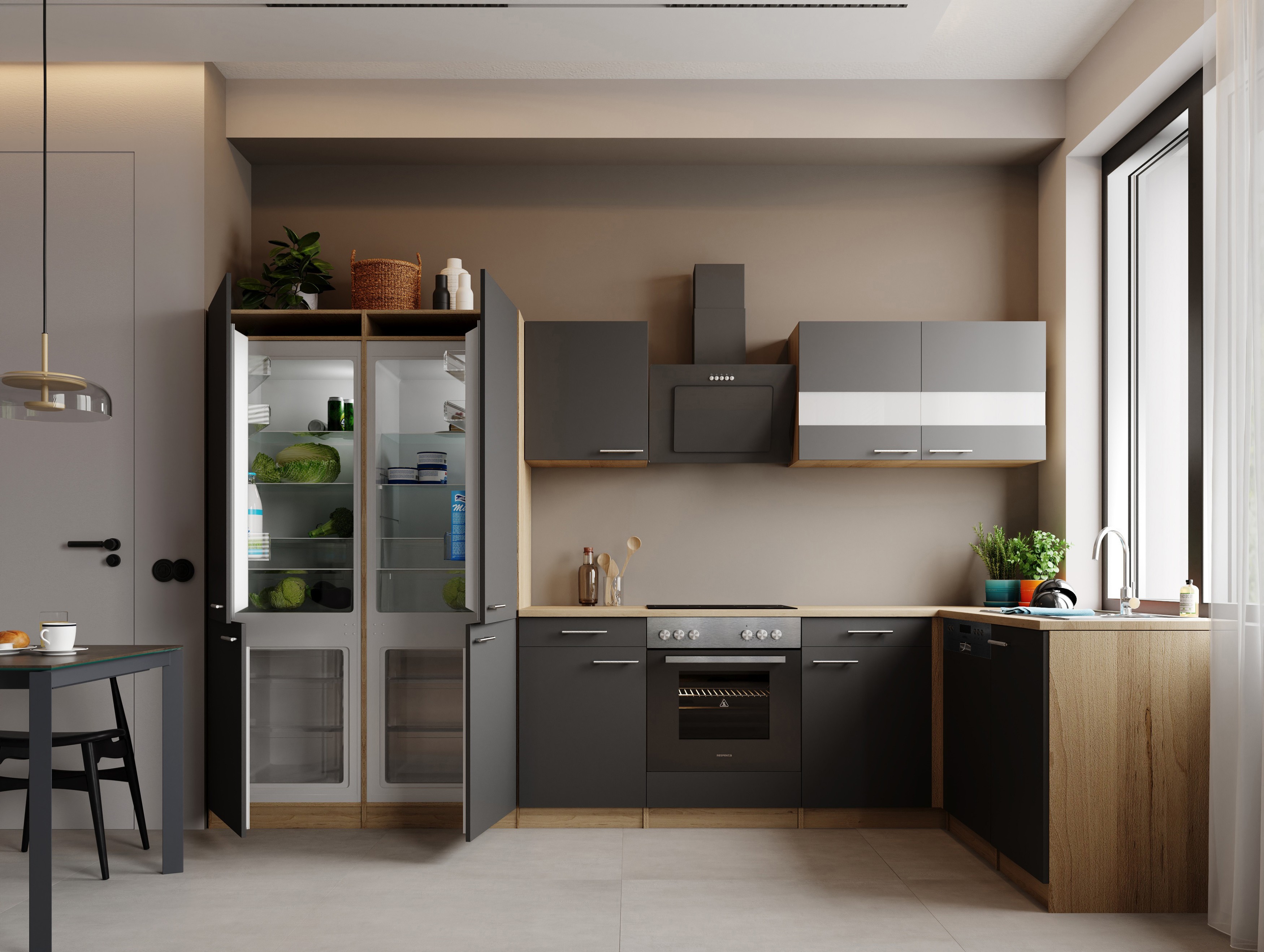 Die Winkelküche Merle überzeugt mit einer harmonischen Kombination aus natürlicher Holzoptik und moderner Funktionalität. Korpus und Arbeitsplatte in Eiche Sägerau Nachbildung treffen auf Fronten in Grau und werden durch elegante Stangengriffe im Edelstahl-Look stilvoll ergänzt. Das Highlight ist das innovative French-Door-Design mit zwei integrierten Kühl-/Gefrierkombinationen in Side-by-Side-Optik – für maximale Übersicht und großzügigen Stauraum.