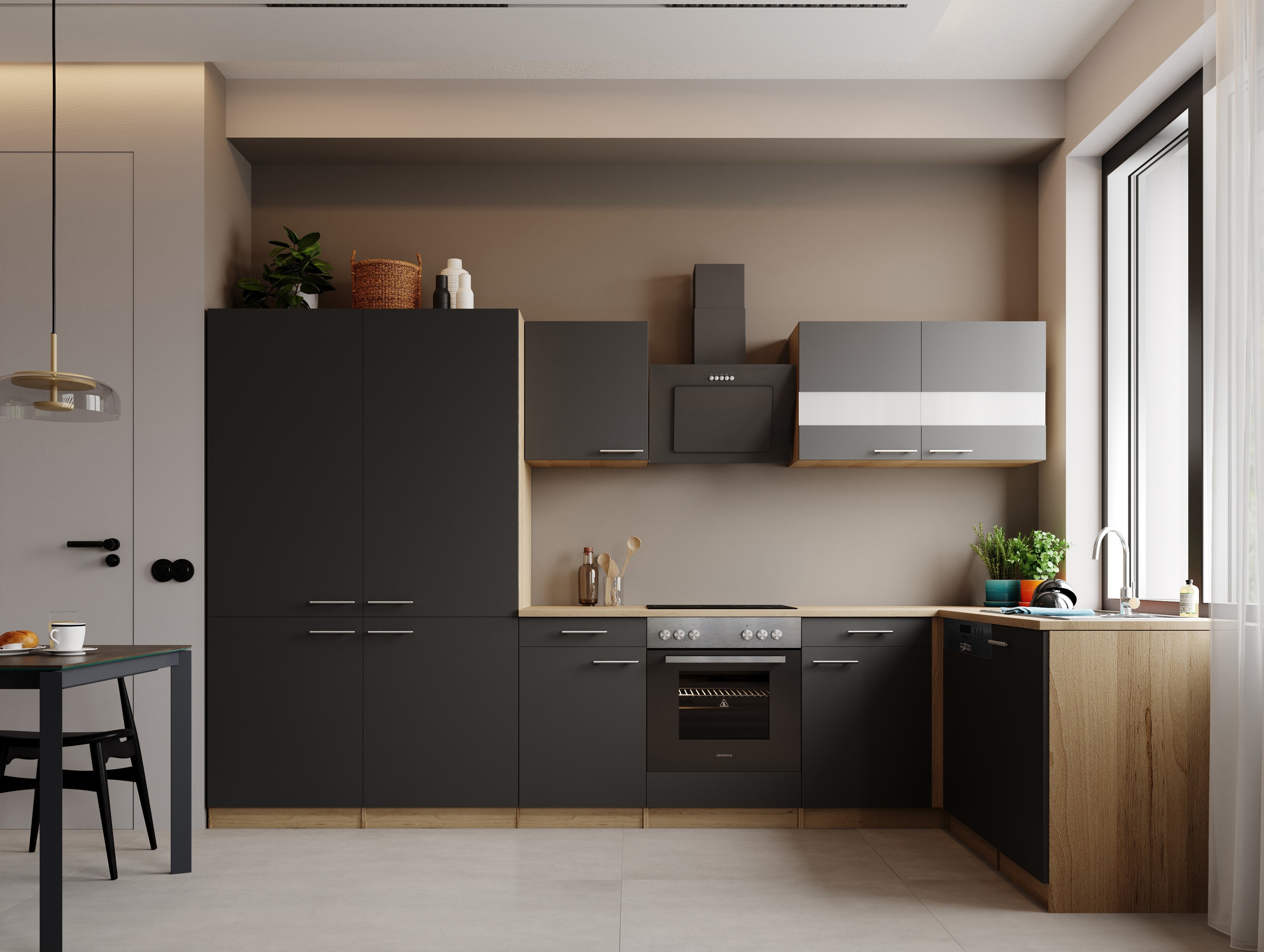 L-Küche Merle – 340 cm moderne Komplettküche in Eiche Sägerau mit Einbaukühlschrank in French-Door Optik