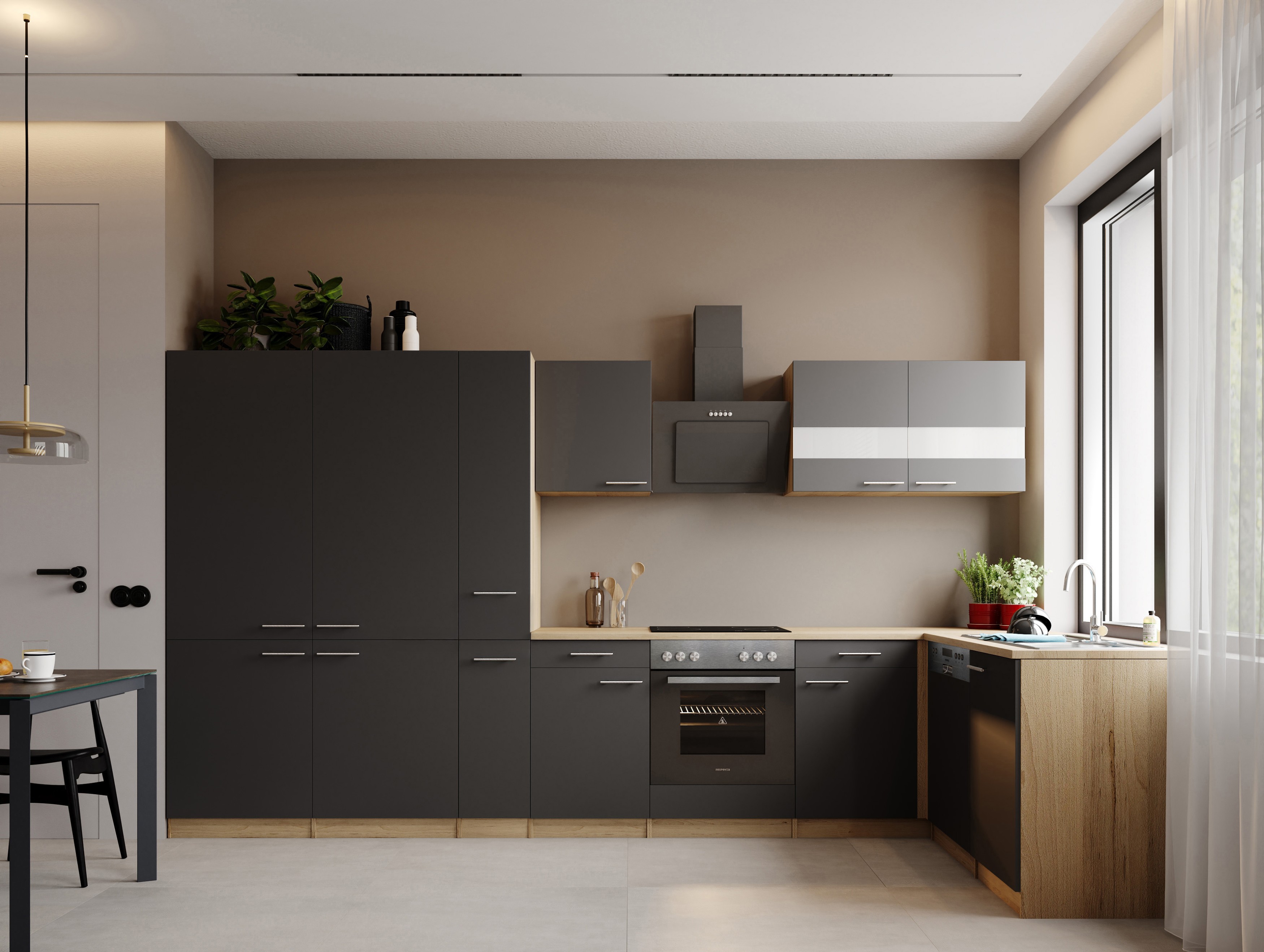 Mit einer Breite von 370 cm bietet Merle besonders viel Platz zum Arbeiten und Verstauen. Durchdachte Details wie Soft-Close-Auszüge und -Scharniere sowie flexible Aufbauoptionen – als durchgehende Küchenzeile oder Doppelblock-Lösung – machen diese Küche zu einer vielseitigen Lösung für moderne Wohnkonzepte.