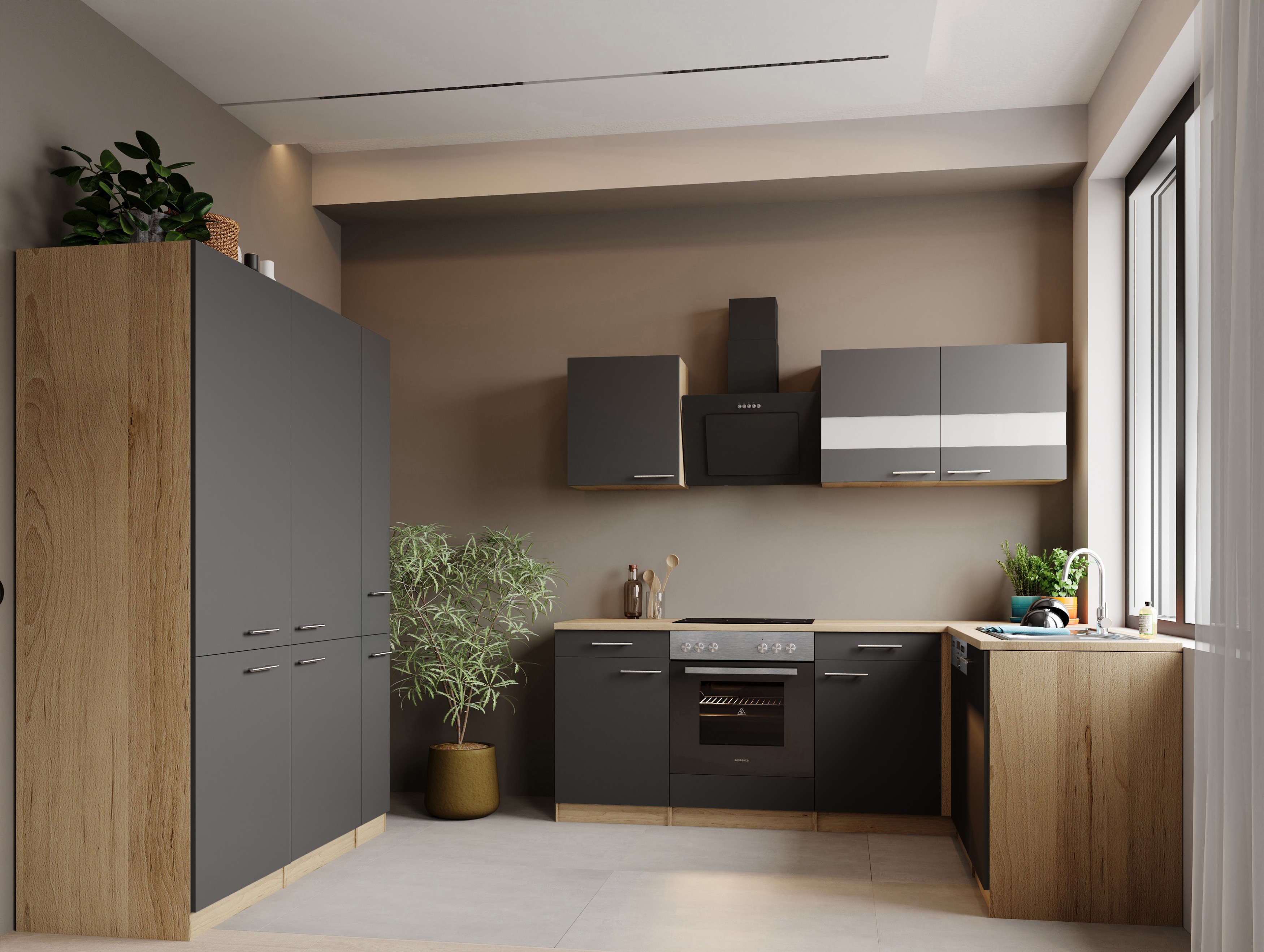 Die Winkelküche Merle überzeugt mit einer harmonischen Kombination aus natürlicher Holzoptik und moderner Funktionalität. Korpus und Arbeitsplatte in Eiche Sägerau Nachbildung treffen auf Fronten in Grau und werden durch elegante Stangengriffe im Edelstahl-Look stilvoll ergänzt. Das Highlight ist das innovative French-Door-Design mit zwei integrierten Kühl-/Gefrierkombinationen in Side-by-Side-Optik – für maximale Übersicht und großzügigen Stauraum.