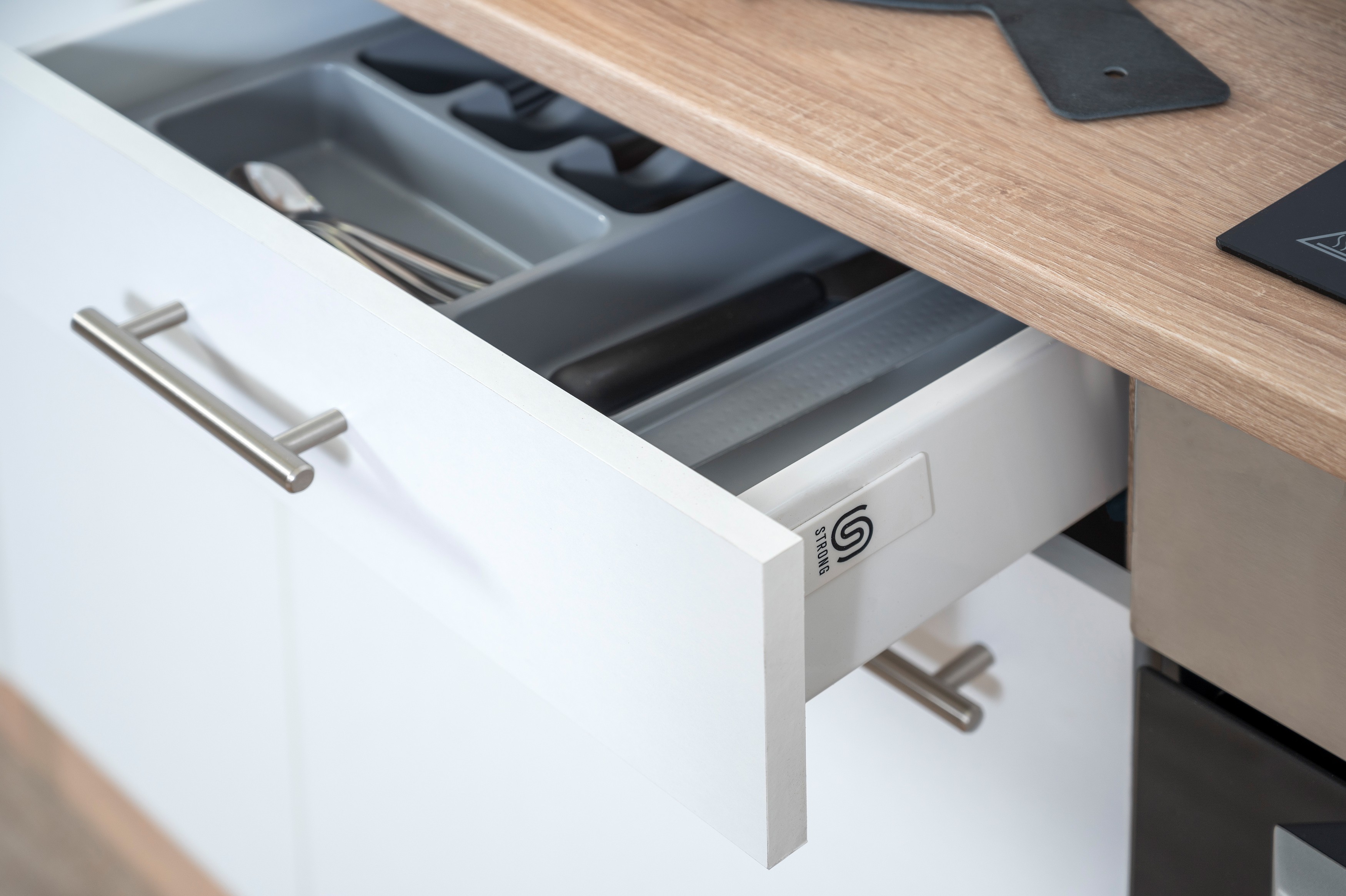 - Soft-Close Technik: Sanftes und leises Schließen aller Auszüge und Türen (Ausnahme Kühlschranktür)