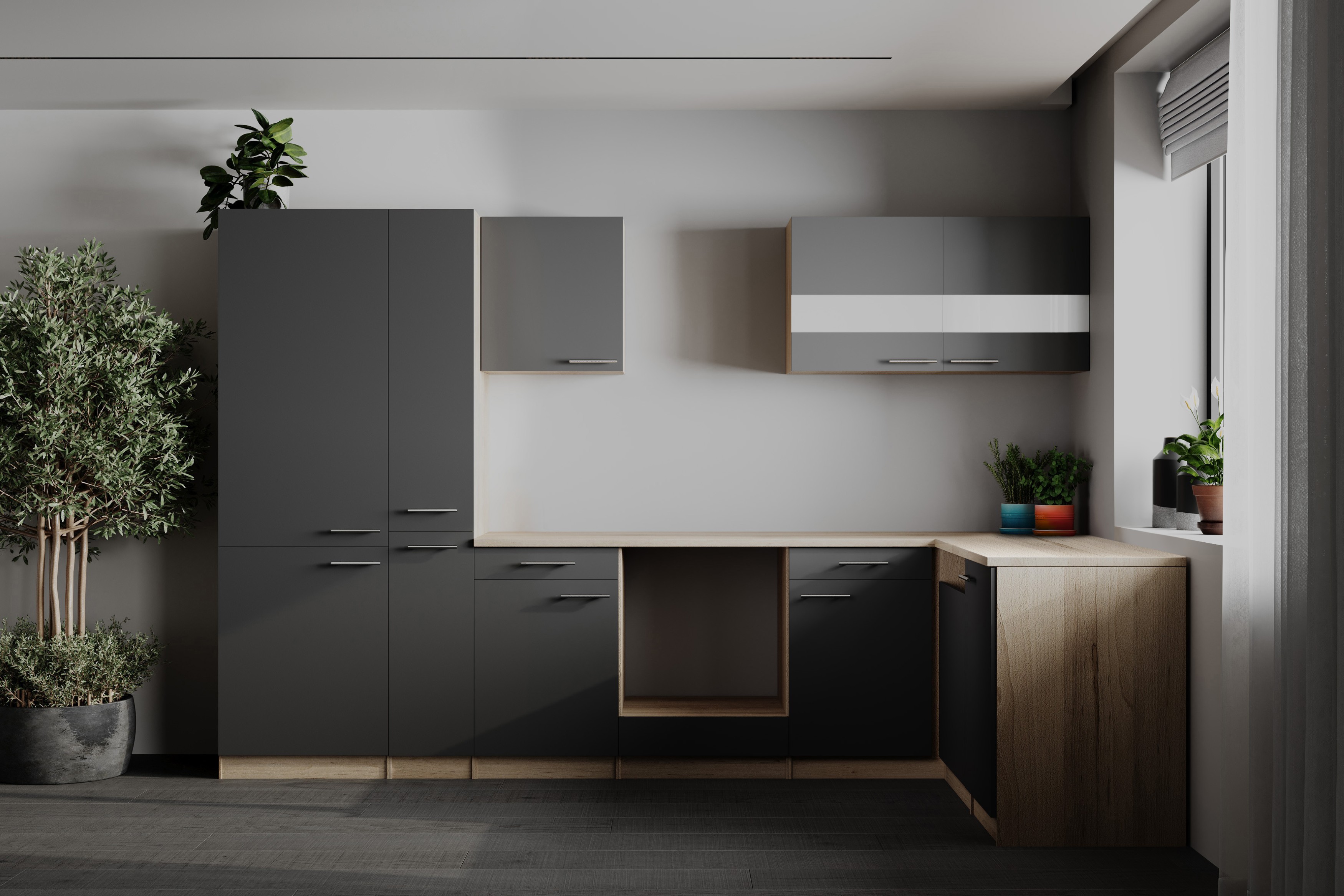 L-Küche Leerblock Merle – 310 cm moderne Küche in Eiche Sägerau mit Hochschrank für Kühl-/Gefrierkombination 178 cm