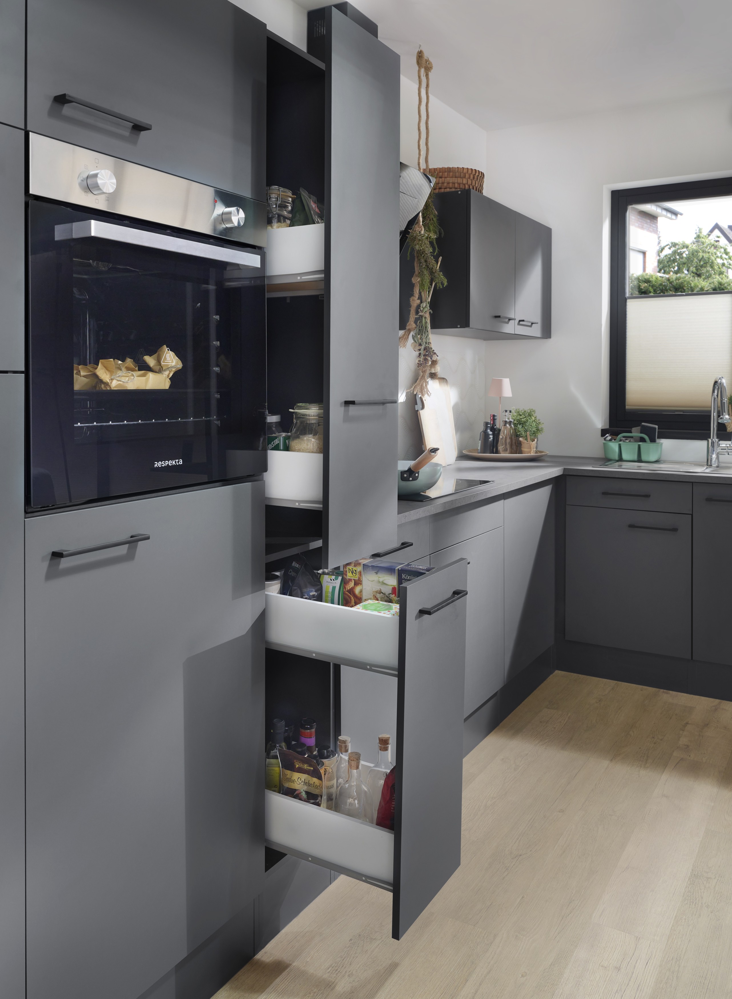 Die Winkelküche Oliver vereint modernes Design, hochwertige Ausstattung und funktionale Technik in einer kompakten Küchenlösung. Mit einer Gesamtbreite von 370 cm und einer eleganten Front in Schwarz bringt sie zeitlose Eleganz in jede Küche. Korpus in Grau Matt und Arbeitsplatte in Granit Optik setzen natürliche Akzente und sorgen für ein harmonisches Gesamtbild.