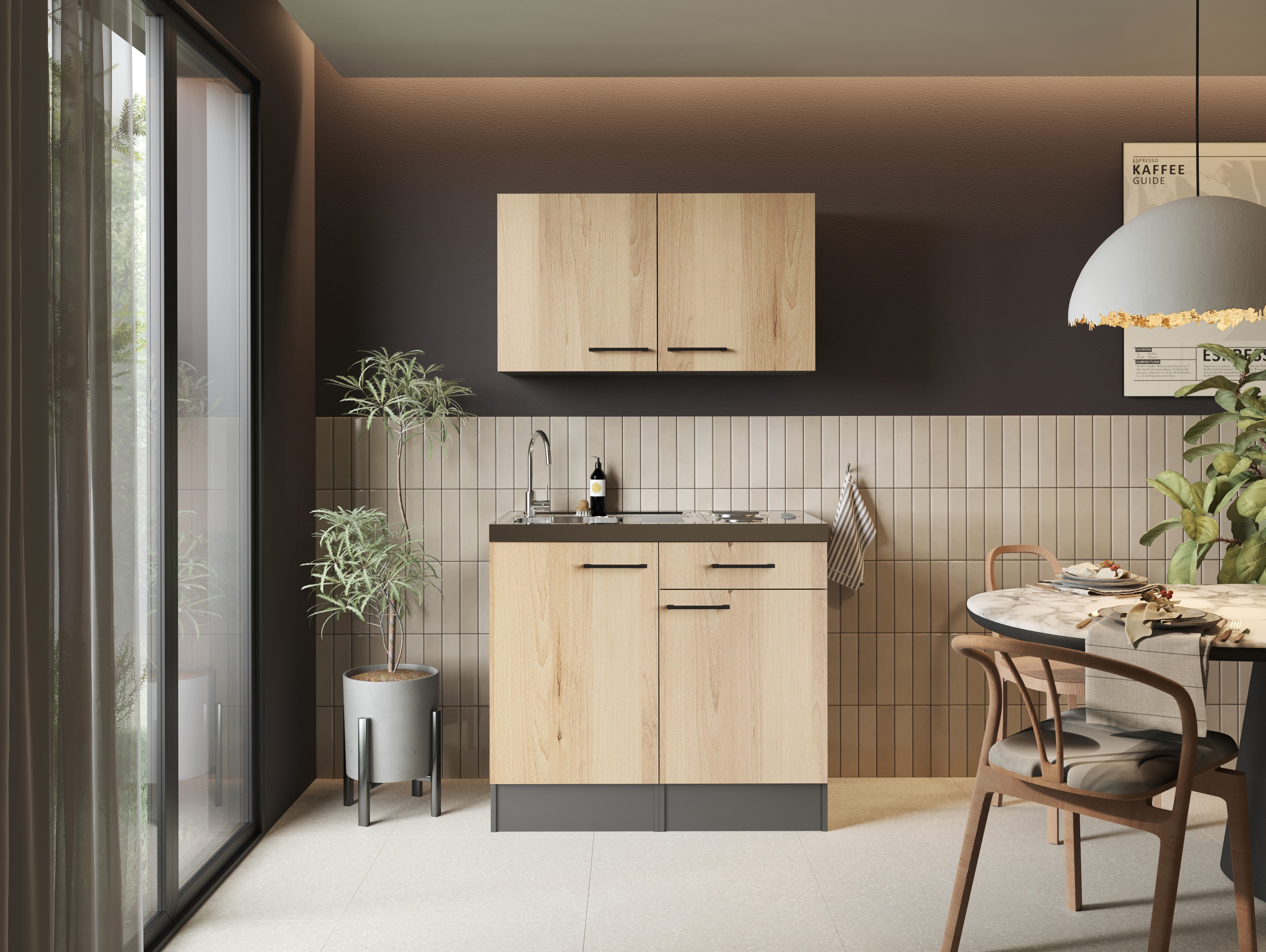 Die moderne und funktionale Kleinküche überzeugt durch zeitloses Design und vielseitige Einsatzmöglichkeiten. Mit ihrem Korpus in Grau Matt und Fronten wahlweise in Grau Matt oder Artisan Eiche Nachbildung fügt sie sich harmonisch in jede Umgebung ein. Die Kombination aus Hängeschränken und integrierter Spülenabdeckung mit Edelstahlkochmulde bietet eine platzsparende Komplettlösung – ideal als Ergänzung zur bestehenden Küche oder zur eigenständigen Nutzung.