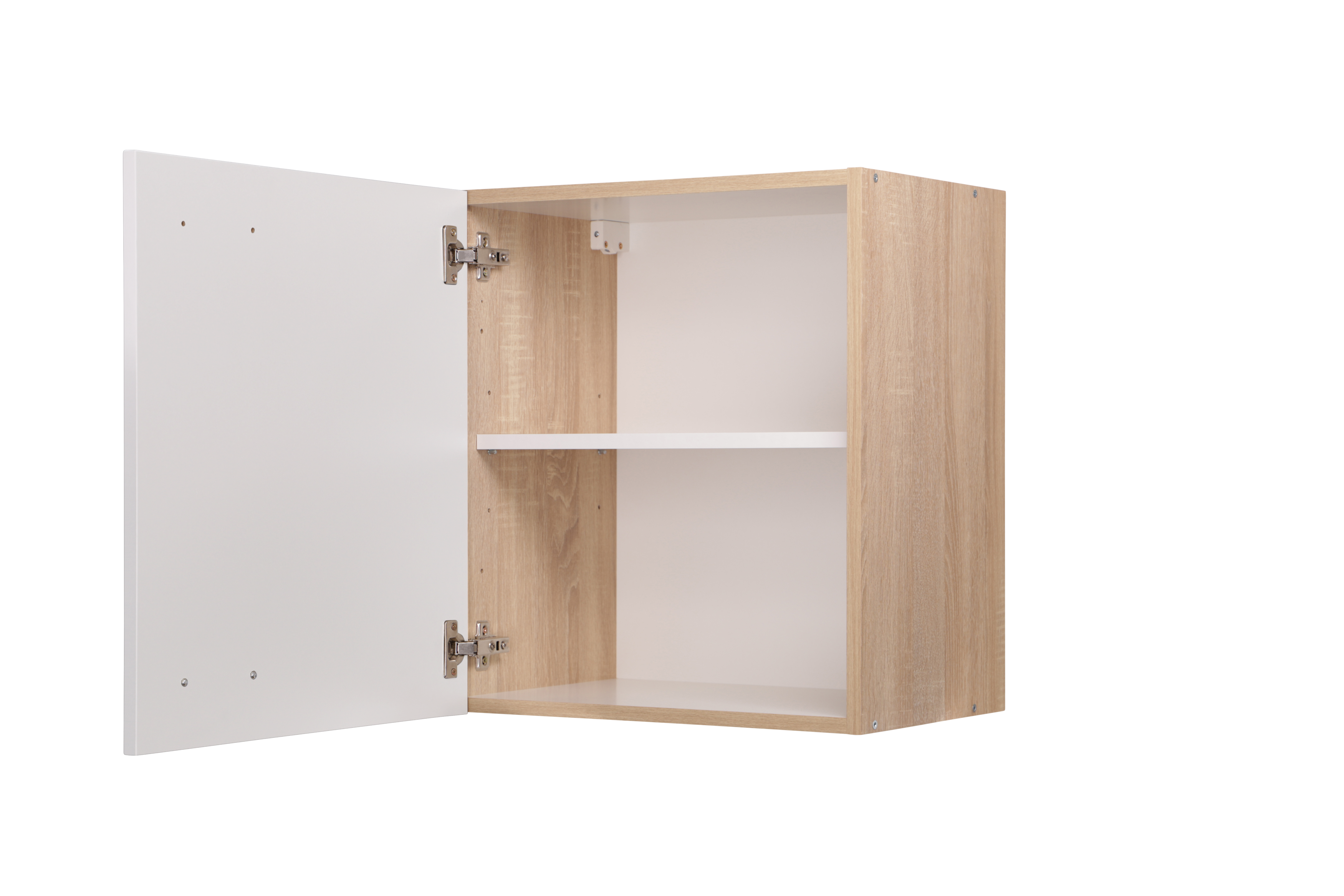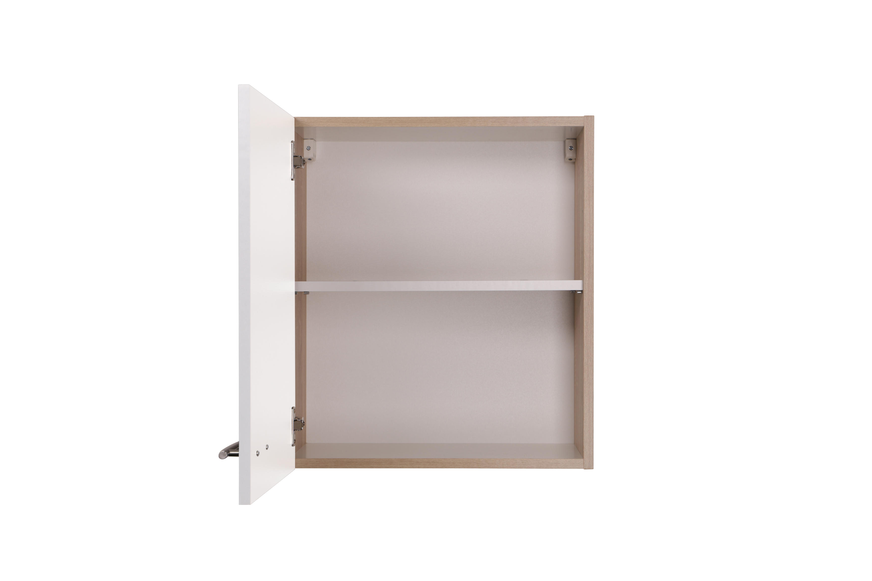 Der Merle Oberschrank 50 cm ist die ideale Ergänzung für Ihre Küche. Mit seinem modernen Korpus in Eiche Sägerau Nachbildung und Fronten in drei Farbvarianten fügt er sich harmonisch in jede Küchenumgebung ein. Die Soft-Close-Scharniere sorgen für ein sanftes Schließen der Tür, während der hochwertige Metallgriff für eine edle Optik und komfortable Handhabung steht.