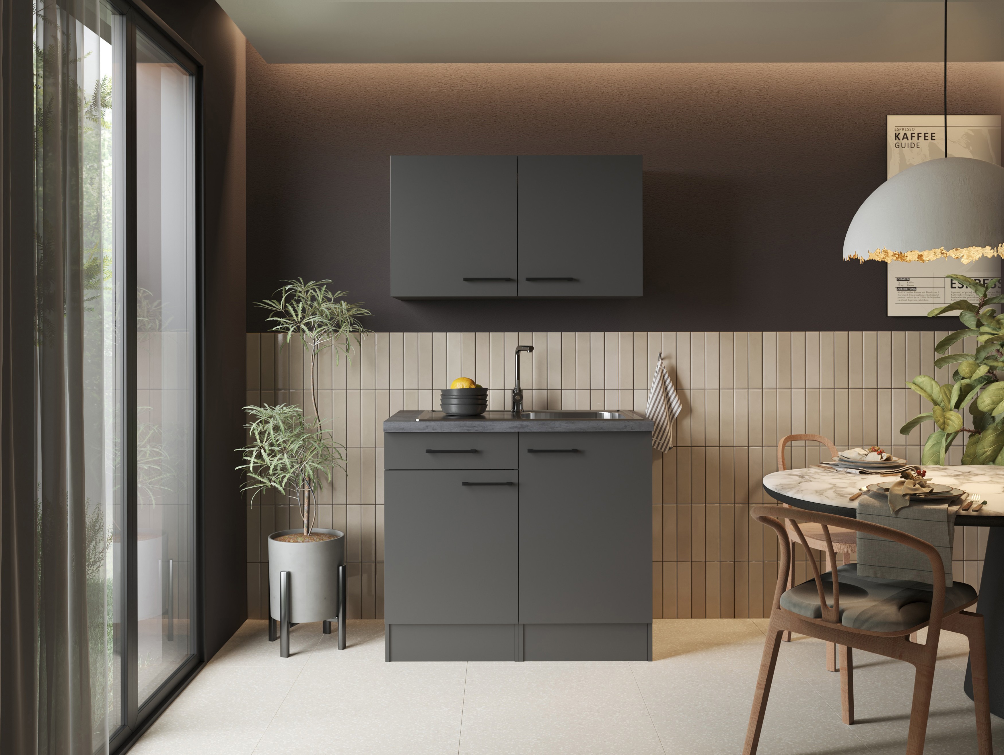 Die moderne und funktionale Kleinküche überzeugt durch zeitloses Design und vielseitige Einsatzmöglichkeiten. Mit ihrem Korpus in Grau Matt, der stilvollen Arbeitsplatte in Granit-Optik und Fronten wahlweise in Grau Matt oder Artisan Eiche Nachbildung fügt sie sich harmonisch in jede Kücheneinrichtung ein. Die Kombination aus Hängeschränken und integrierter Edelstahlspüle macht dieses Set zur idealen Komplettlösung – sowohl als Ergänzung als auch zur eigenständigen Nutzung.