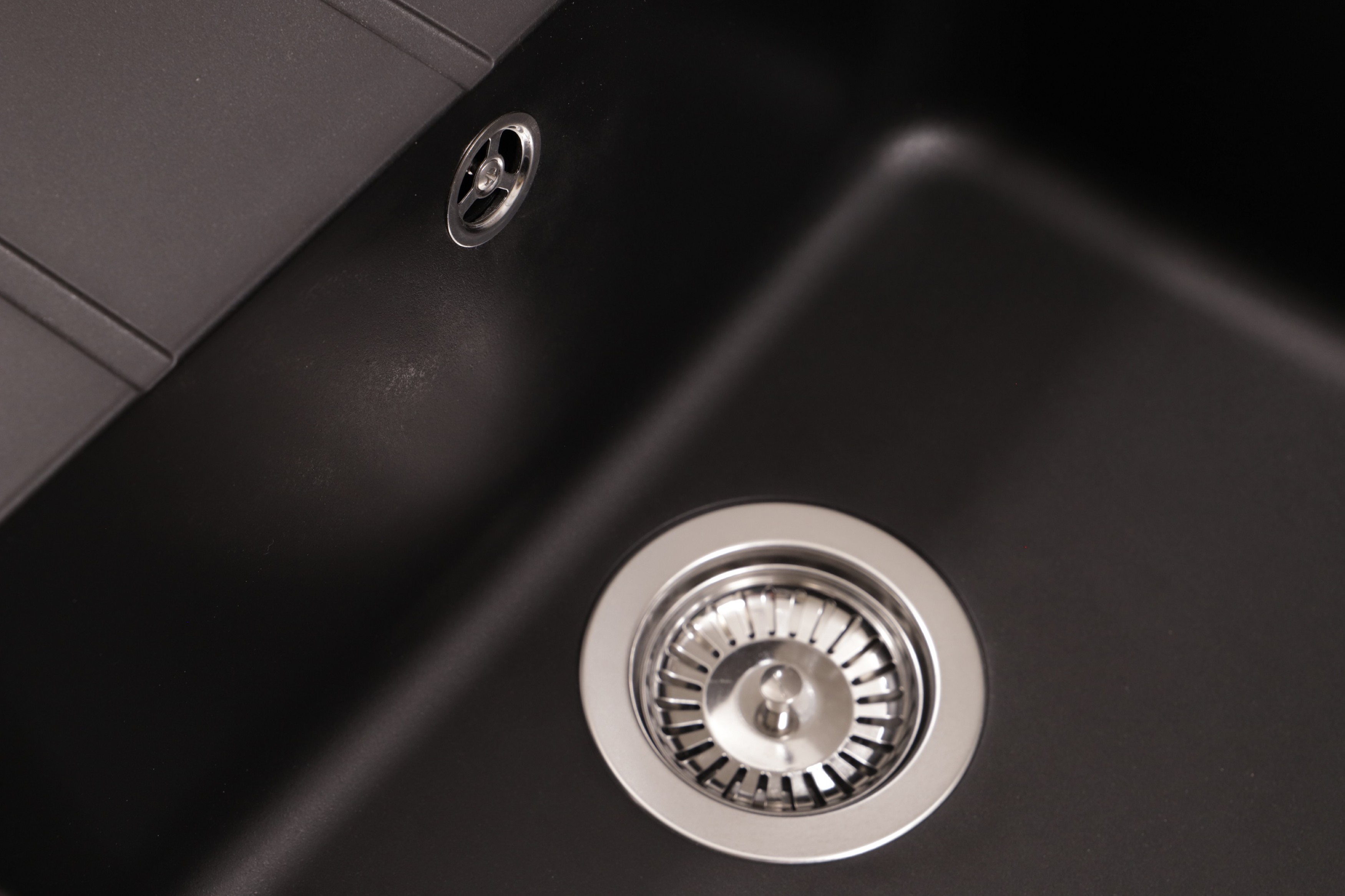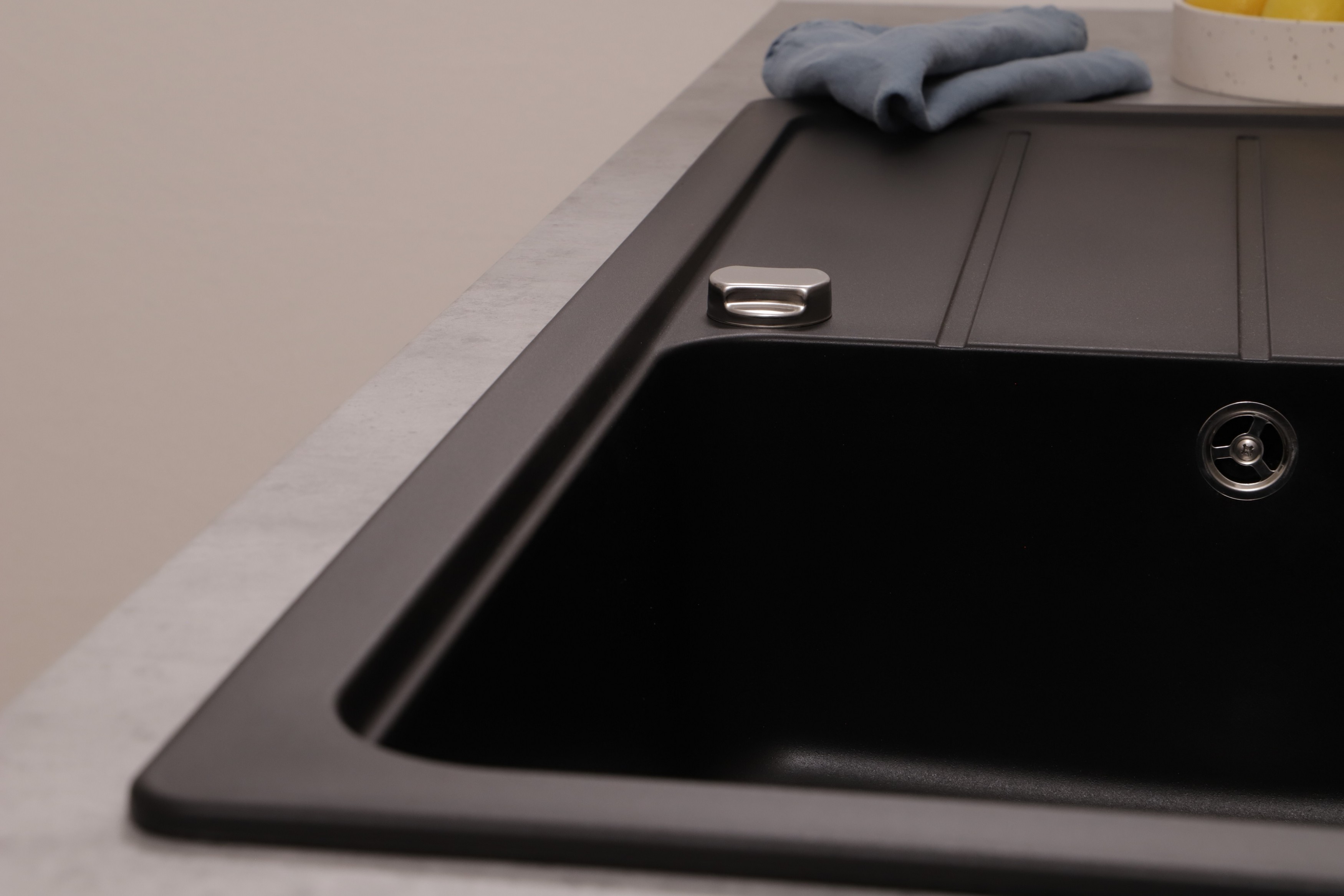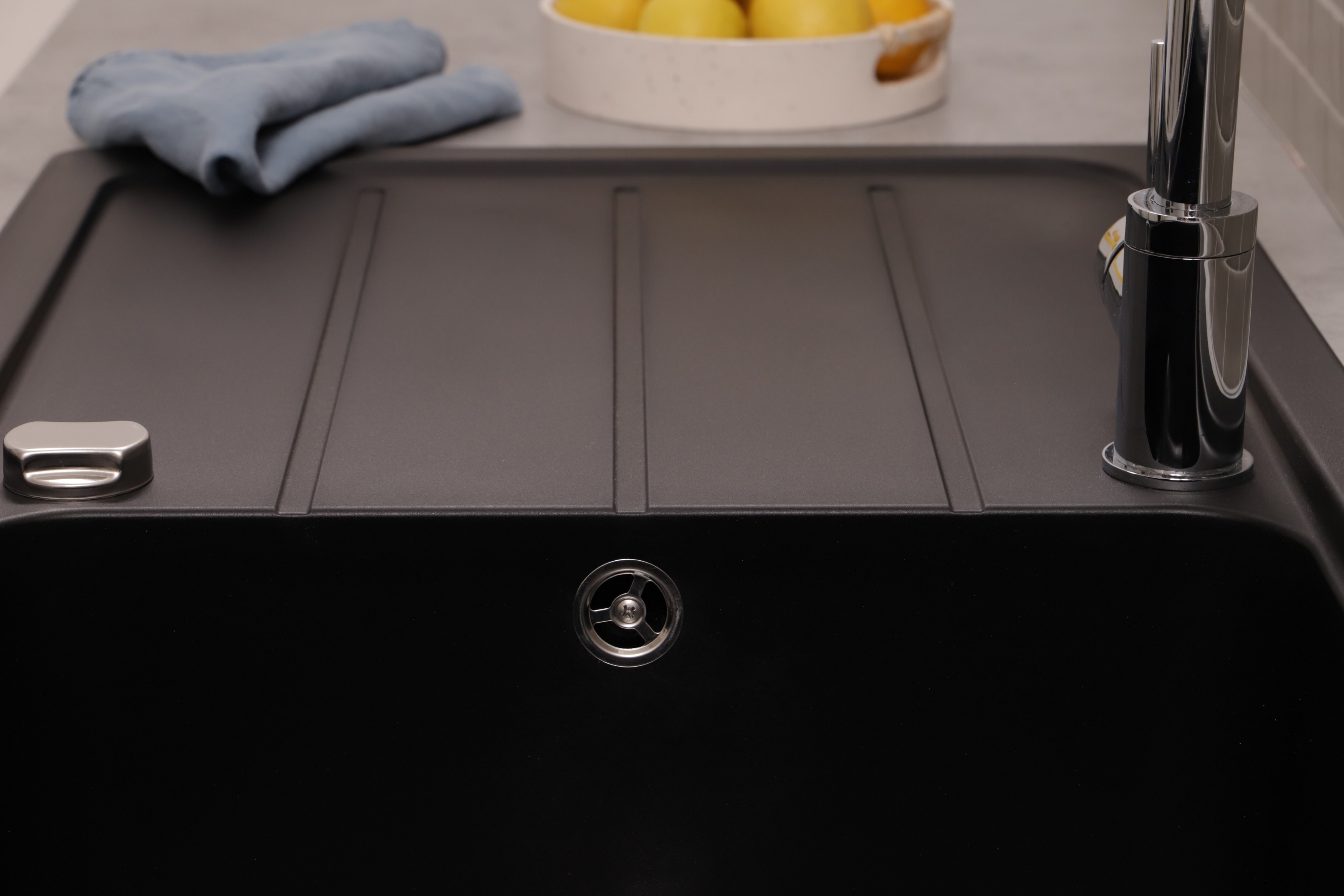 - Langlebiges Material: Die Spüle besteht aus einem Granitverbund-Material, das zu 70 % aus Quarzsand, zu 26 % aus Kunstharz und zu 4 % aus Additiven besteht. Diese Zusammensetzung sorgt für eine außergewöhnliche Beständigkeit gegen Kratzer, Stöße und aggressive Chemikalien.