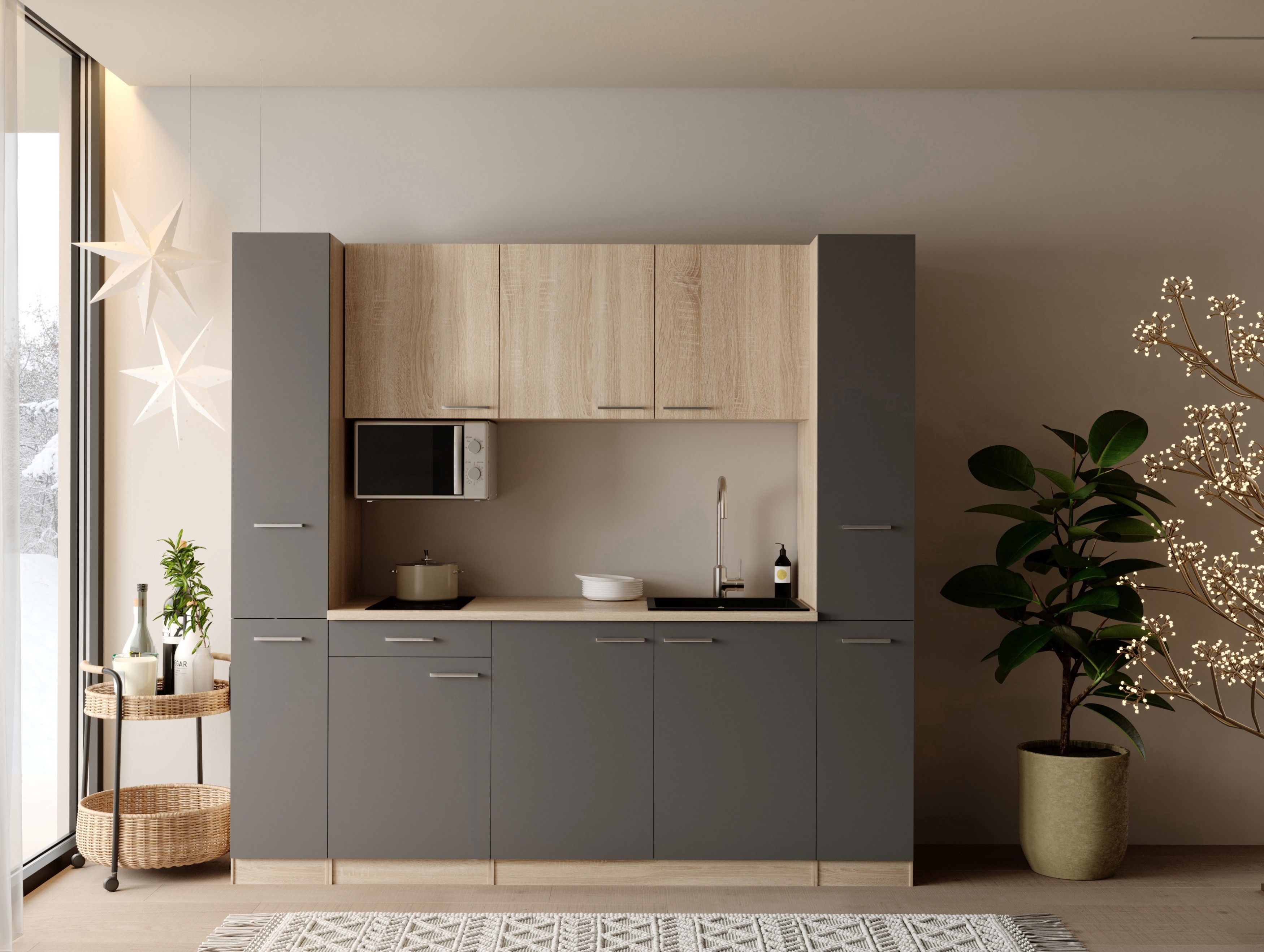 Singleküche Ingrid – 210 cm kompakte Komplettküche in Eiche Nordic mit Glaskeramikkochfeld und Mikrowelle