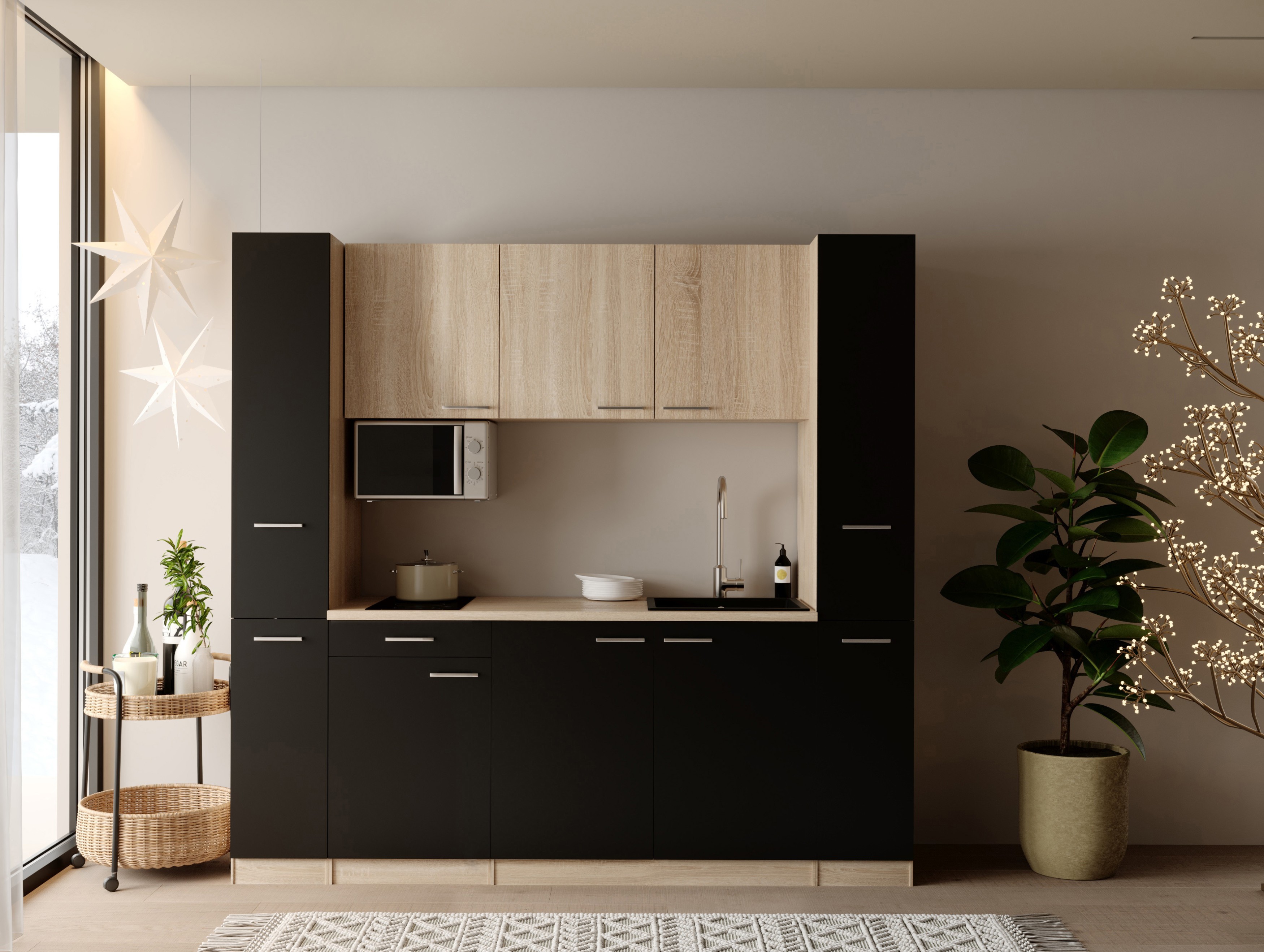 Mit einer Breite von 210 cm ist Ingrid die ideale Lösung für kleine Küchenräume, Apartments oder Büros. Trotz ihrer kompakten Maße bietet sie durchdachten Stauraum und praktische Ausstattung, darunter ein Domino-Glaskeramikkochfeld sowie eine hochwertige schwarze Mineralite-Einbauspüle.