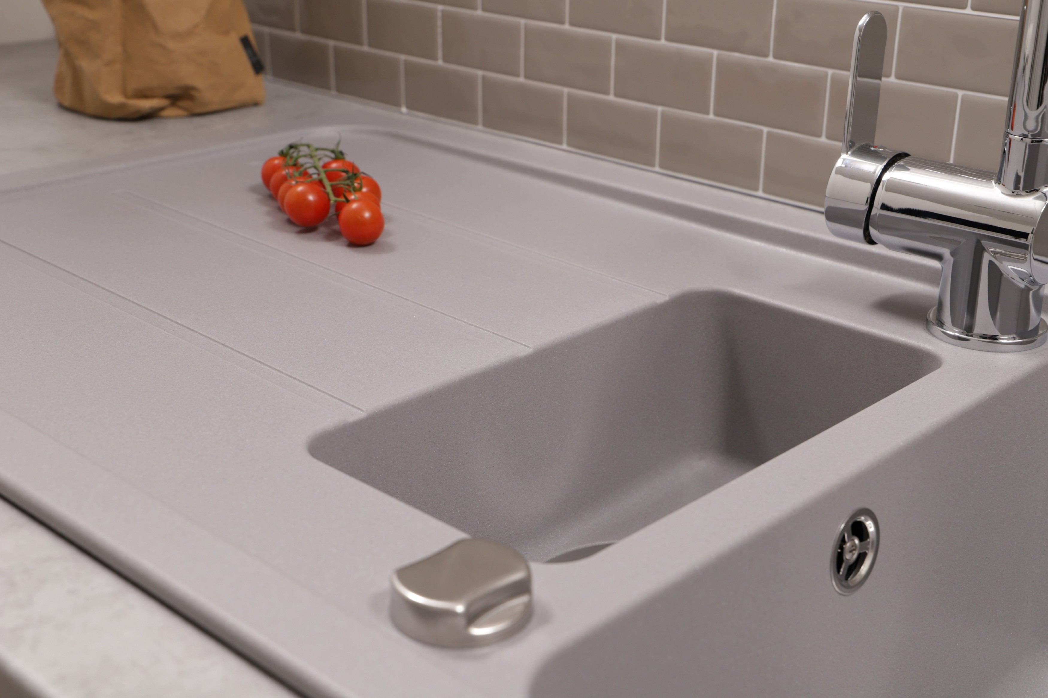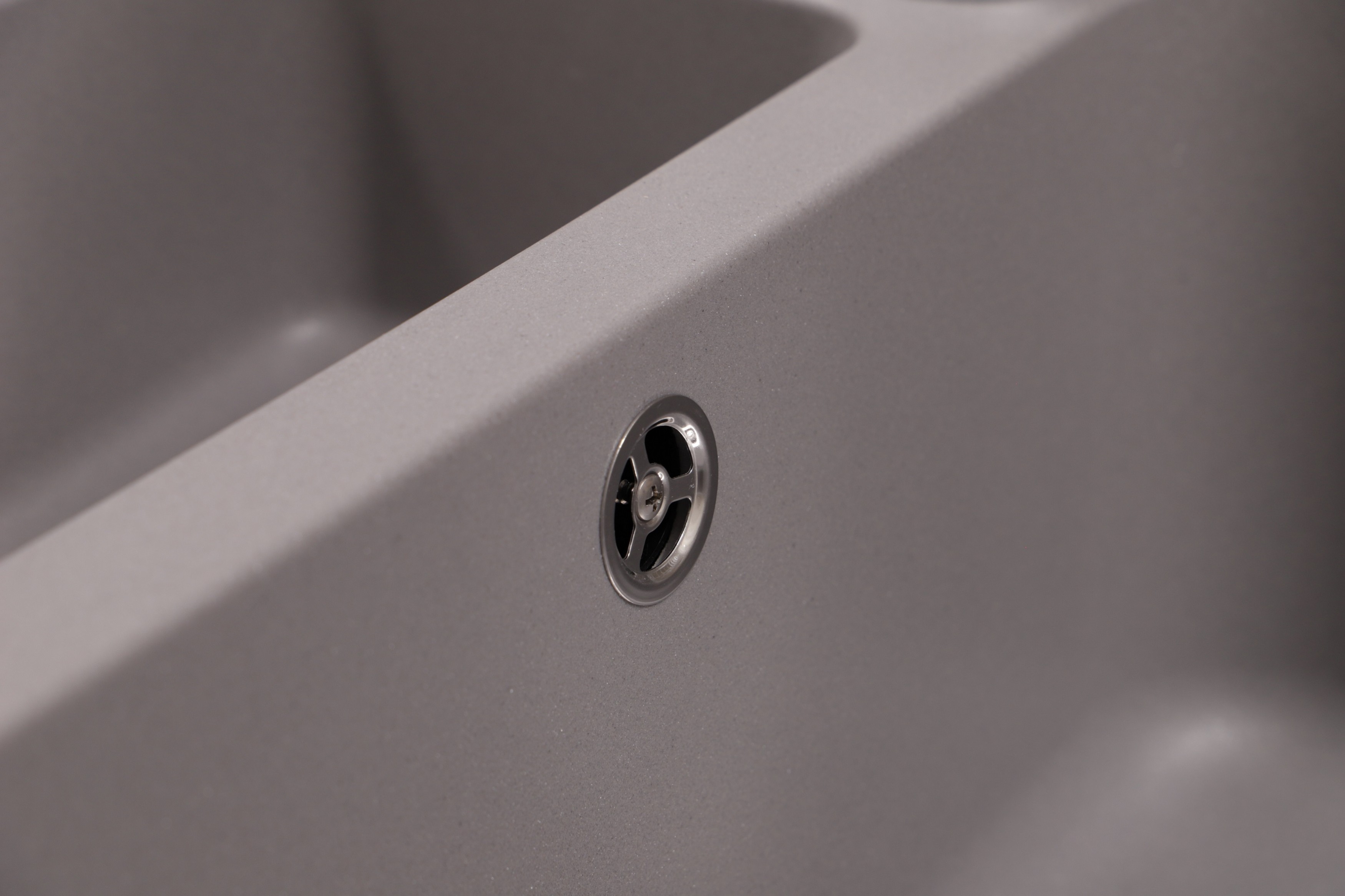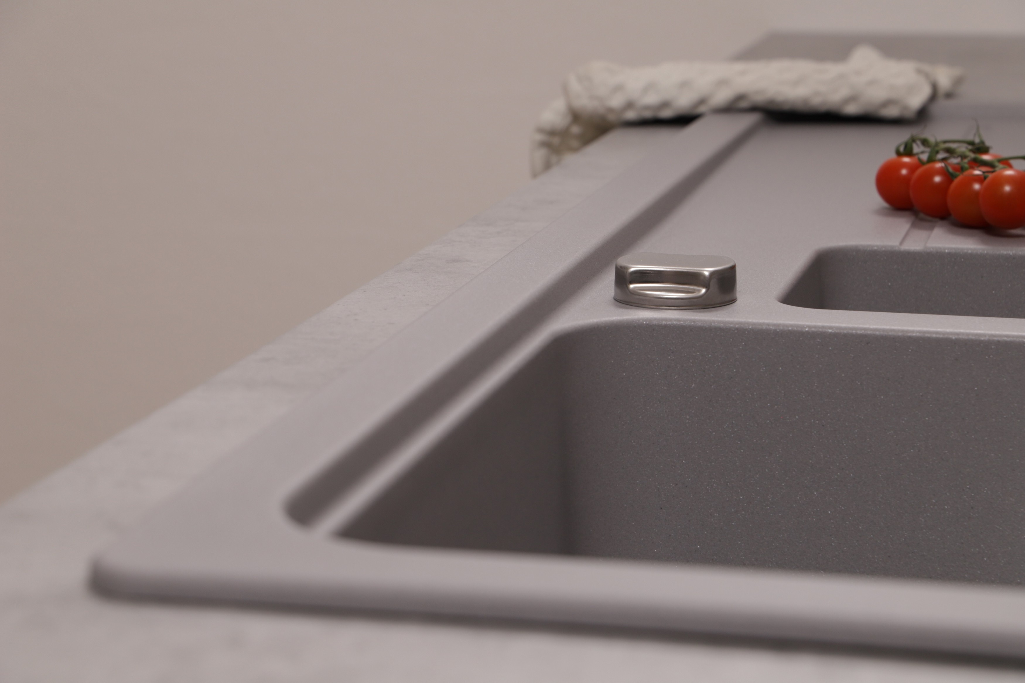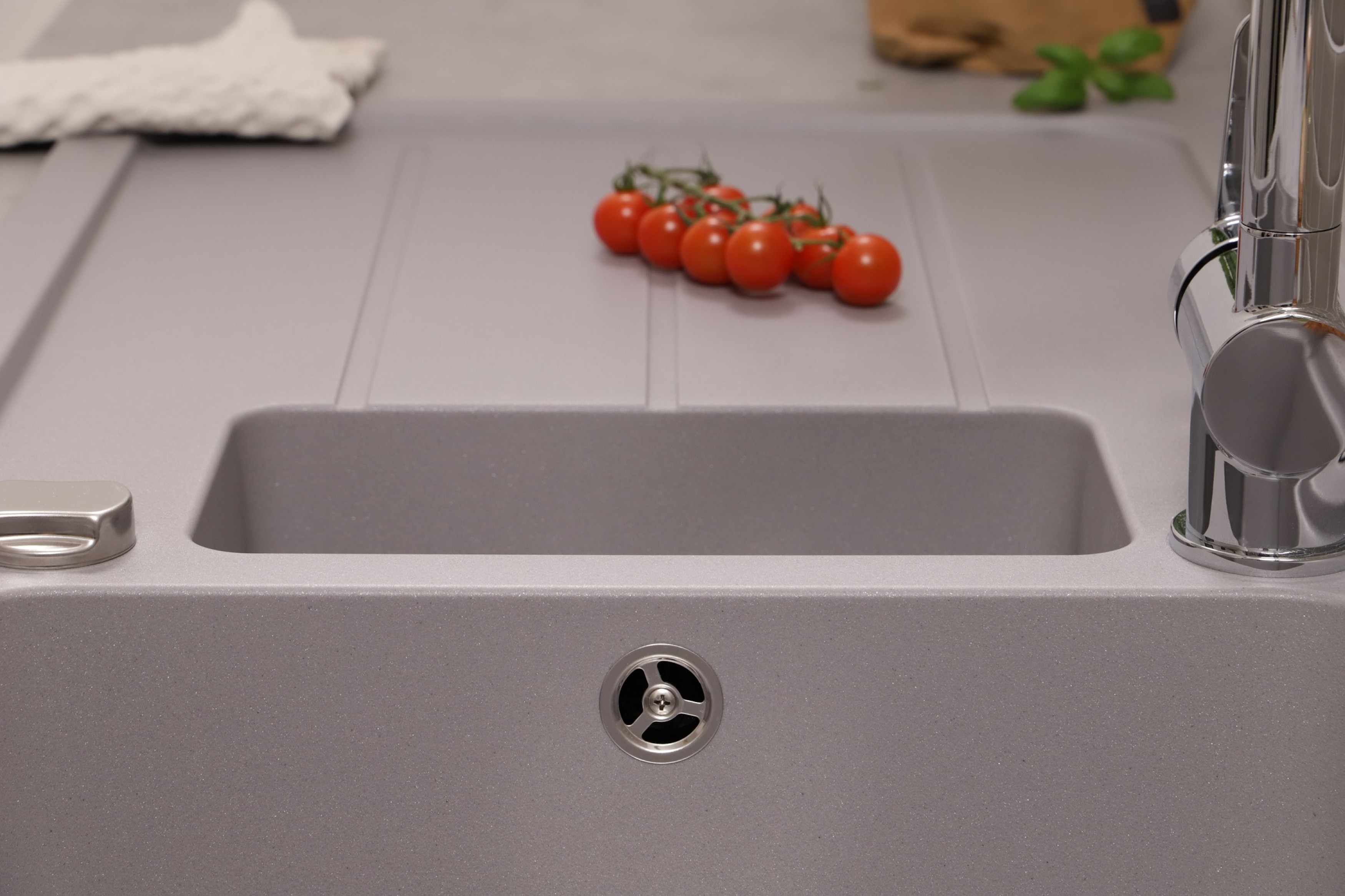 - Langlebiges Material: Die Spüle besteht aus einem Granitverbund-Material, das zu 70 % aus Quarzsand, zu 26 % aus Kunstharz und zu 4 % aus Additiven besteht. Diese Zusammensetzung sorgt für eine außergewöhnliche Beständigkeit gegen Kratzer, Stöße und aggressive Chemikalien.
