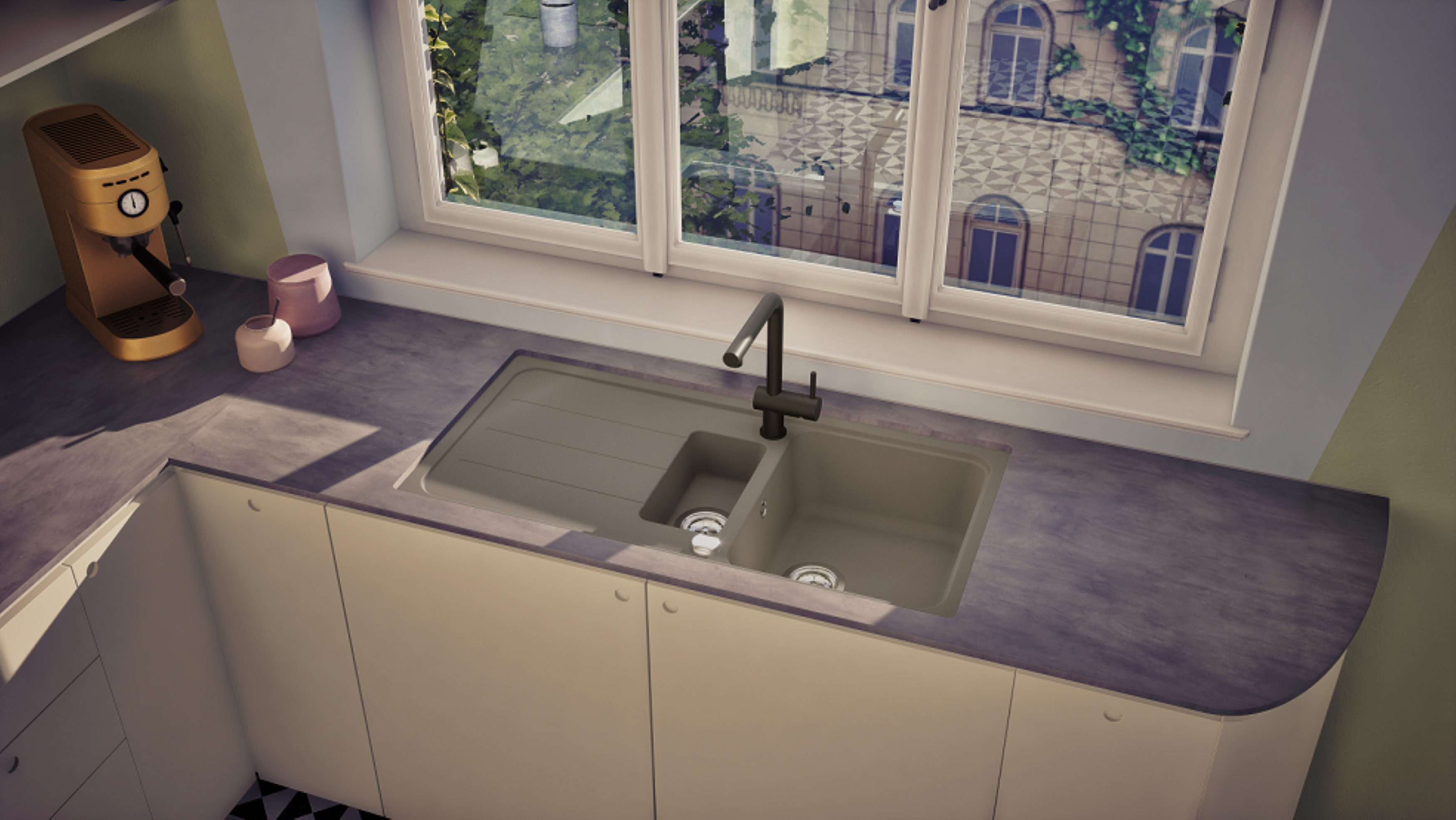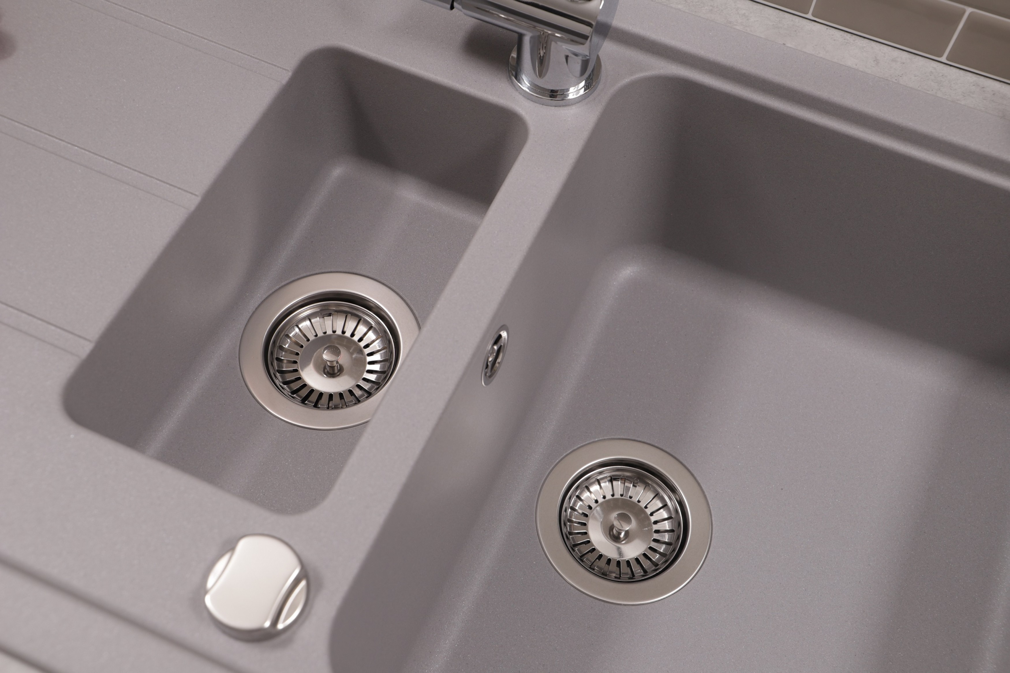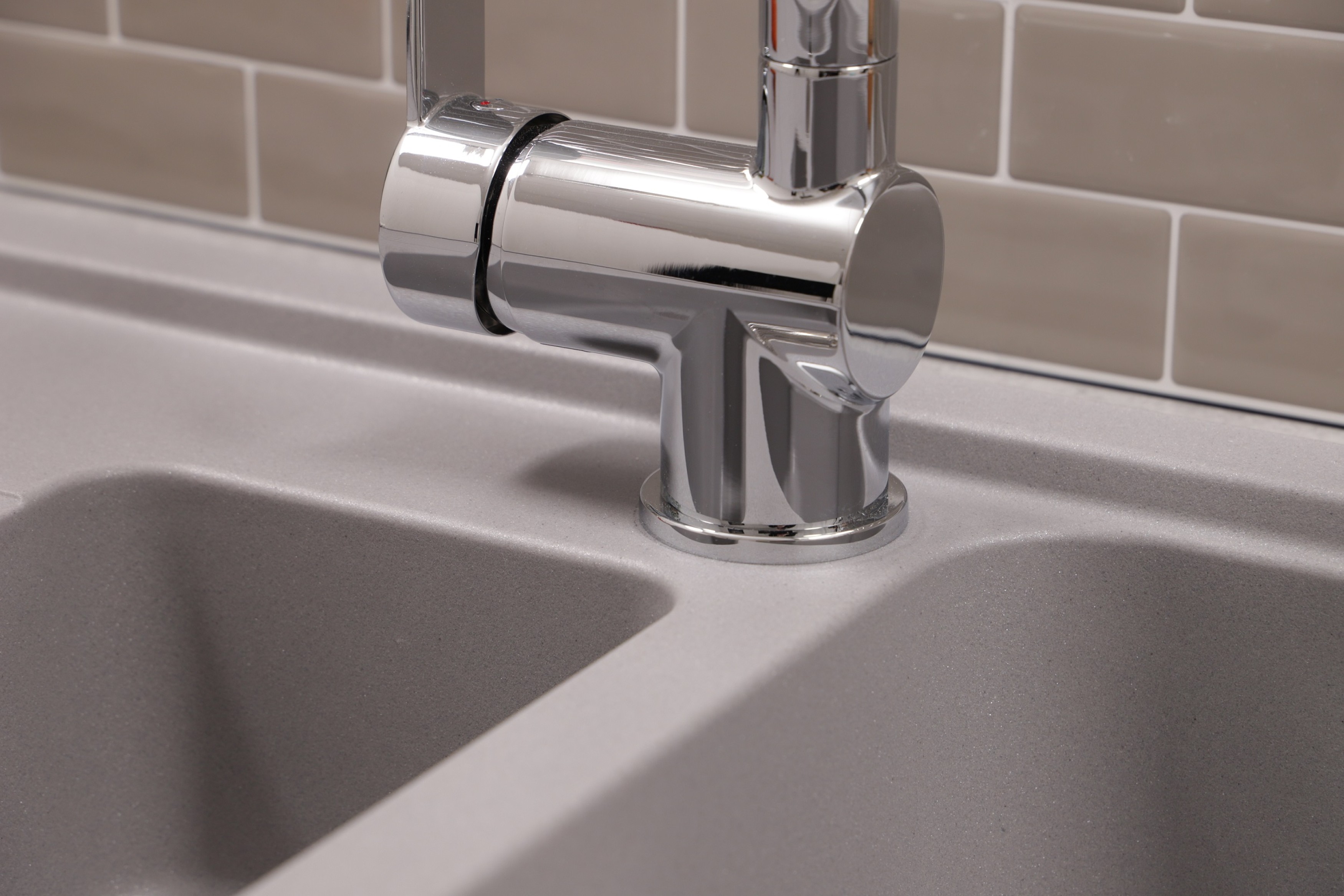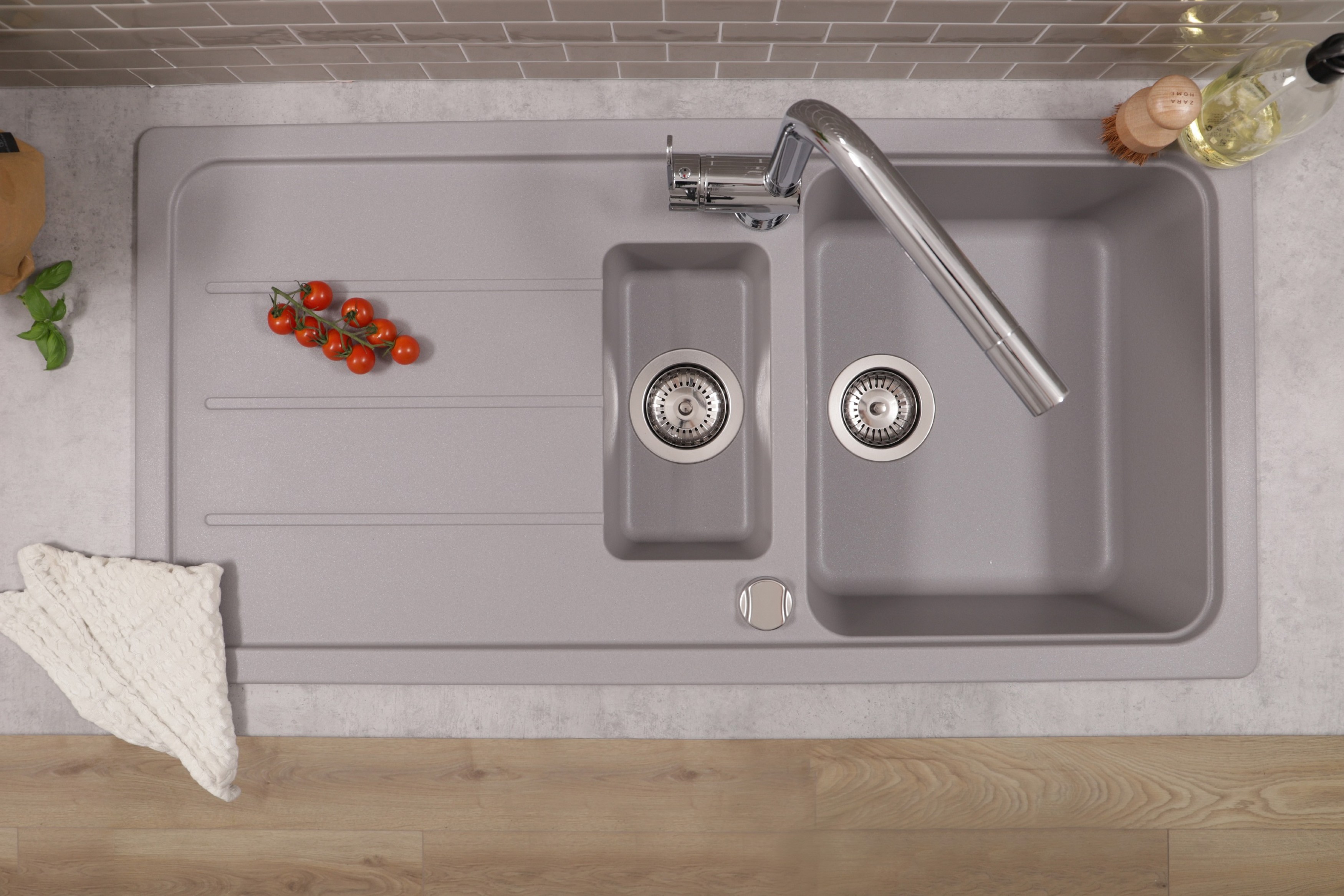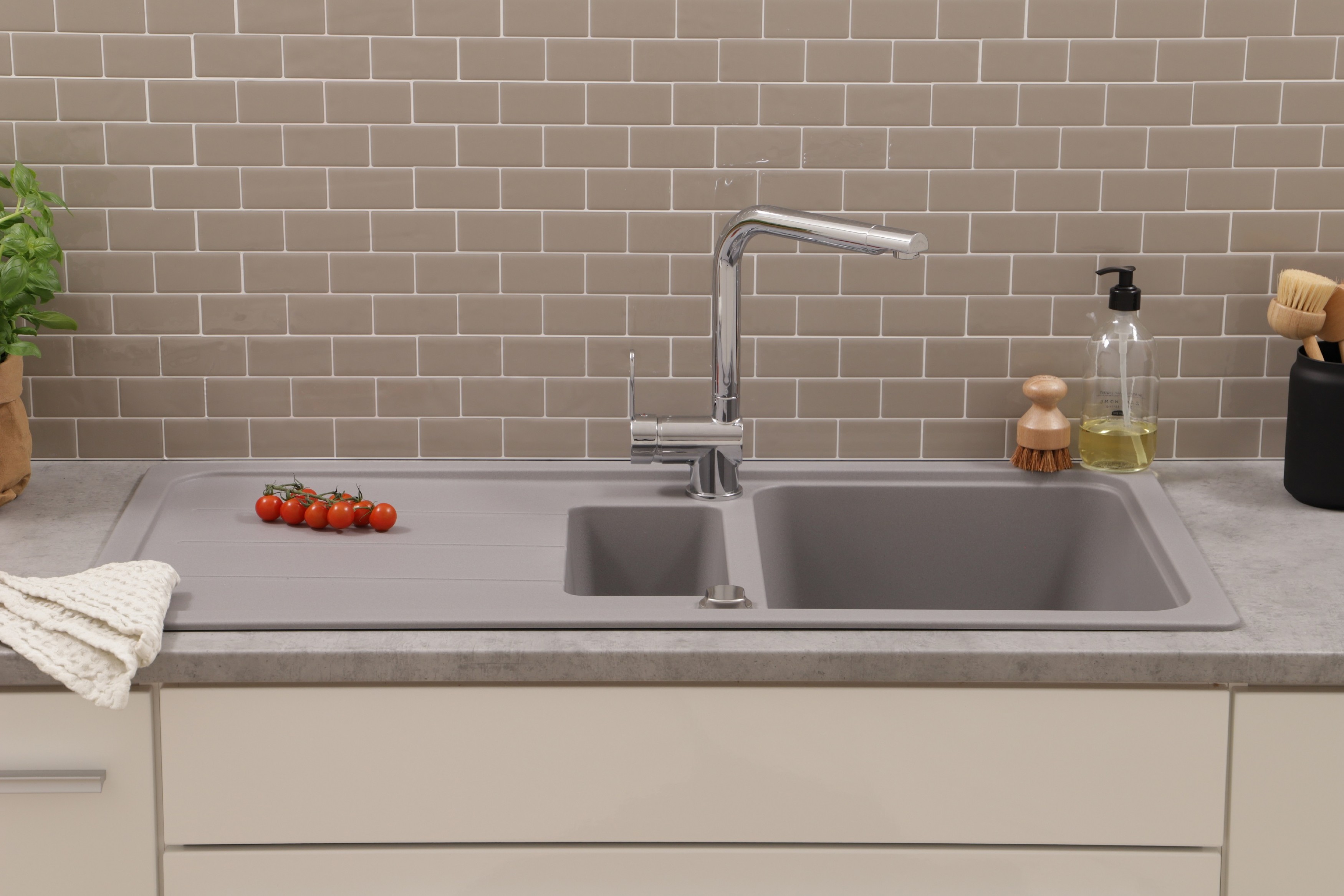 - Langlebiges Material: Die Spüle besteht aus einem Granitverbund-Material, das zu 70 % aus Quarzsand, zu 26 % aus Kunstharz und zu 4 % aus Additiven besteht. Diese Zusammensetzung sorgt für eine außergewöhnliche Beständigkeit gegen Kratzer, Stöße und aggressive Chemikalien.
