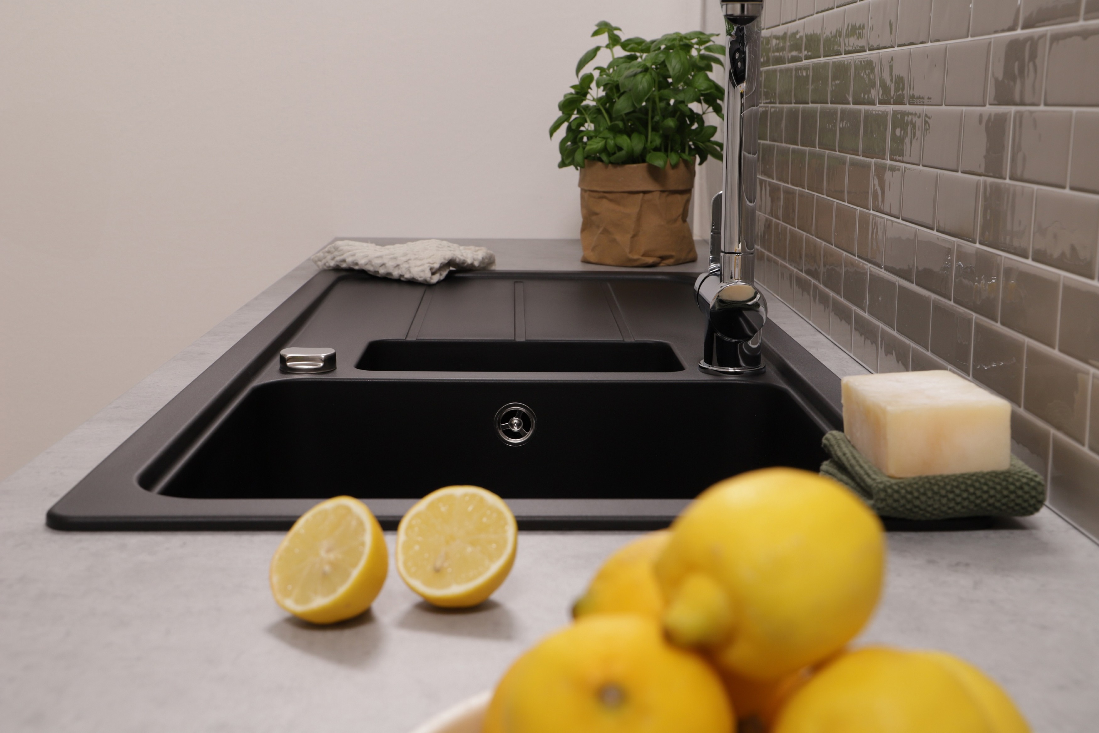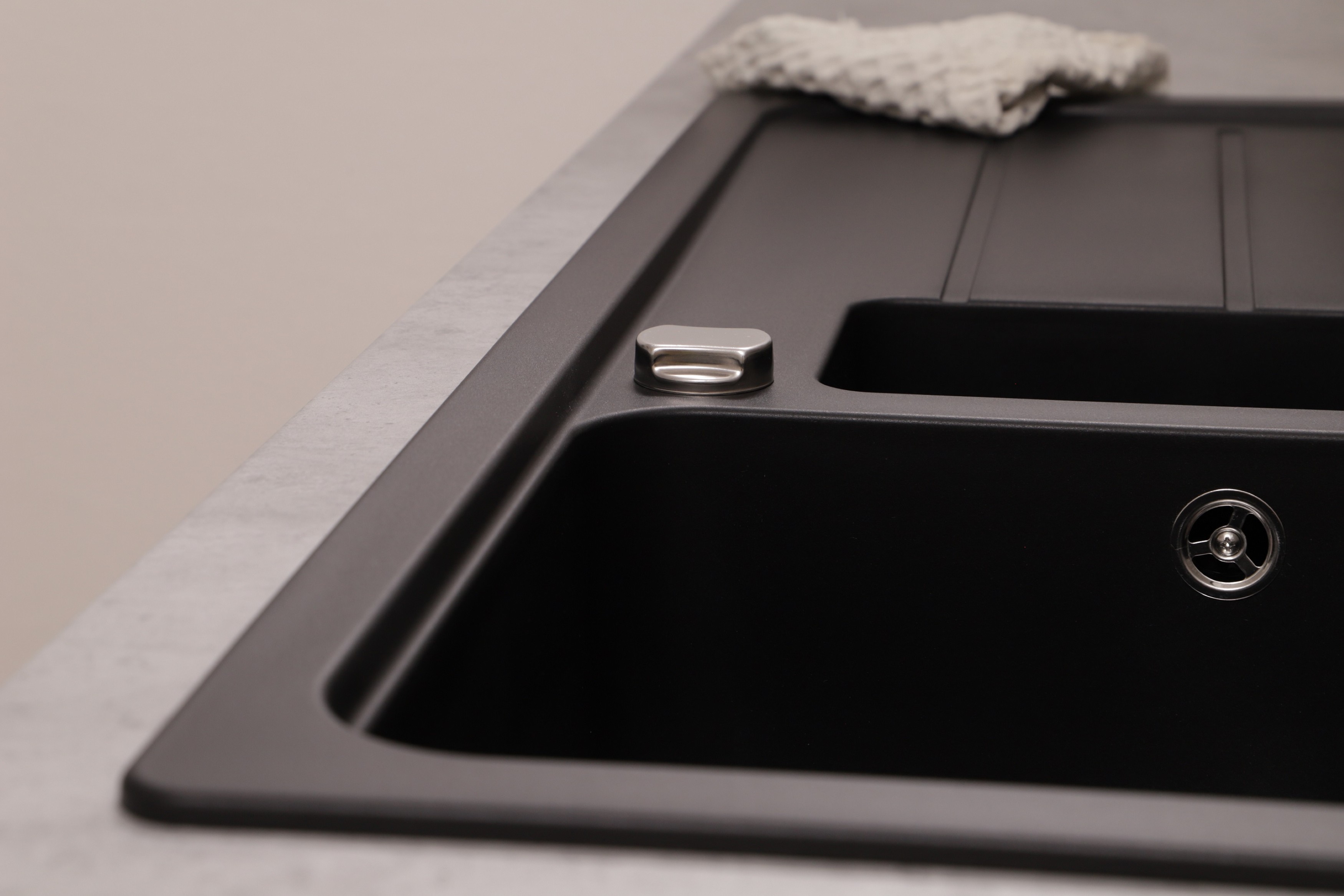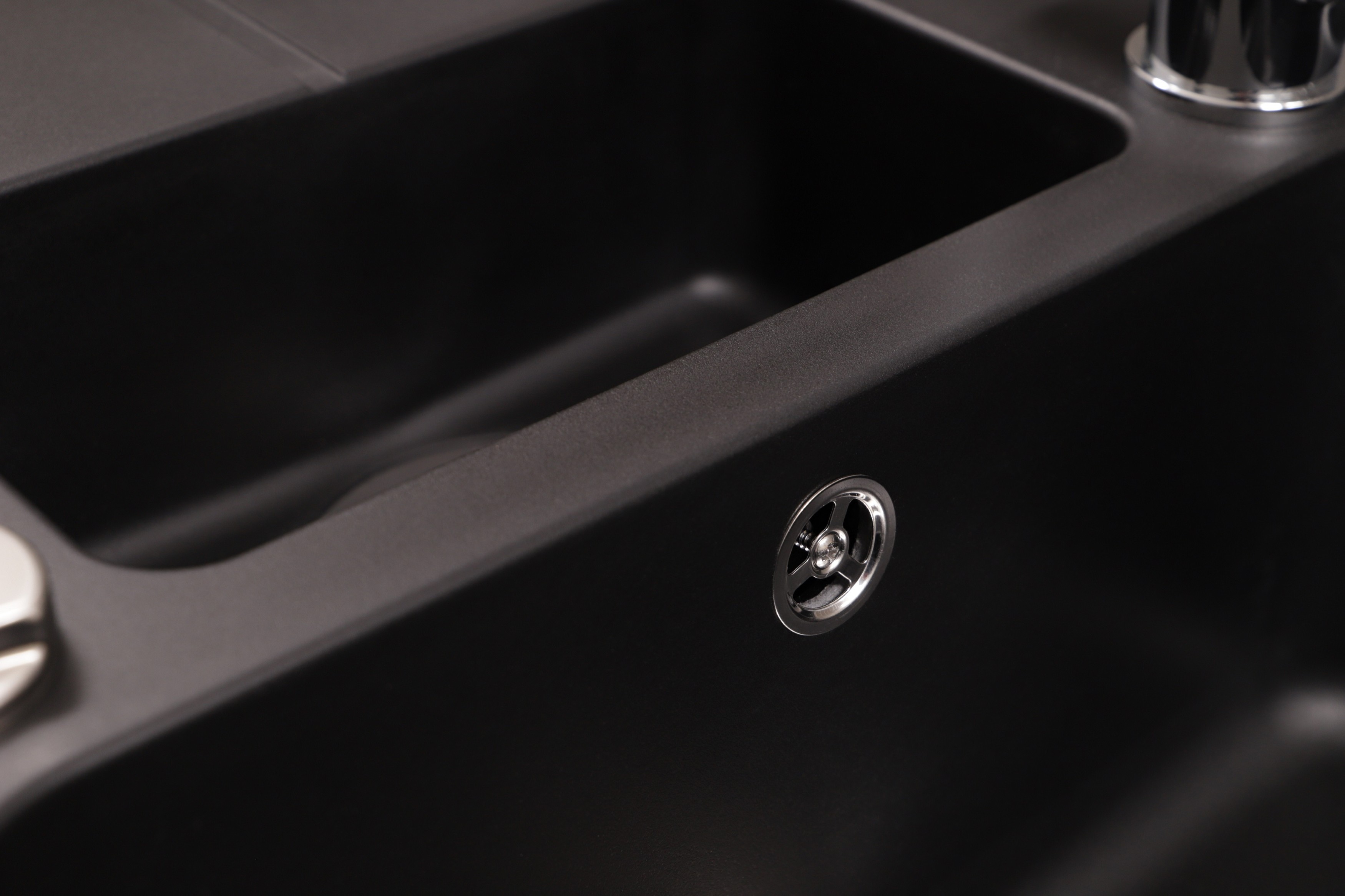 - Langlebiges Material: Die Spüle besteht aus einem Granitverbund-Material, das zu 70 % aus Quarzsand, zu 26 % aus Kunstharz und zu 4 % aus Additiven besteht. Diese Zusammensetzung sorgt für eine außergewöhnliche Beständigkeit gegen Kratzer, Stöße und aggressive Chemikalien.