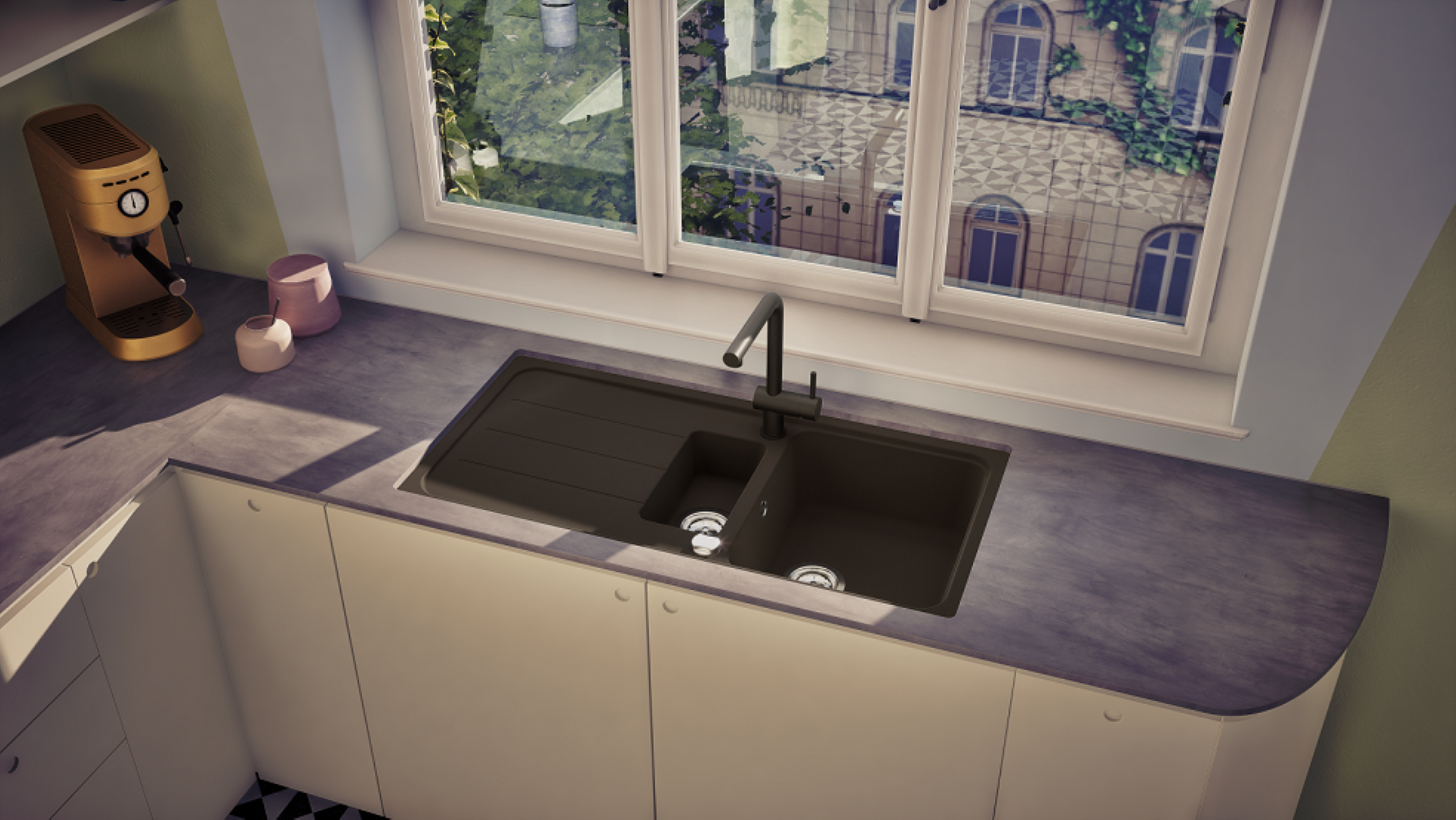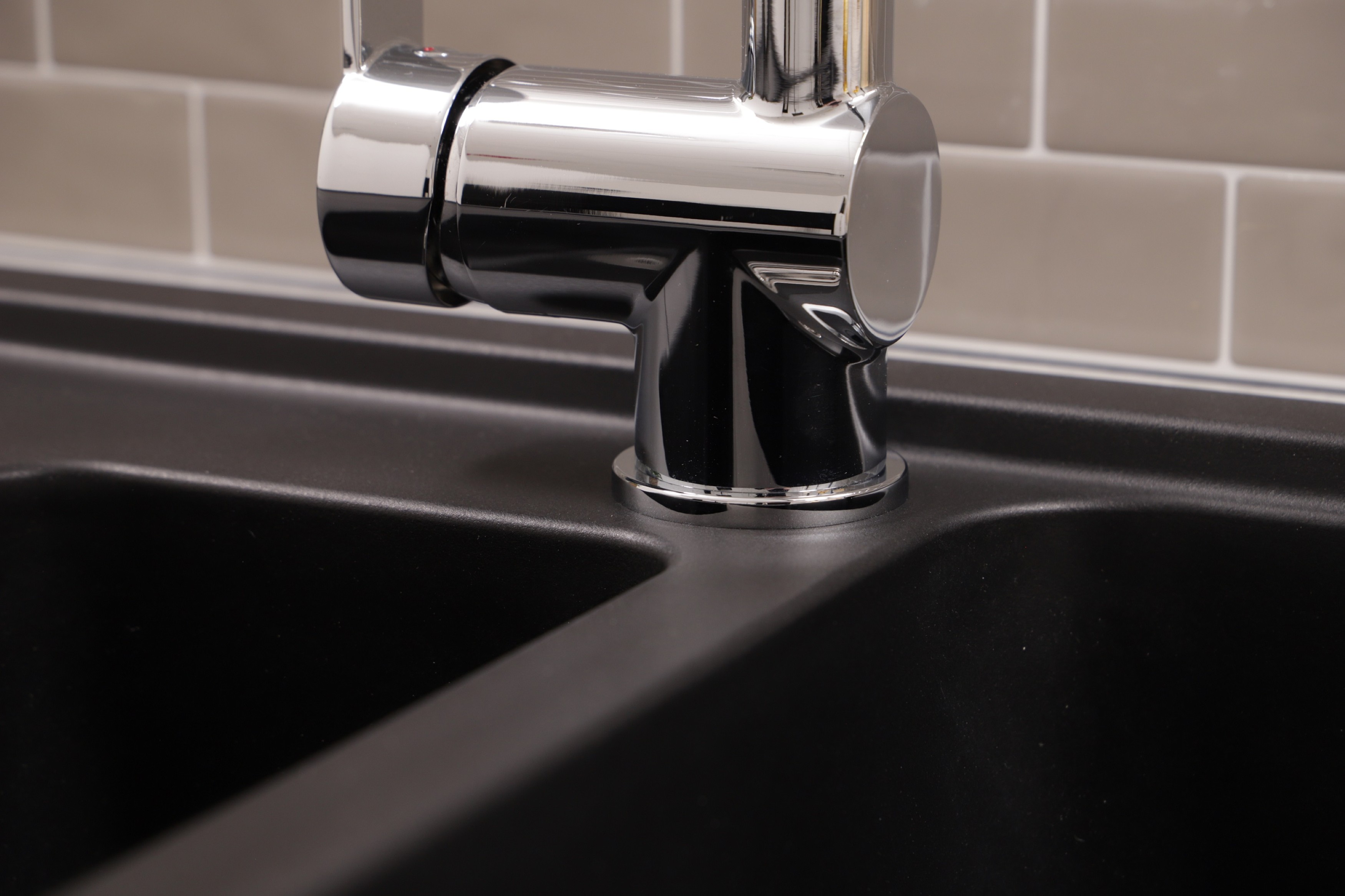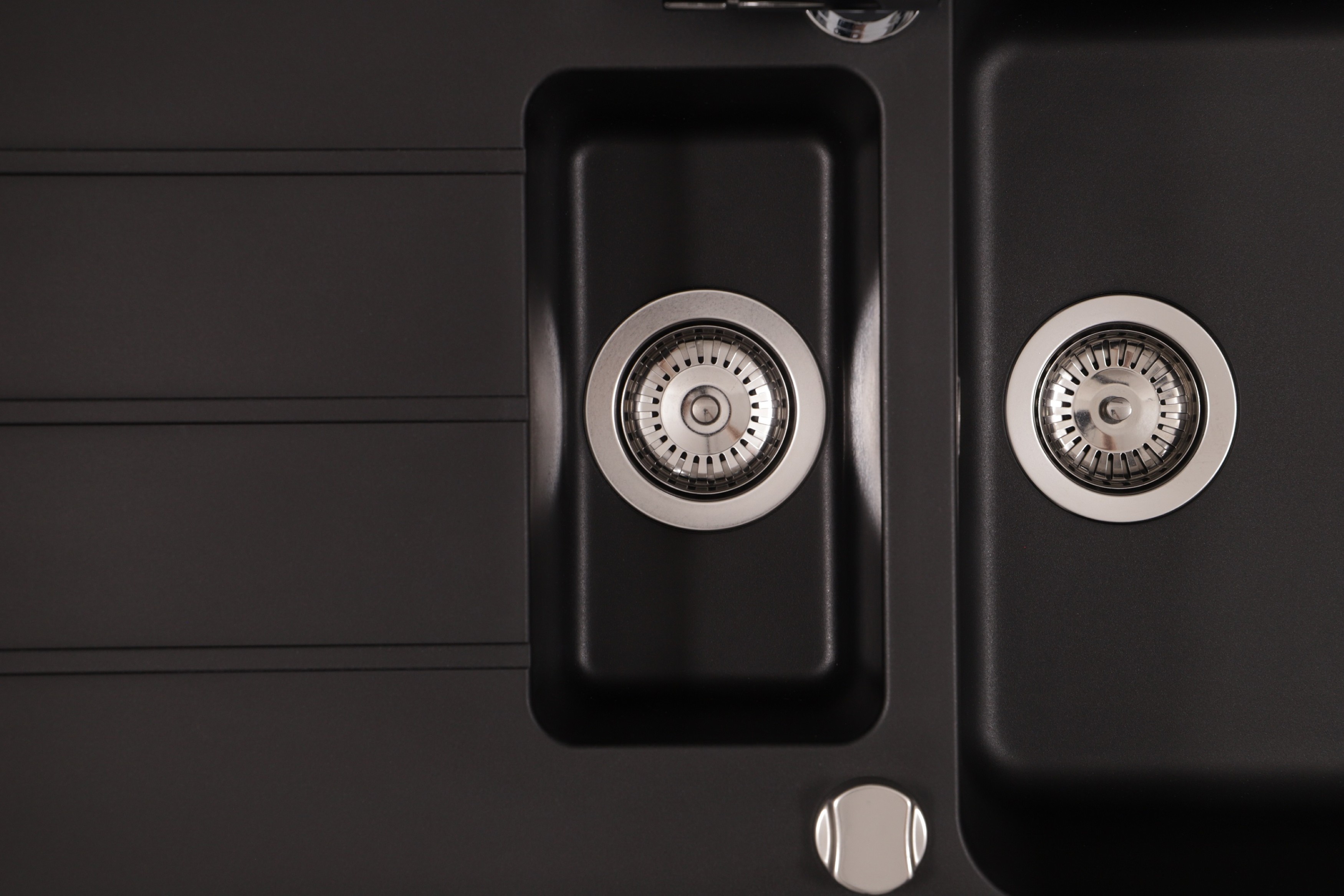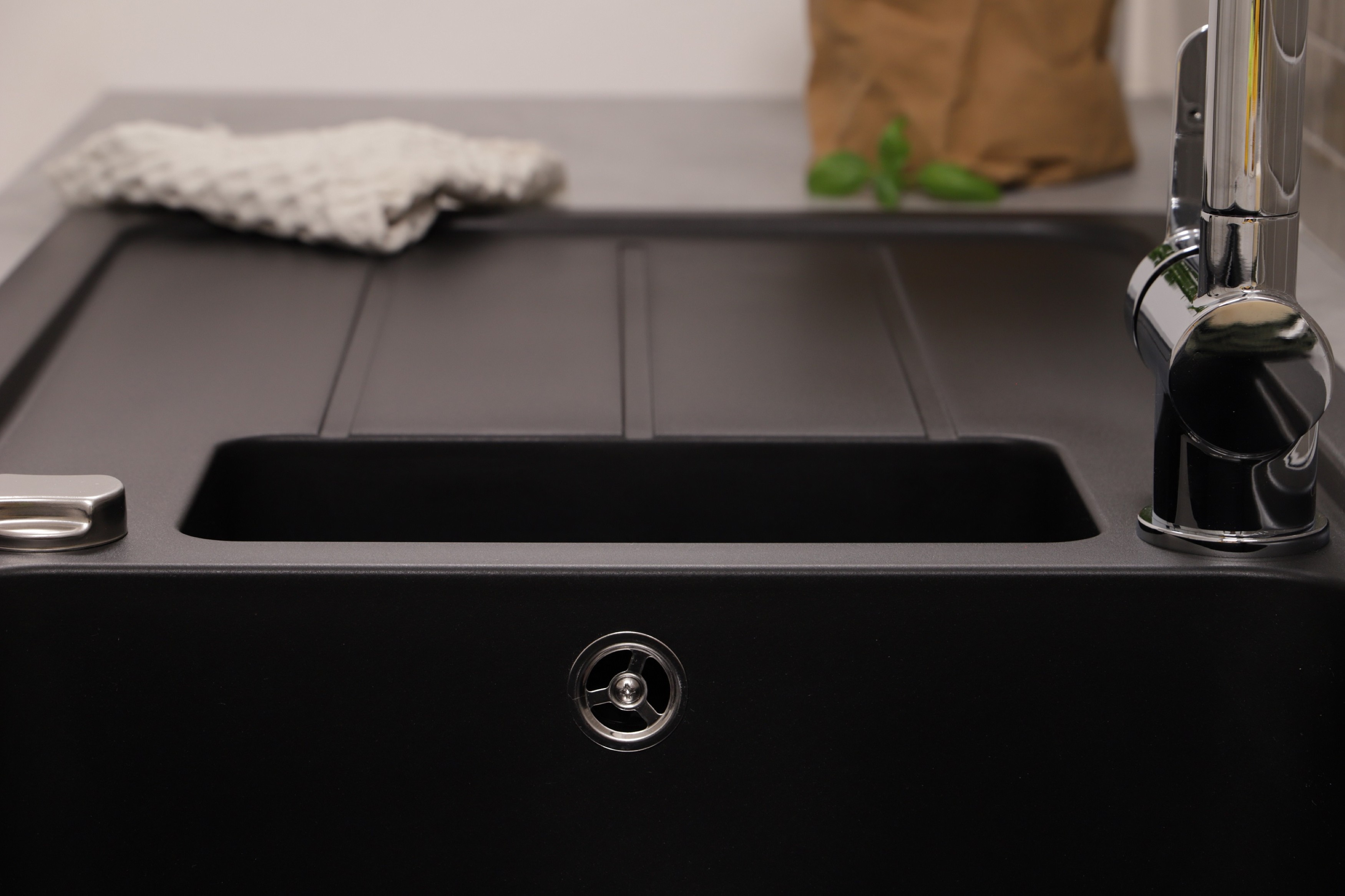 - Langlebiges Material: Die Spüle besteht aus einem Granitverbund-Material, das zu 70 % aus Quarzsand, zu 26 % aus Kunstharz und zu 4 % aus Additiven besteht. Diese Zusammensetzung sorgt für eine außergewöhnliche Beständigkeit gegen Kratzer, Stöße und aggressive Chemikalien.
