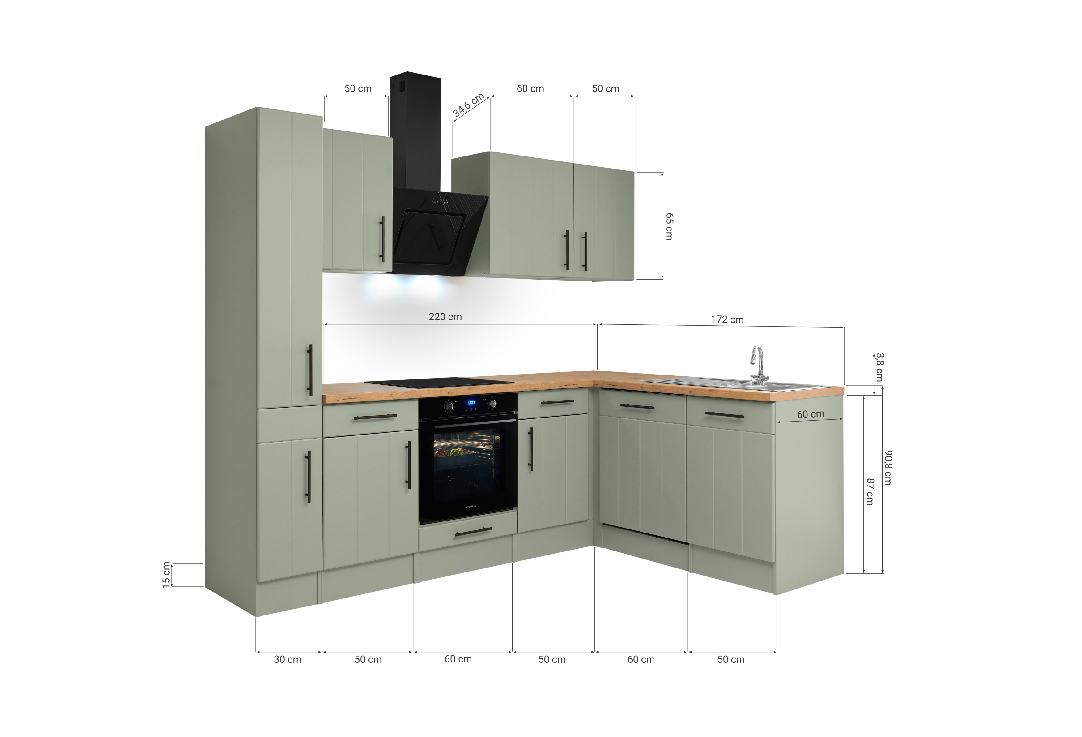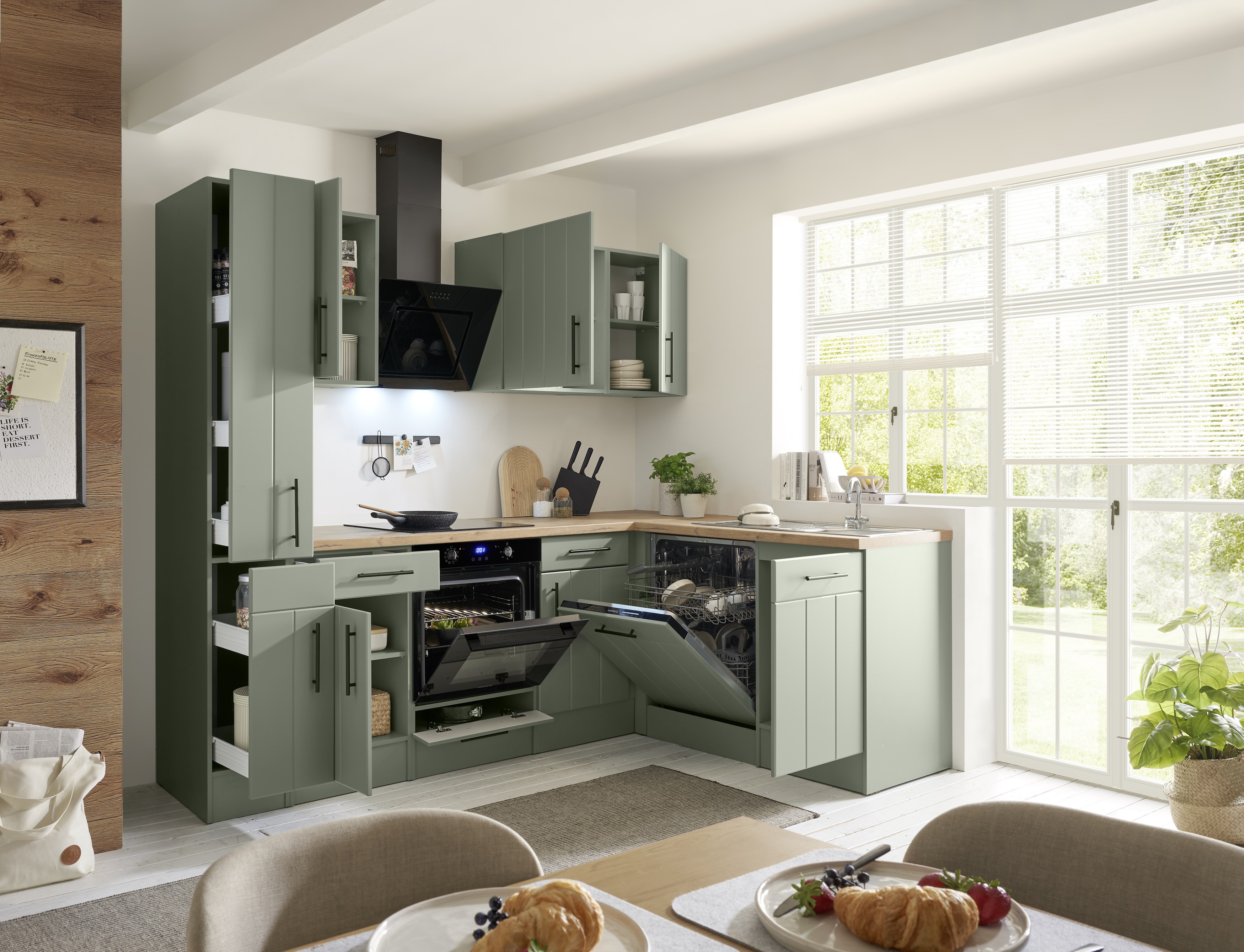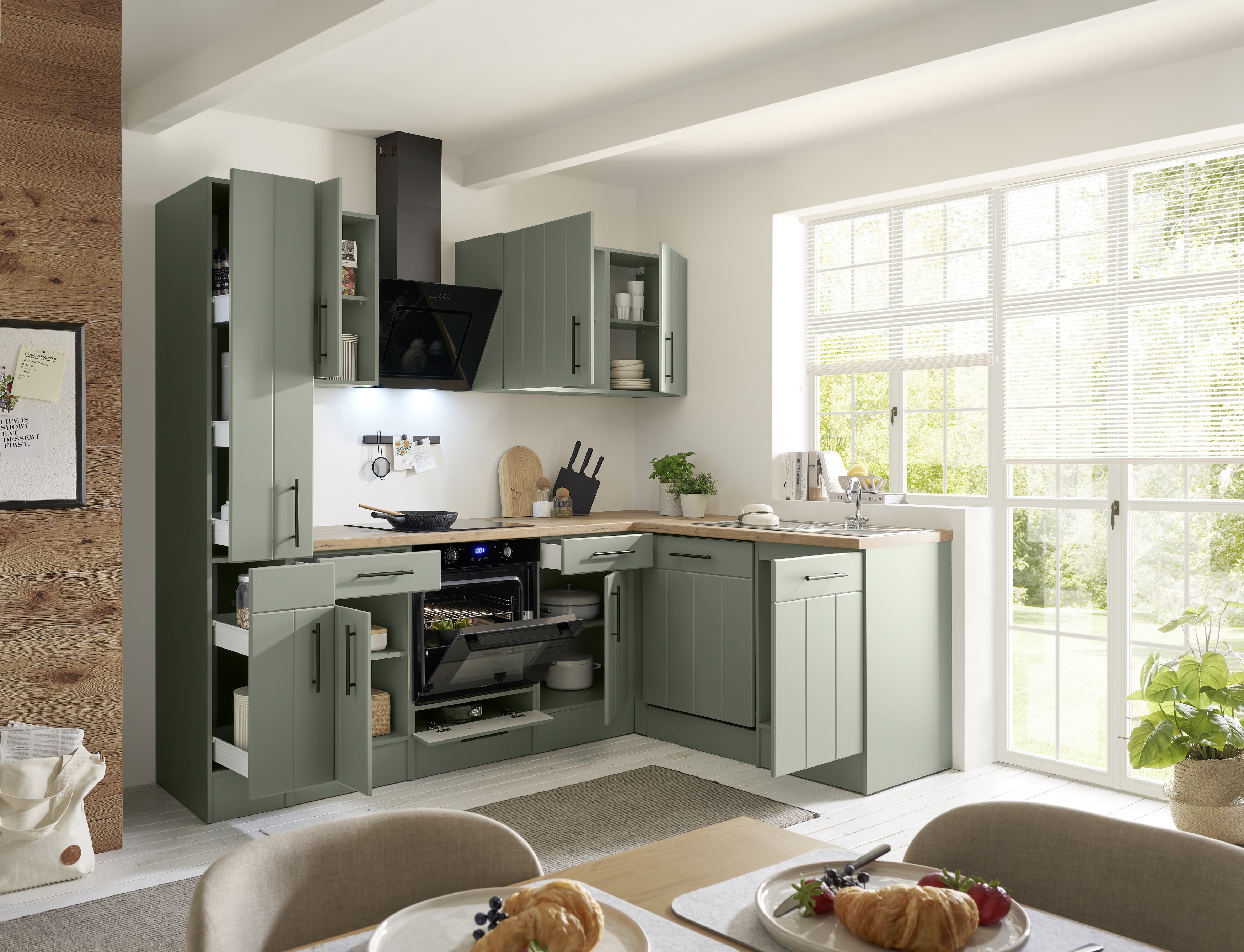 Winkelküche Anton – 250 x 172 cm Landhausküche in Schilfgrün mit Induktionskochfeld