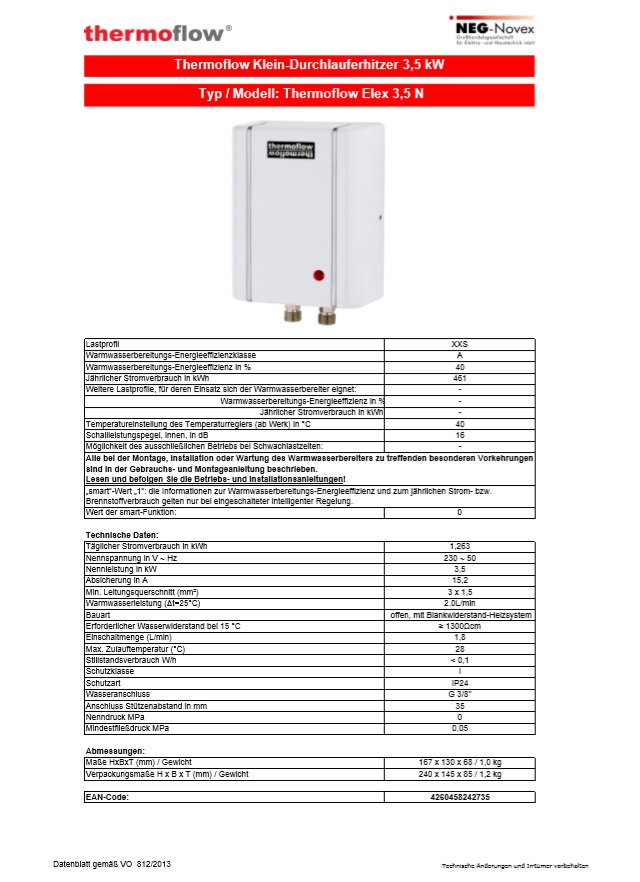 Properties "Thermoflow instantaneous water heater Small instantaneous water heater low pressure Elex 3.5 kW"
