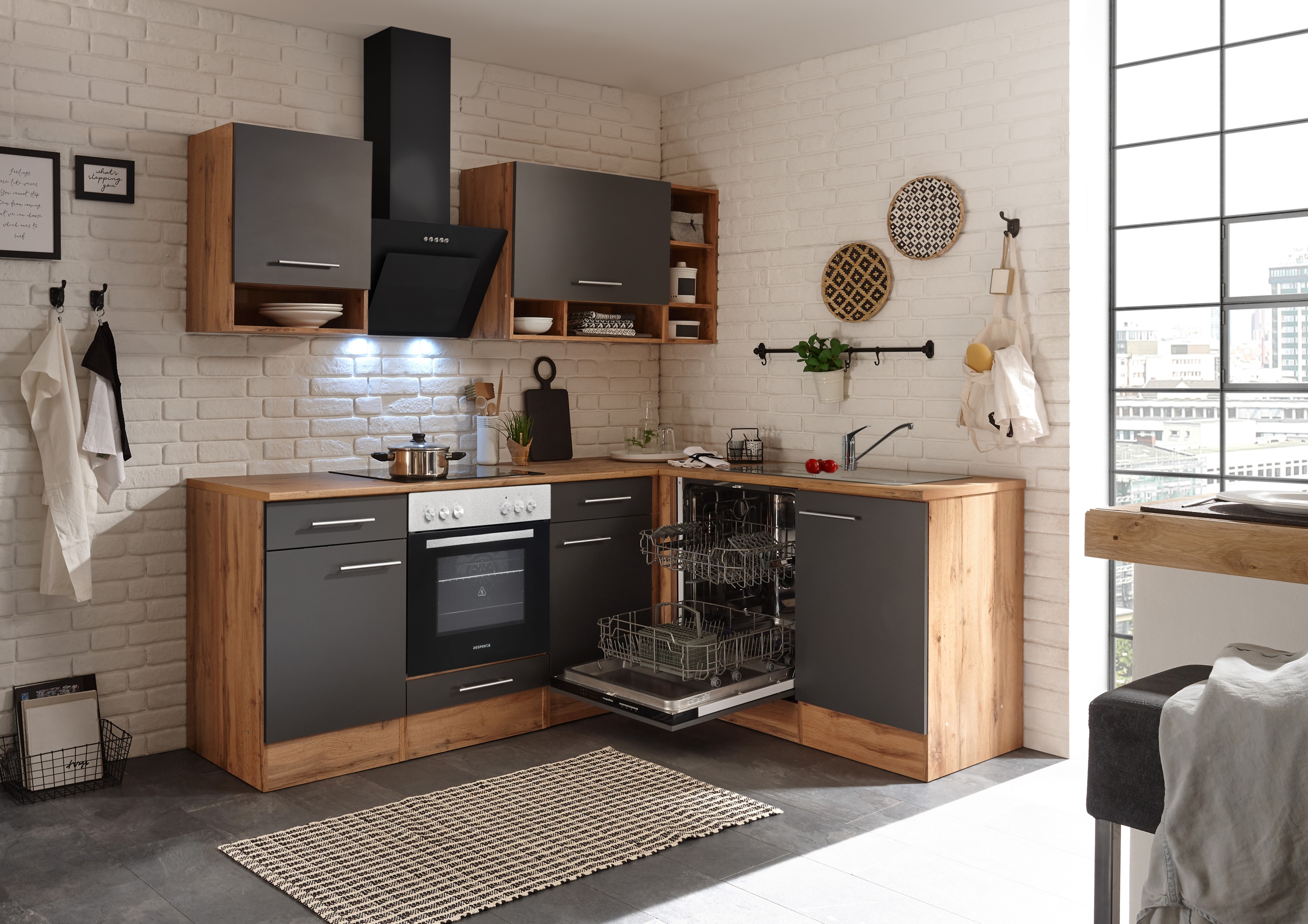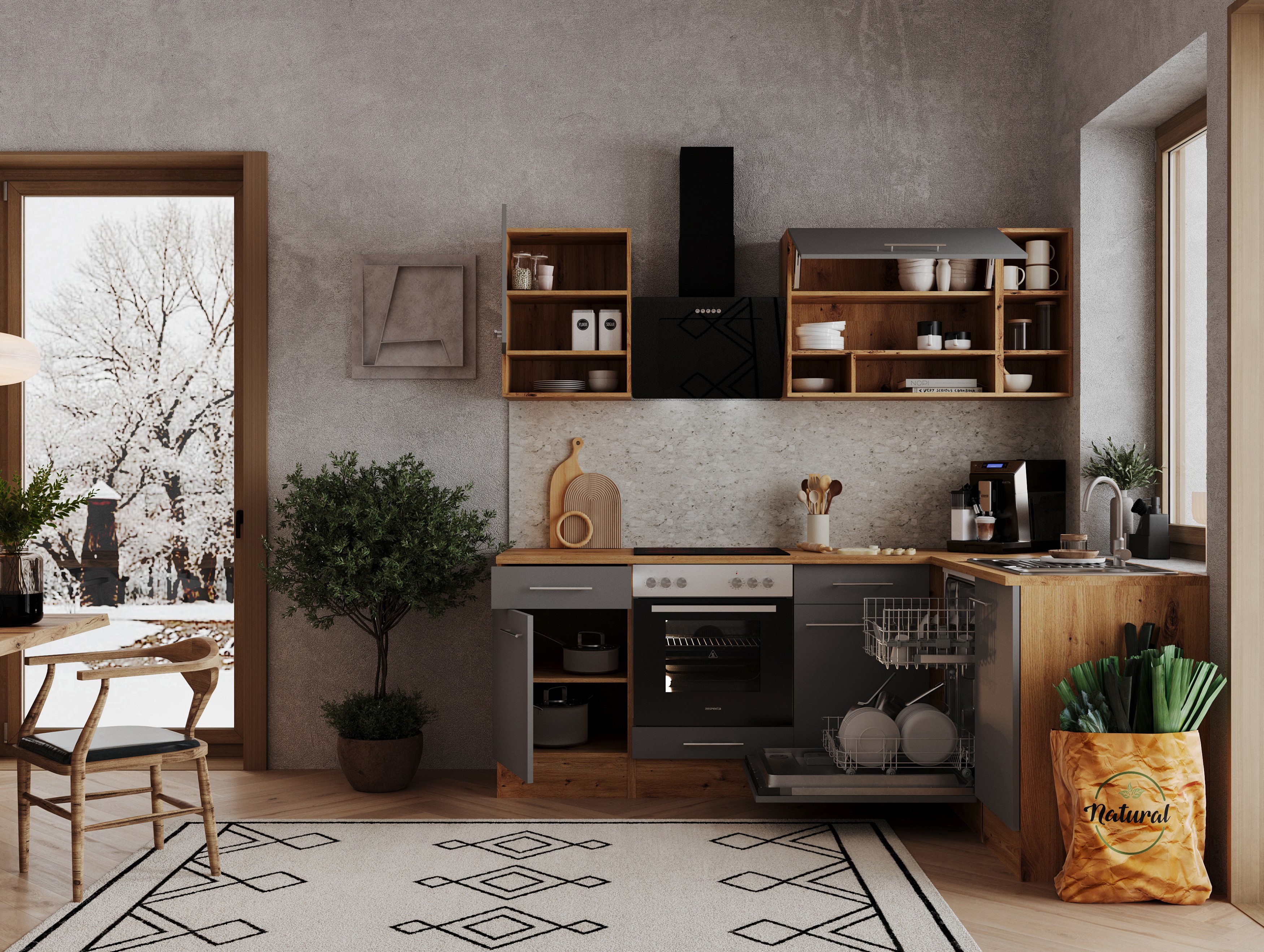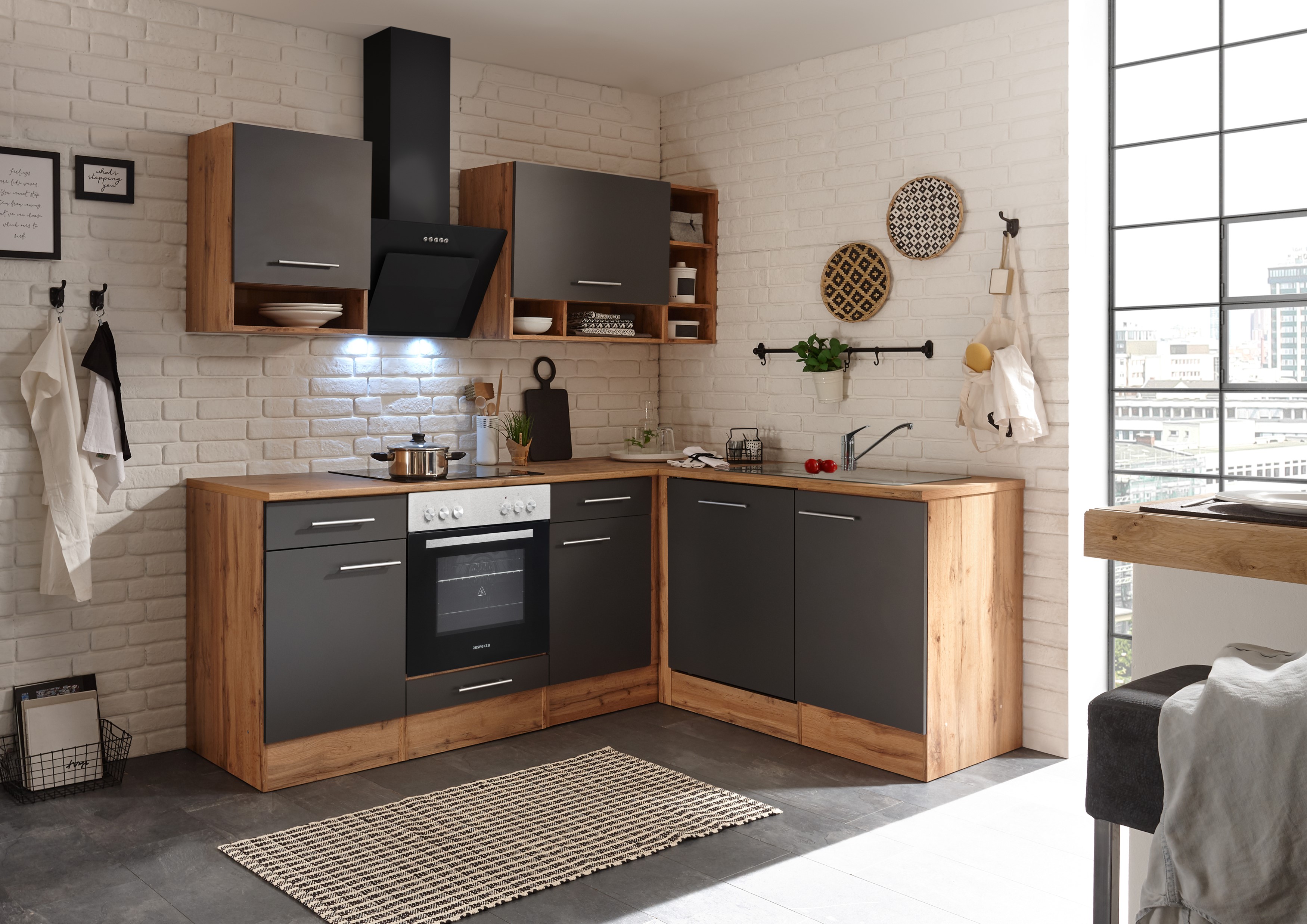 Eigenschaften "Küche Küchenzeile Leerblock Winkelküche Eiche Grau Hilde 220x172 cm Respekta"
