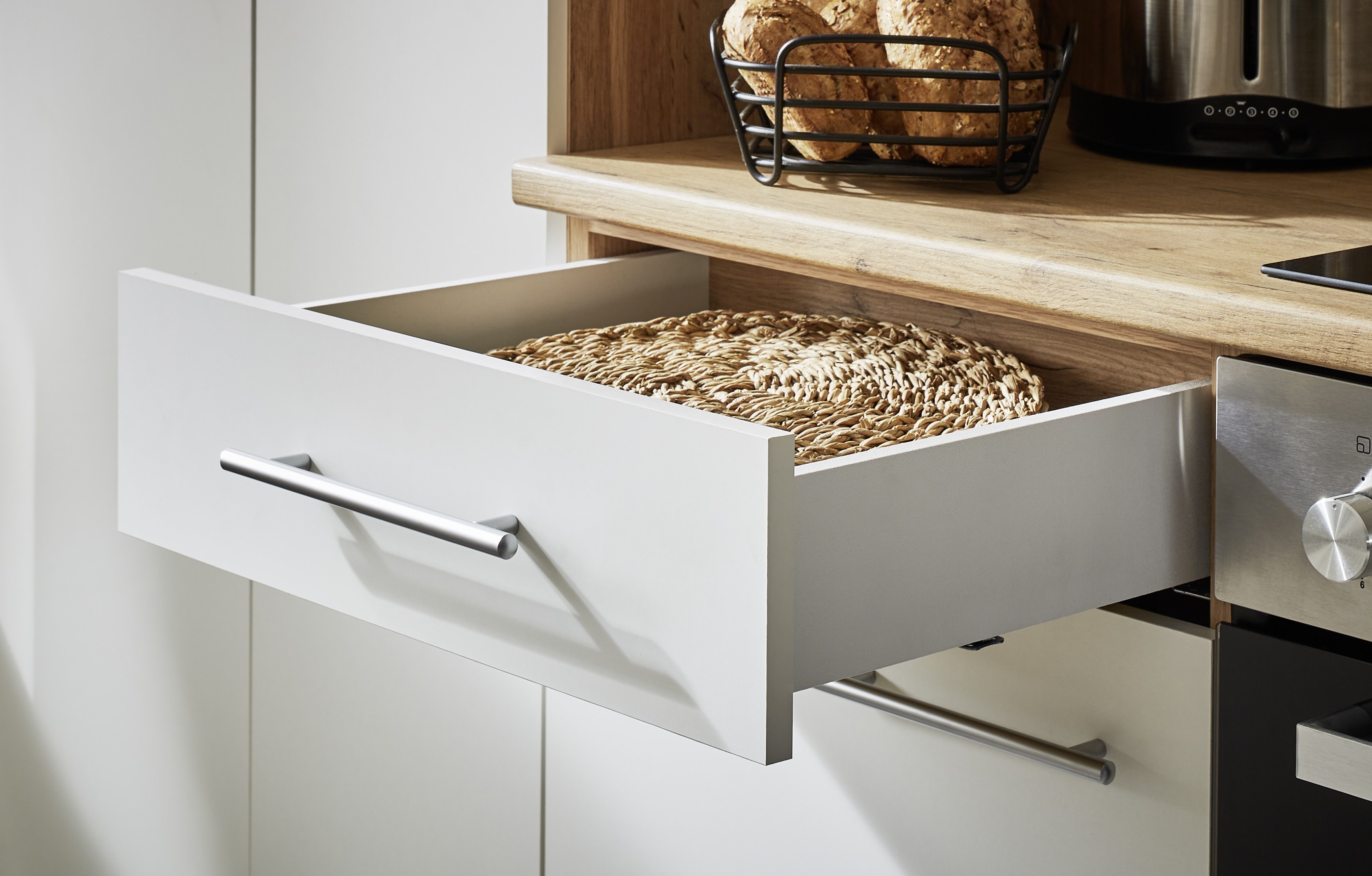 - Stangengriffe aus Metall: Die robusten Stangengriffe aus Metall verleihen der Küche einen modernen Touch und sorgen für eine angenehme Haptik und einfache Handhabung.