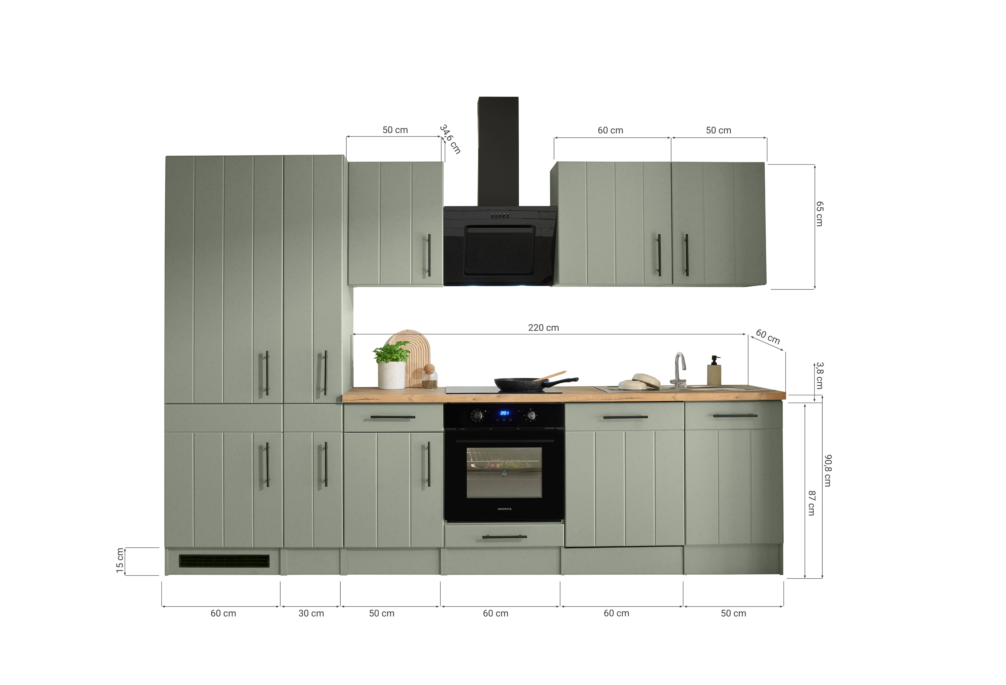 Küchenblock Anton – 310 cm Landhausküche in Schilfgrün mit Induktionskochfeld und Kühl-/Gefrierkombination 178 cm