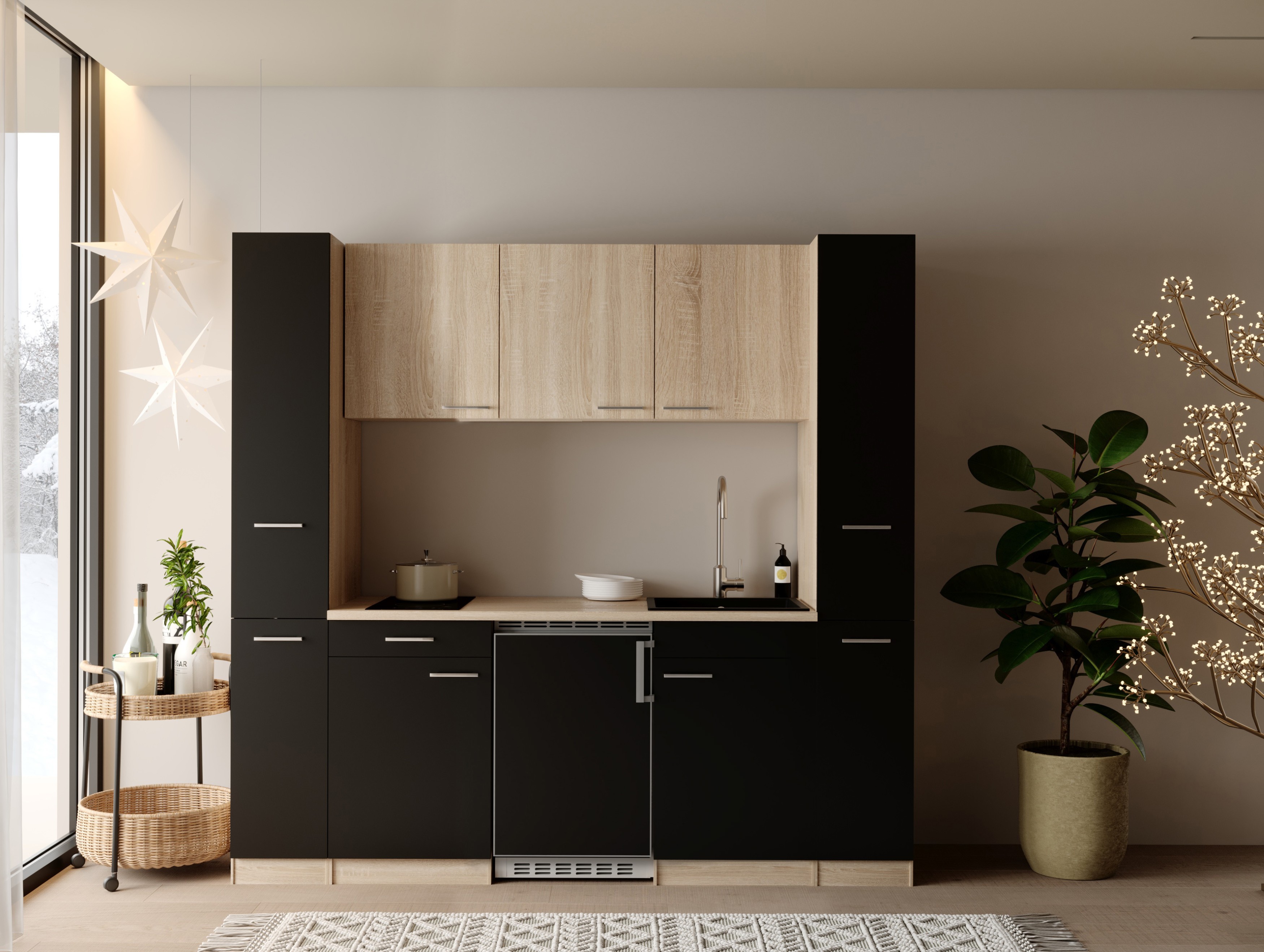 Die Singleküche Ingrid überzeugt mit einem modernen, klaren Design und funktionaler Ausstattung auf kompakter Fläche. Korpus, Arbeitsplatte und Oberschränke in Eiche Nordic Nachbildung sorgen für eine warme, natürliche Ausstrahlung, während die Fronten in Schwarz einen stilvollen Kontrast setzen.
