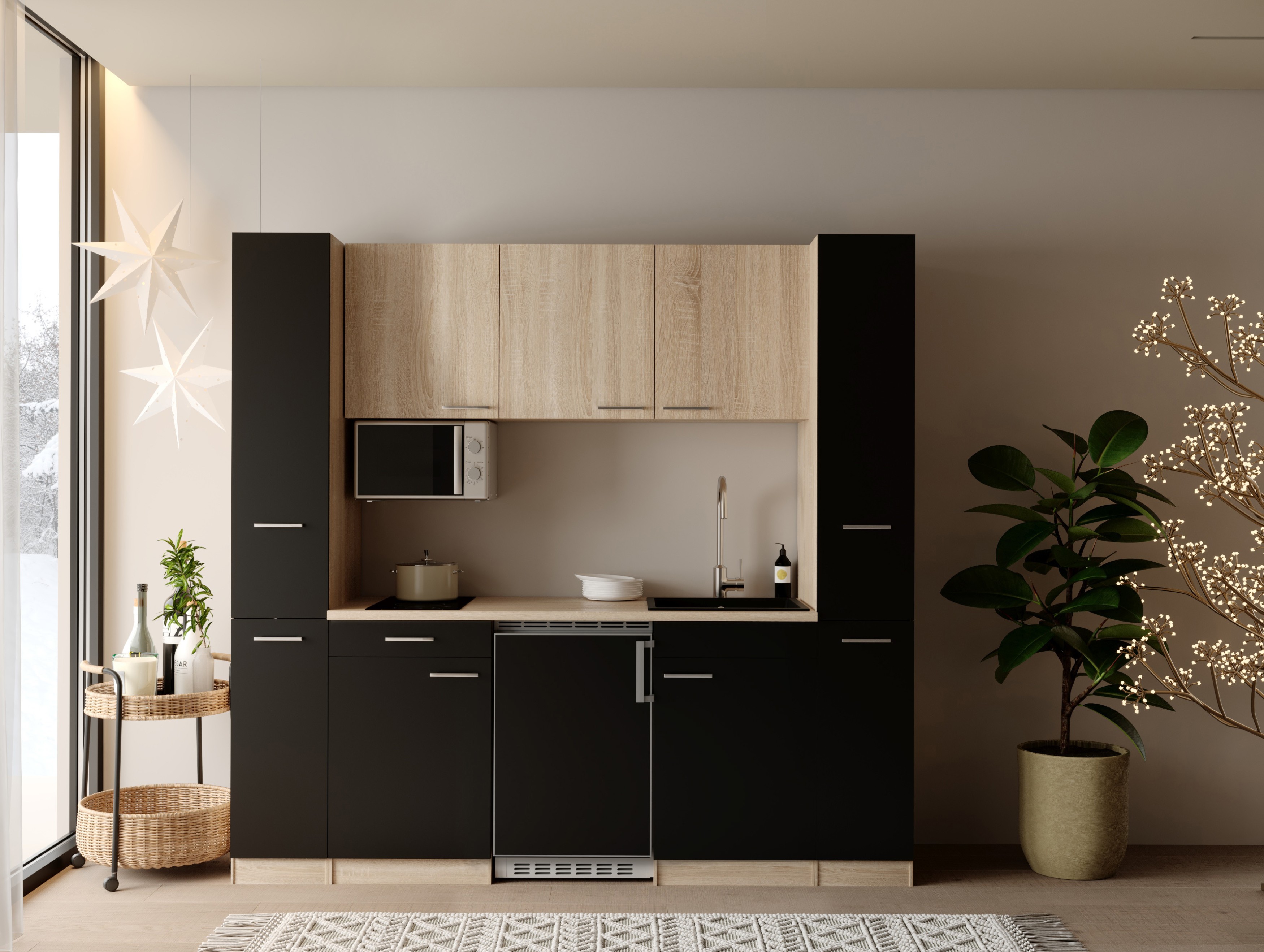 Die Singleküche Ingrid überzeugt mit einem modernen, klaren Design und funktionaler Ausstattung auf kompakter Fläche. Korpus, Arbeitsplatte und Oberschränke in Eiche Nordic Nachbildung sorgen für eine warme, natürliche Ausstrahlung, während die Fronten in Schwarz einen stilvollen Kontrast setzen.