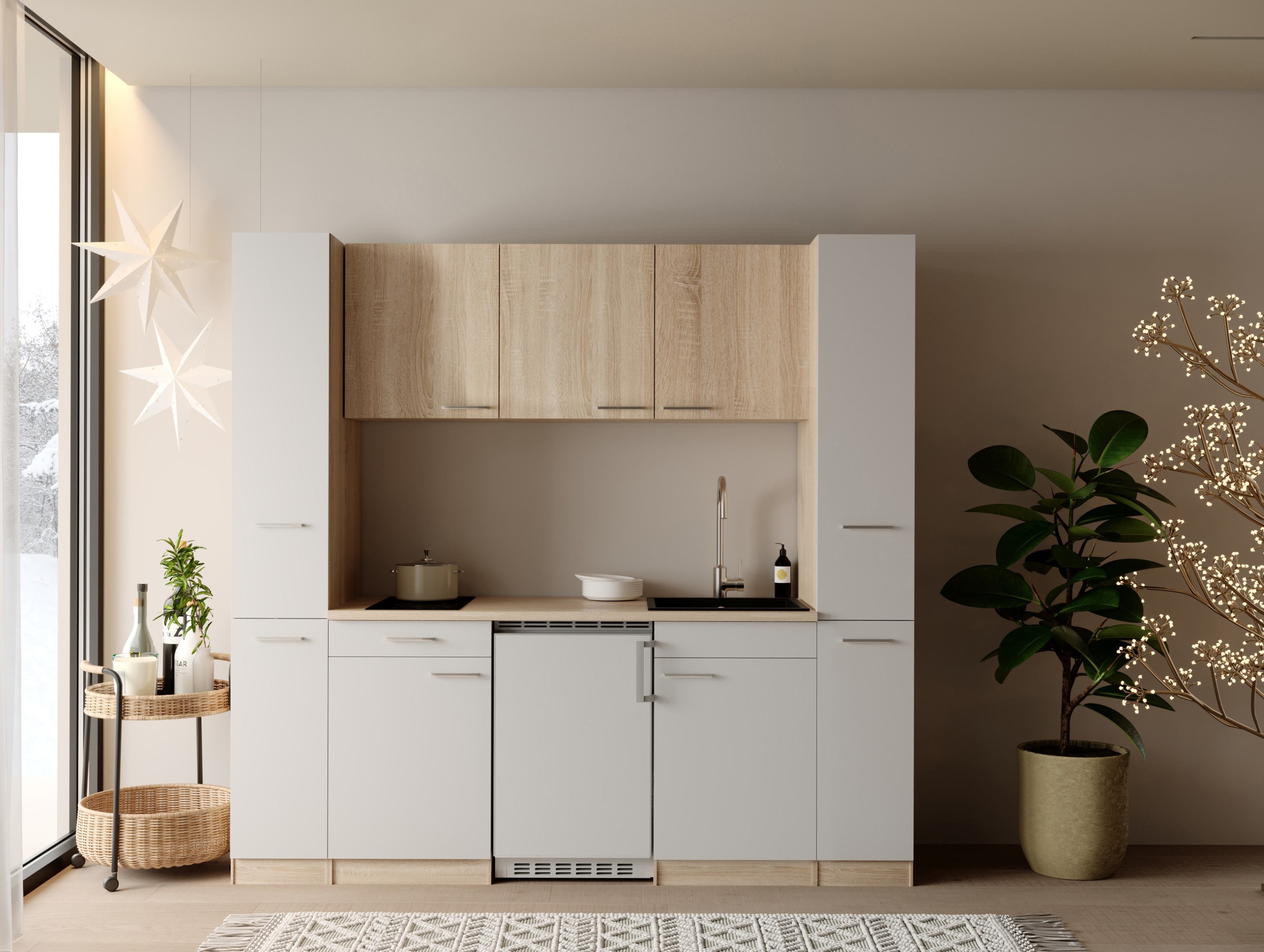 Singleküche Ingrid – 210 cm kompakte Komplettküche in Eiche Nordic mit Glaskeramikkochfeld und Kühlschrank