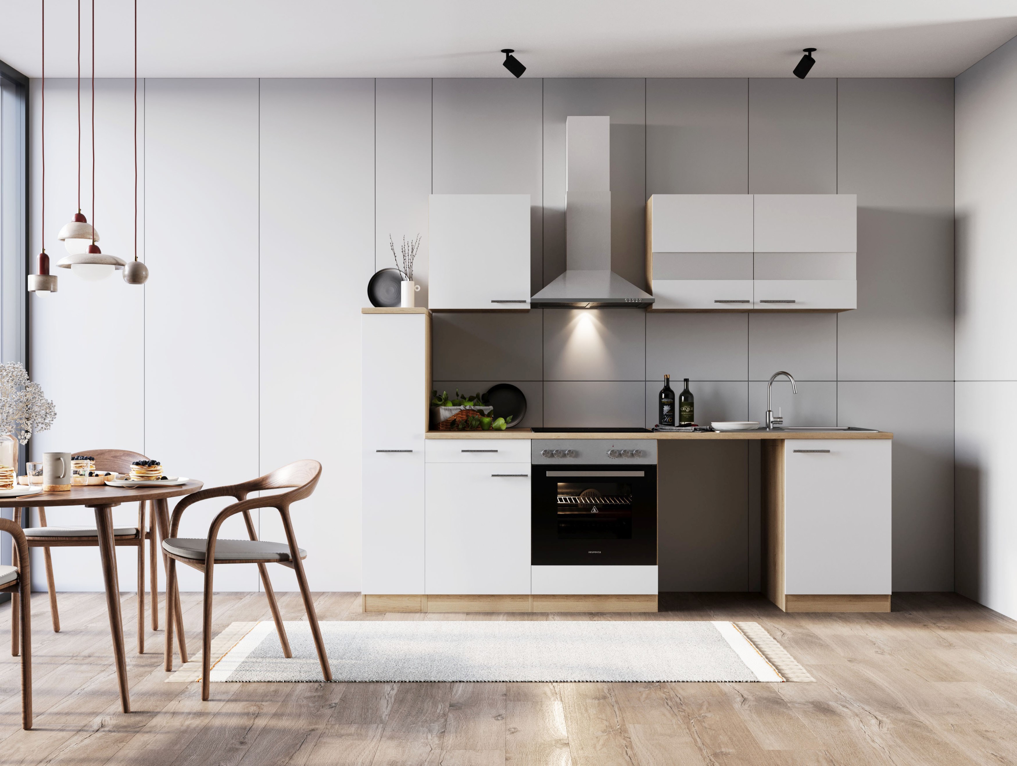 - Material: Korpus und Arbeitsplatte in Eiche Sägerau Nachbildung , Fronten in Weiß, Grau und Schwarz erhältlich