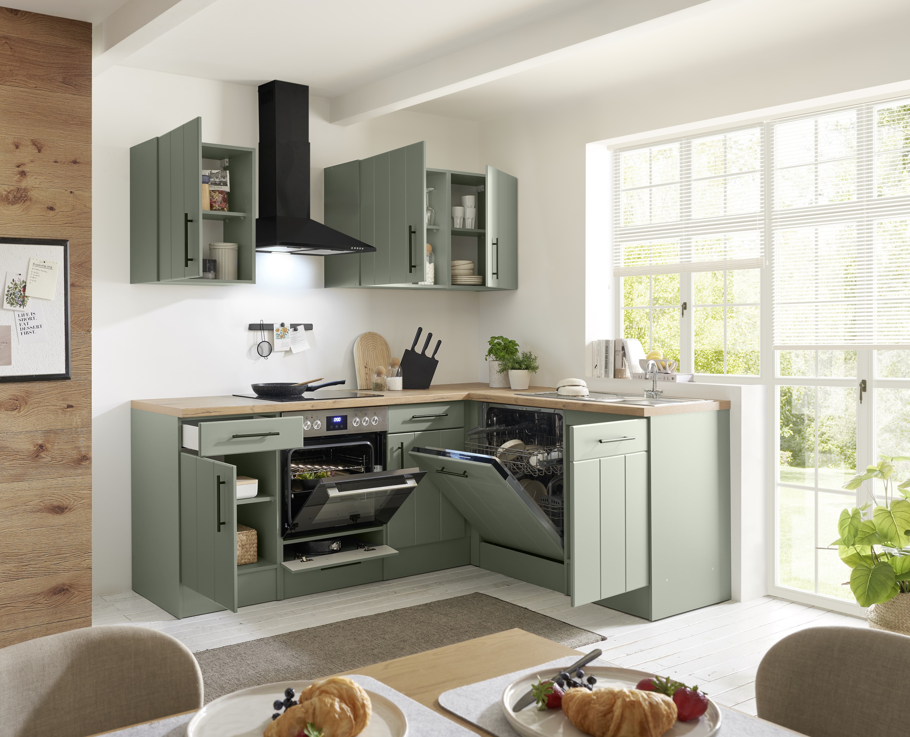 Die Premium Landhaus-Winkelküche Anton kombiniert zeitloses Landhausdesign mit moderner Ausstattung. Korpus und Fronten in mattem Schilfgrün treffen auf eine Arbeitsplatte in Wildeiche-Nachbildung, ergänzt durch elegante mattschwarze Metallgriffe – ein harmonischer Look mit warmen Naturakzenten.